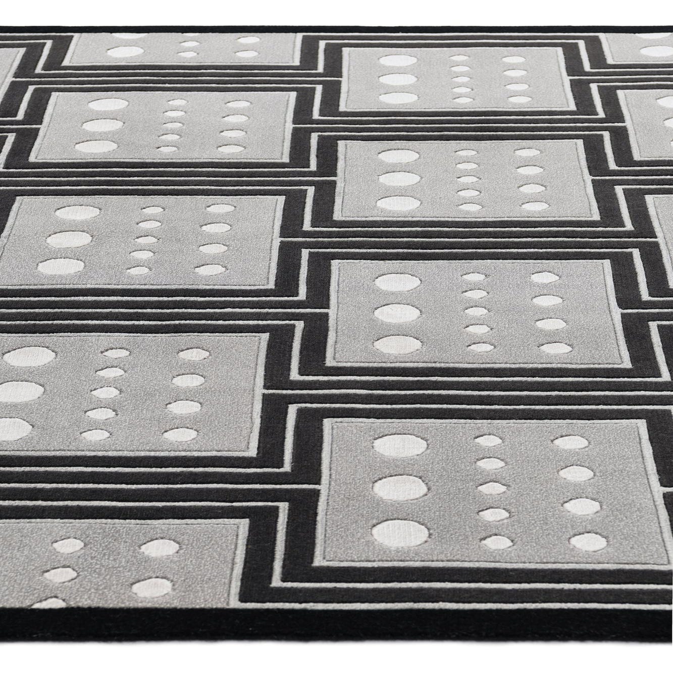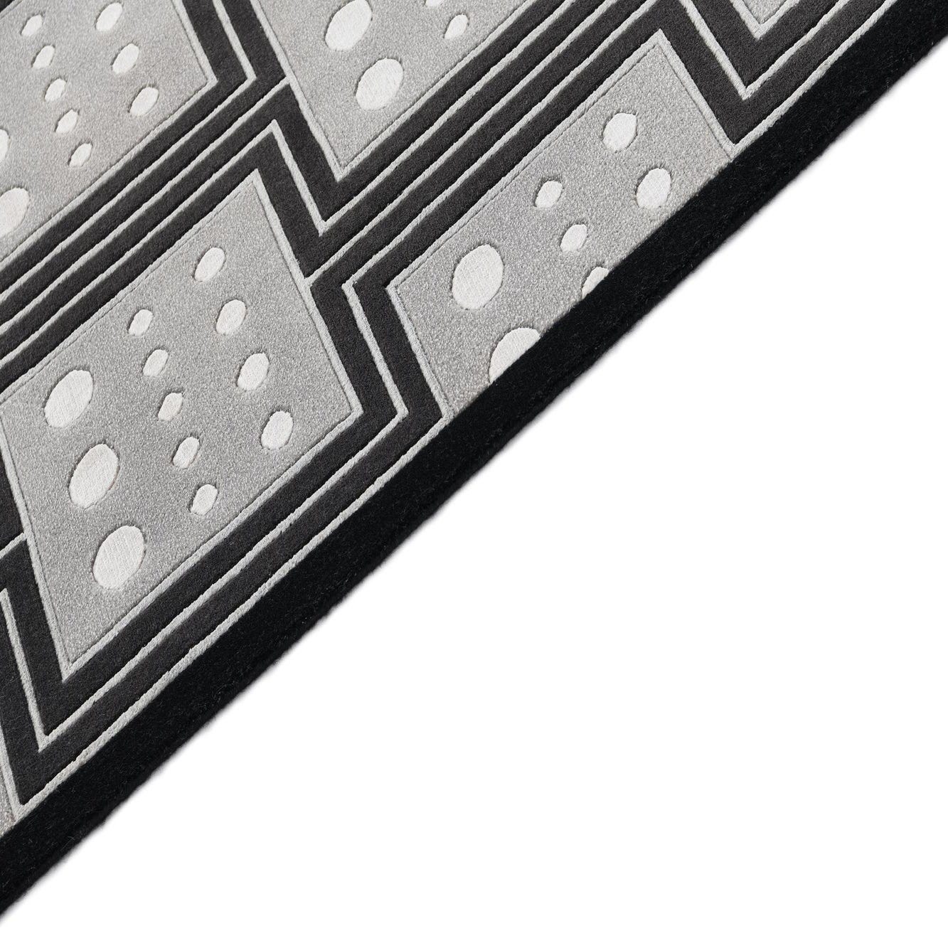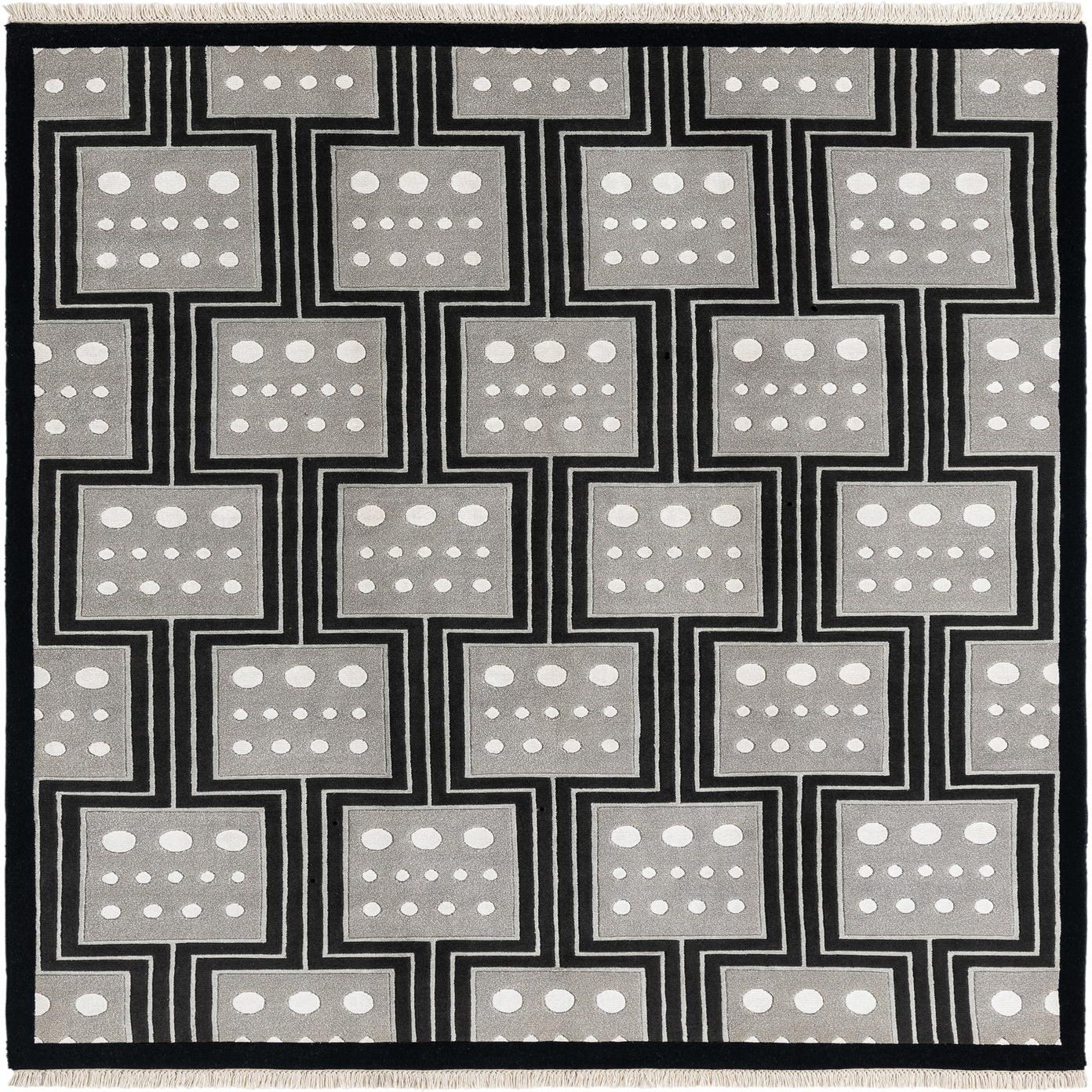 Primary color is Black. Colors in this rug include: Black, Beige, Gray, Silver.