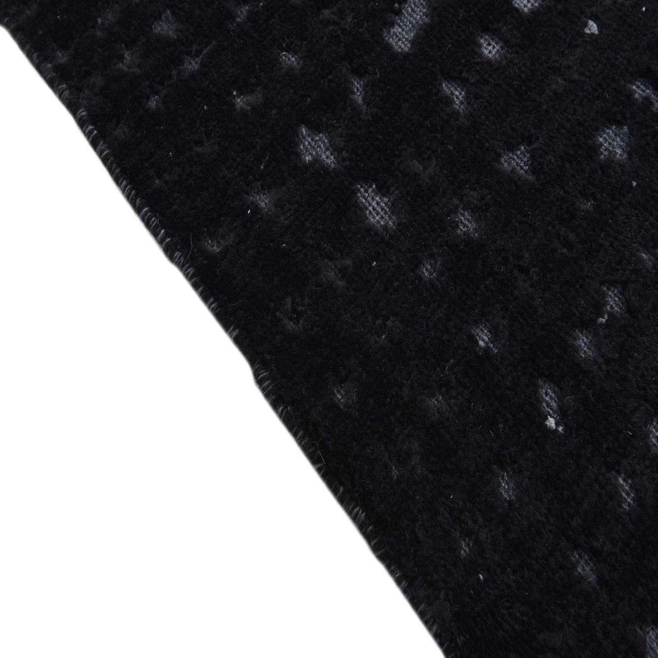The Darya collection presents a 5x8 foot rug hand-knotted from 100% wool, offering a tactile experience that emphasizes quality craftsmanship. The rug's deep black background is accented by a nuanced gray pattern, together creating a visual texture that echoes a contemporary design aesthetic. Its surface showcases a subtle, pixelated-like motif that can serve as a sophisticated foundation for a variety of interior settings.