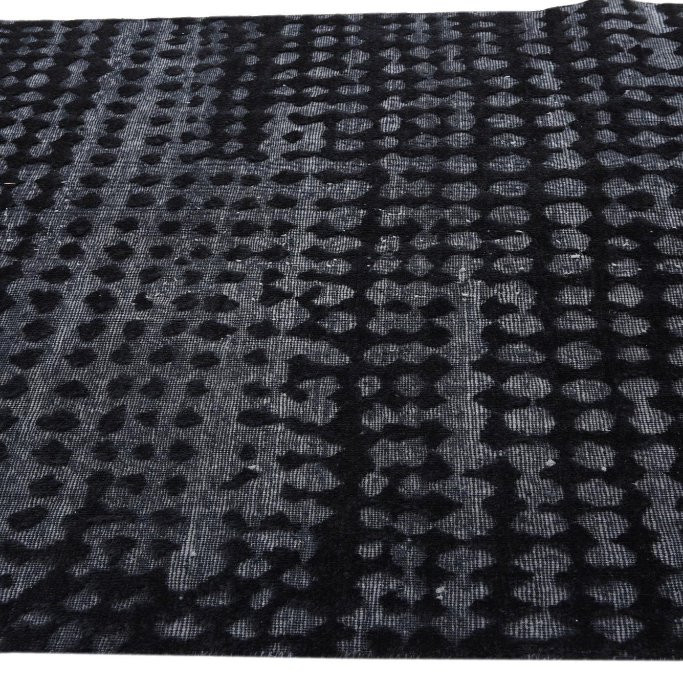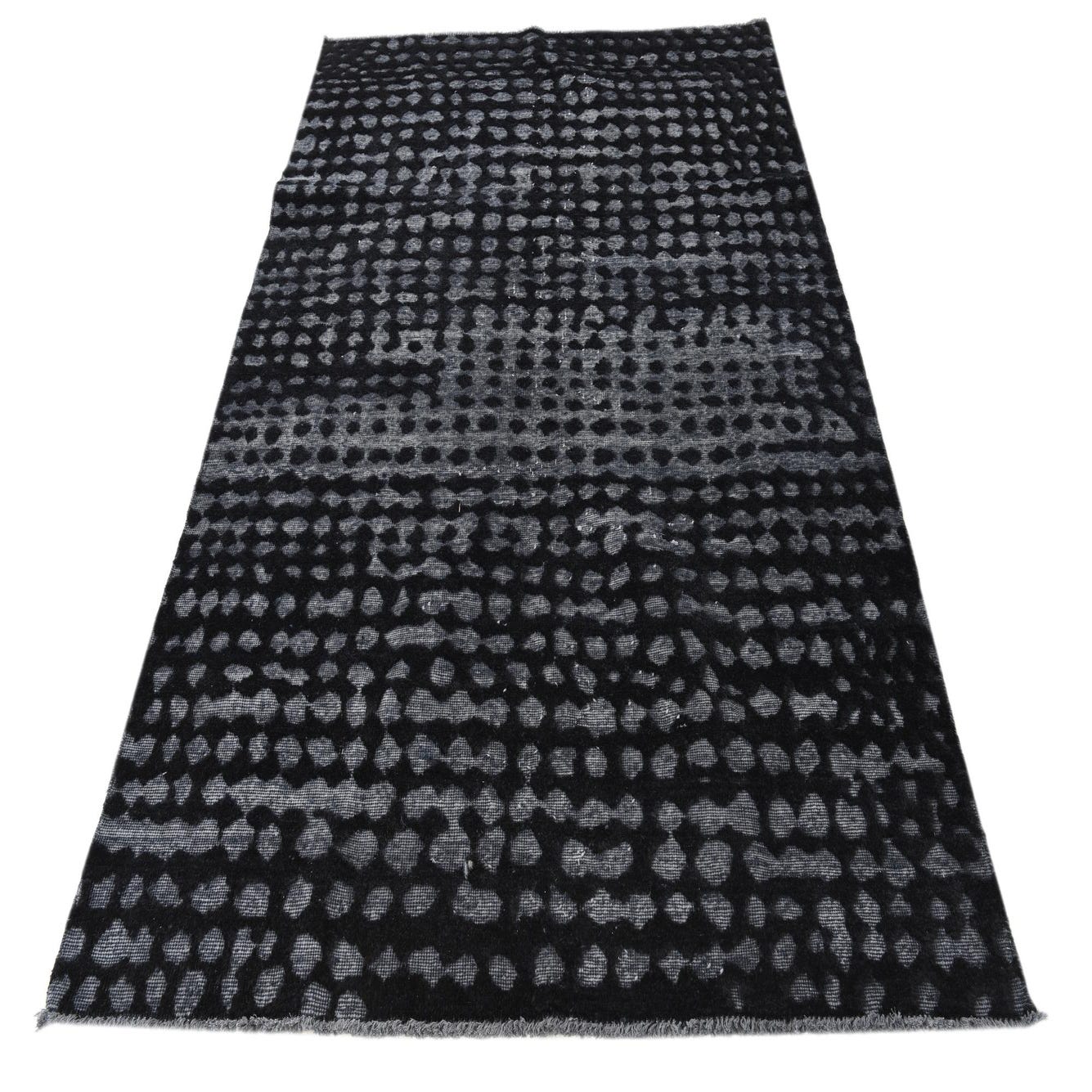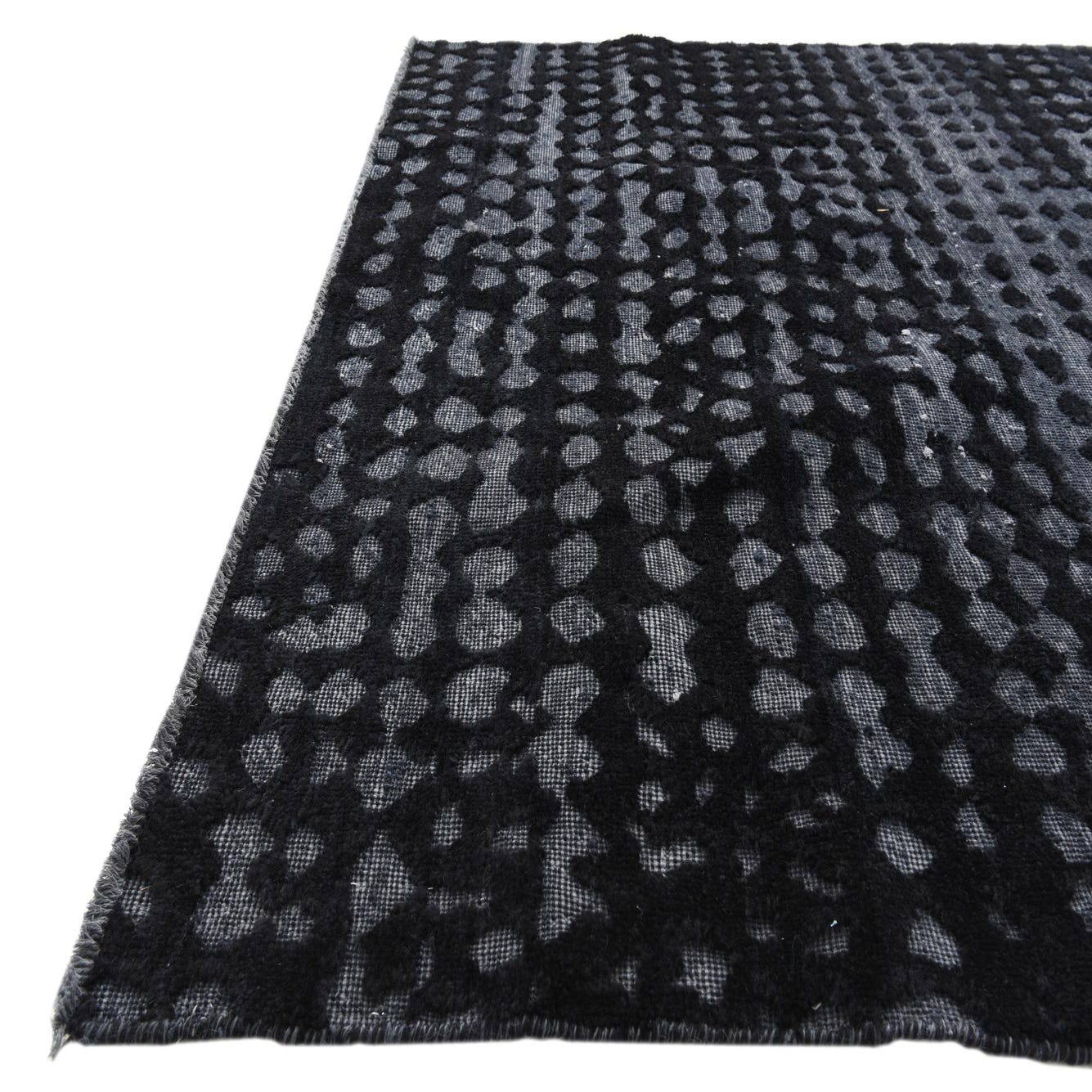 Hand-knotted from 100% wool, this rug presents a modern, abstract dotted pattern in gray set against a deep black ground. The design arranges rounded dots and short linear marks into an irregular grid, creating visual movement without a strict repeat. The hand-knotted construction produces a tactile surface with a grounded, slightly plush pile and subtle variations in height and sheen that you can both see and feel underfoot.