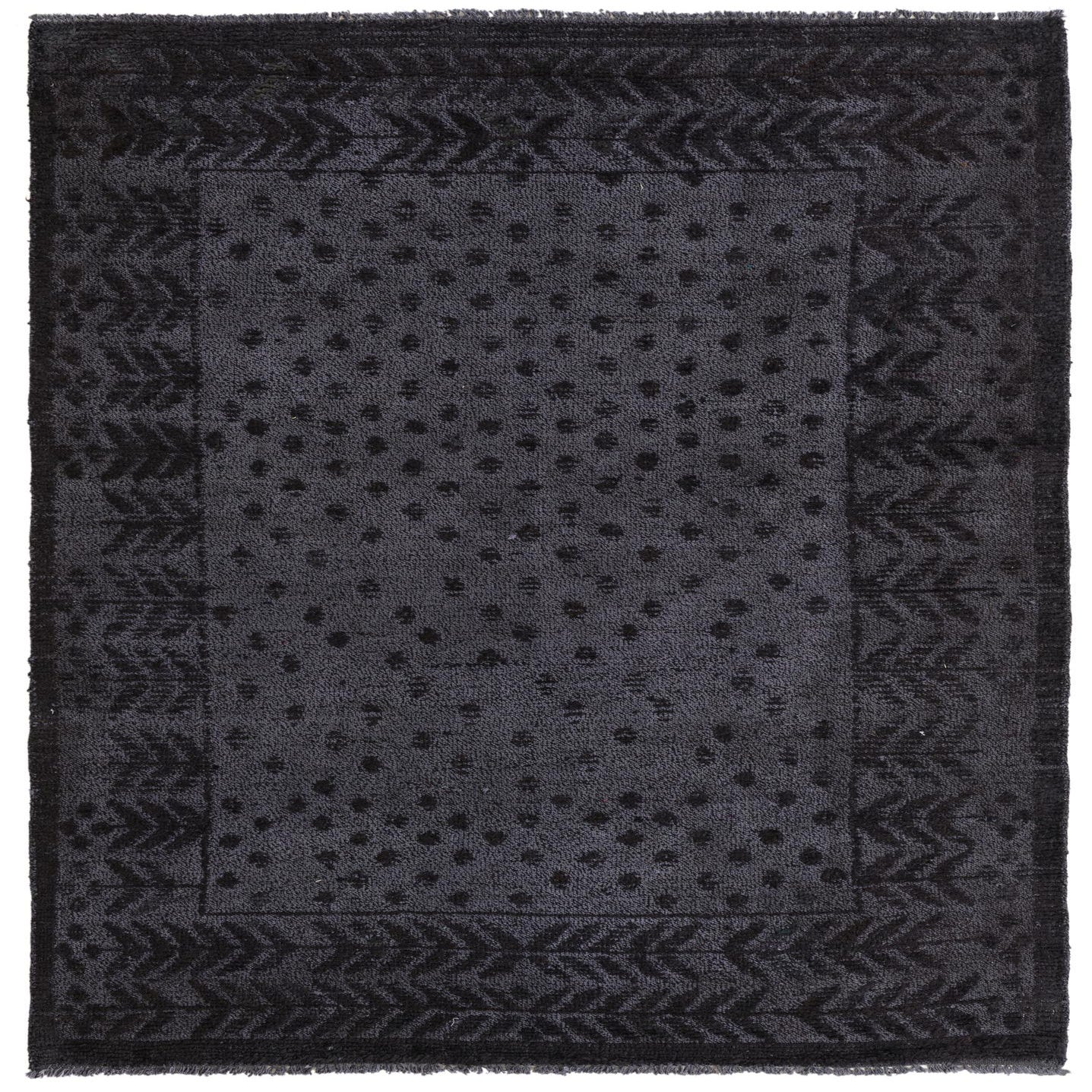 A 5x8 rectangular black wool rug with a modern abstract pattern of subtle polka dots and a geometric border.