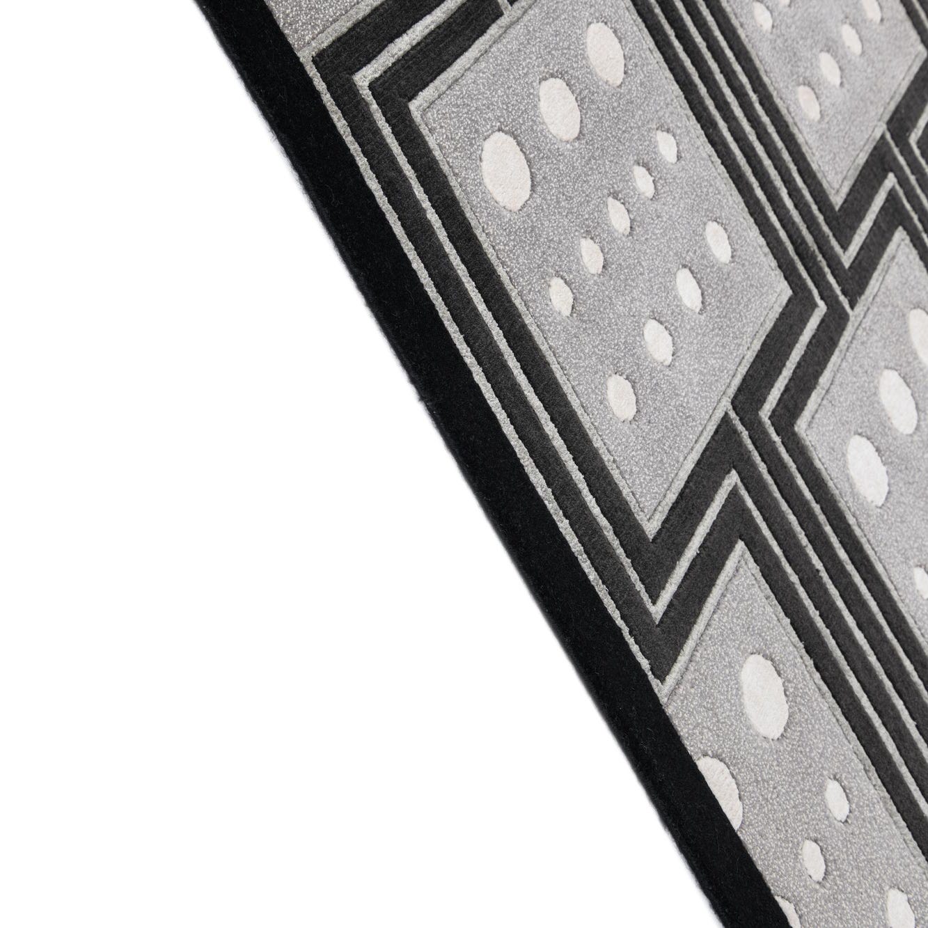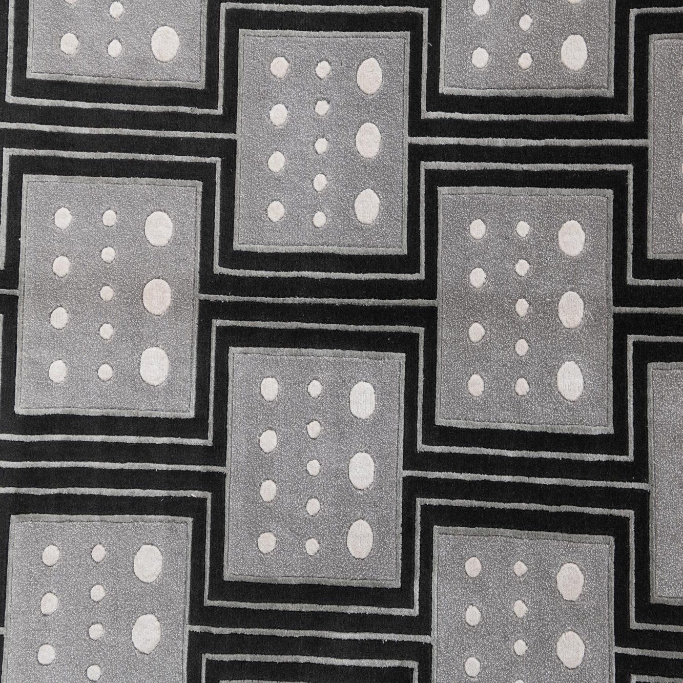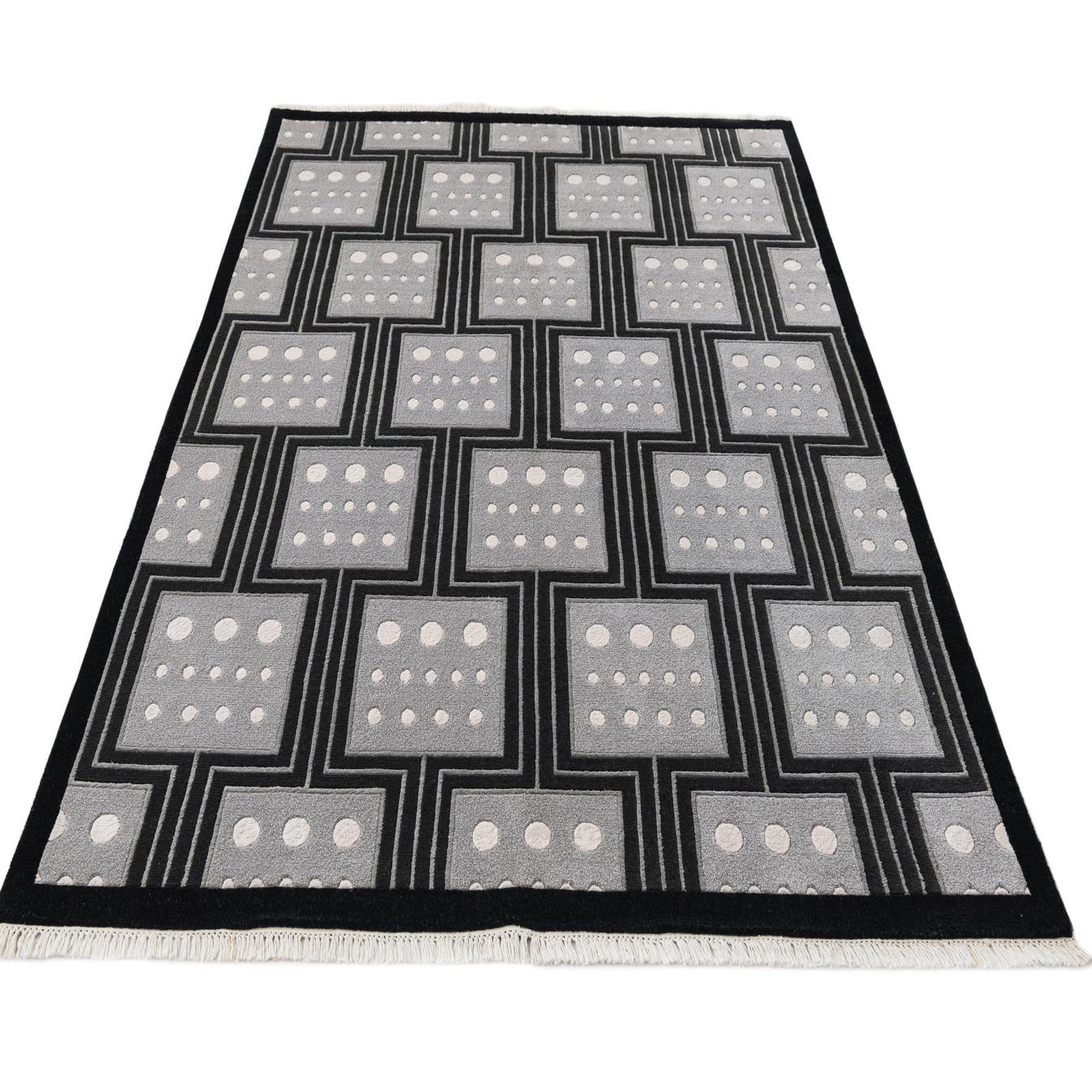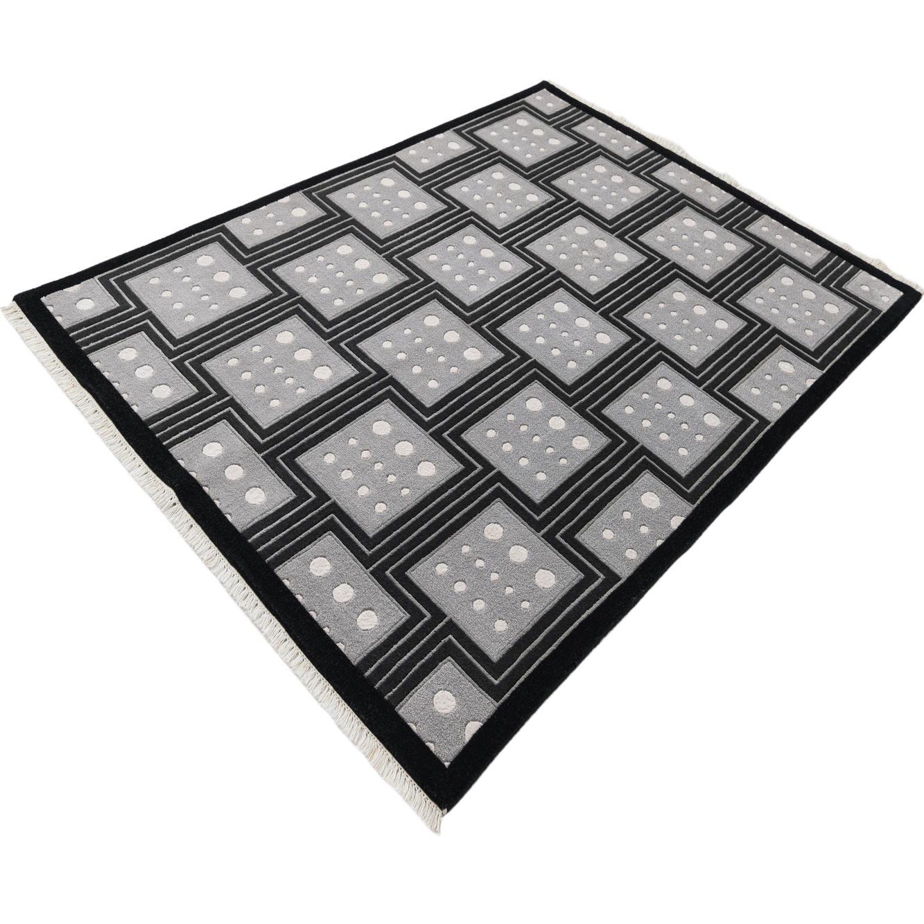 A 5x8 rectangular Darya rug with a modern black and gray geometric pattern, featuring white dots within squares.