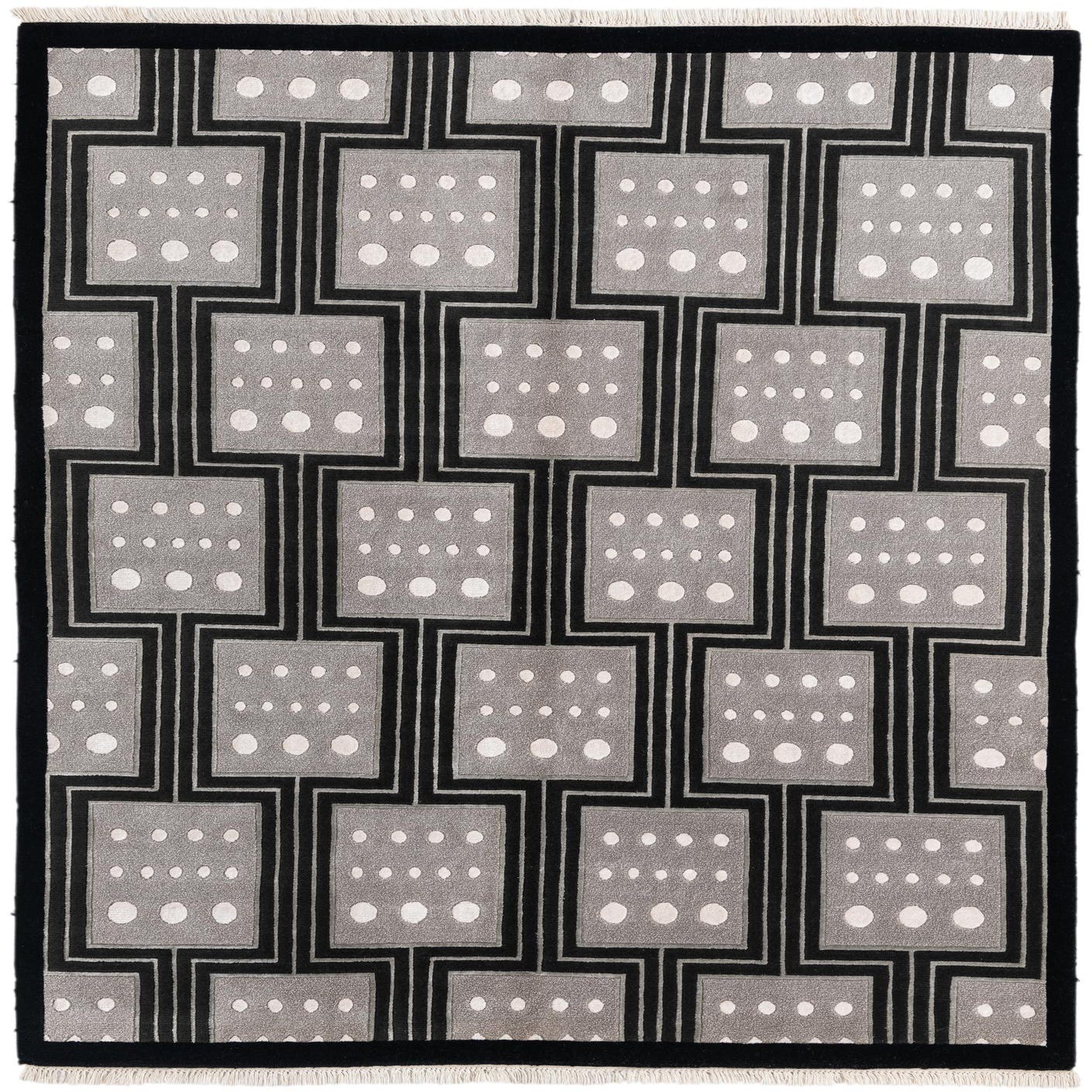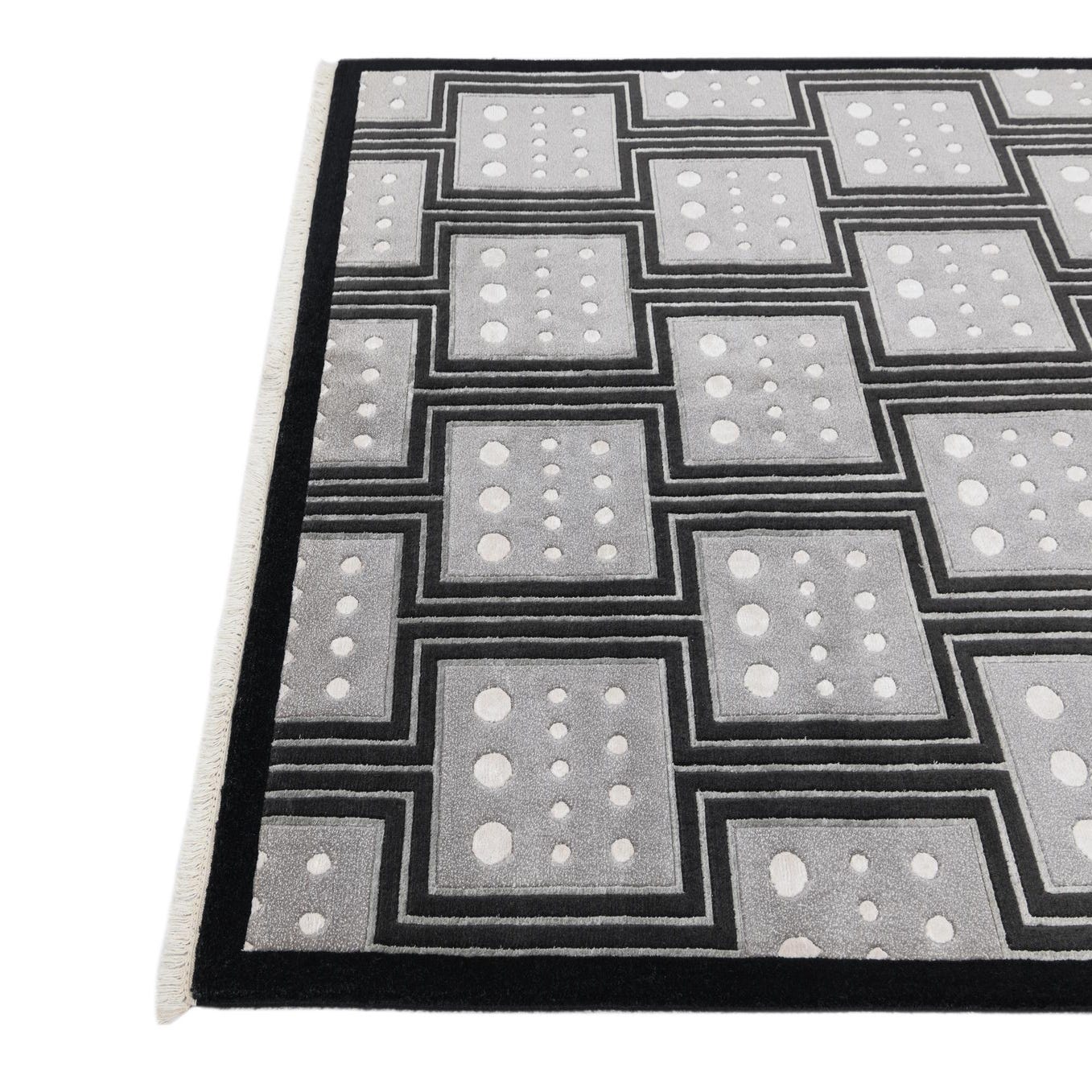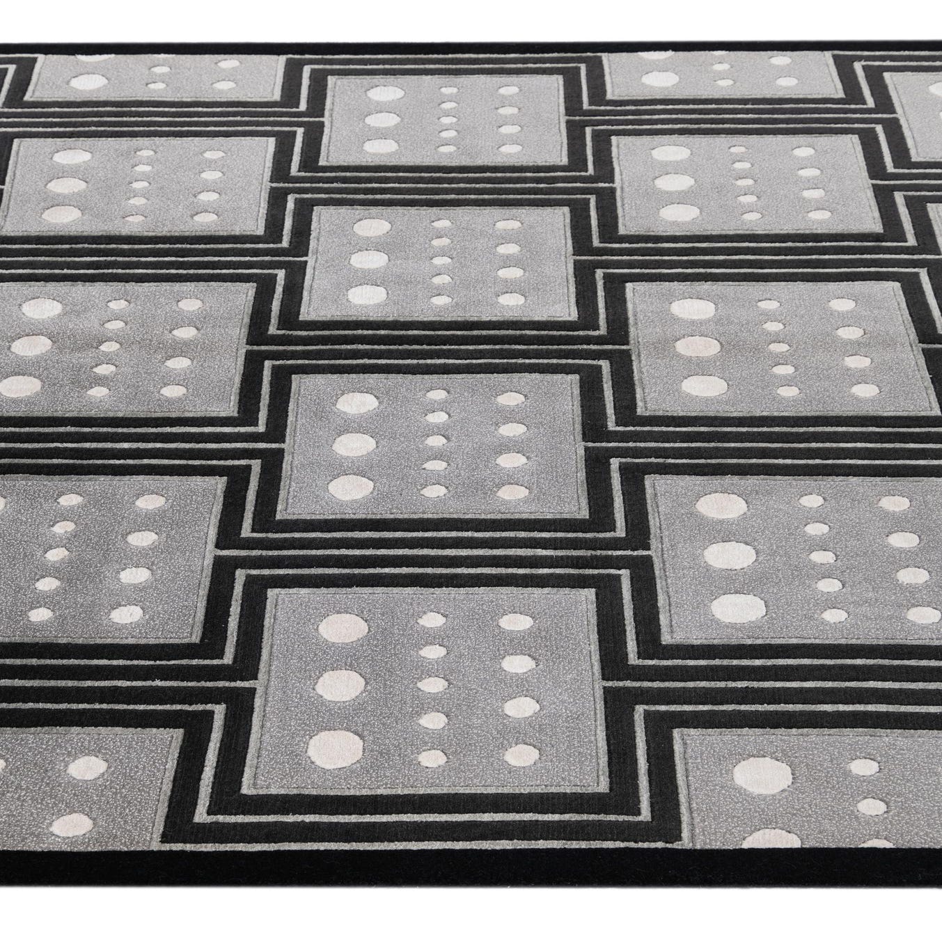The Darya collection presents a hand-knotted rug of 100% wool, encompassing a timeless design rooted in geometric appeal. This 5x8 rug features a striking black background contrasted with a compelling pattern of interconnected boxes outlined in gray, each hosting an arrangement of ivory dots at their center. The distinctive pattern lends a structured and bold visual interest to any floor space, while the neutral color palette ensures versatility within a range of interior styles.
