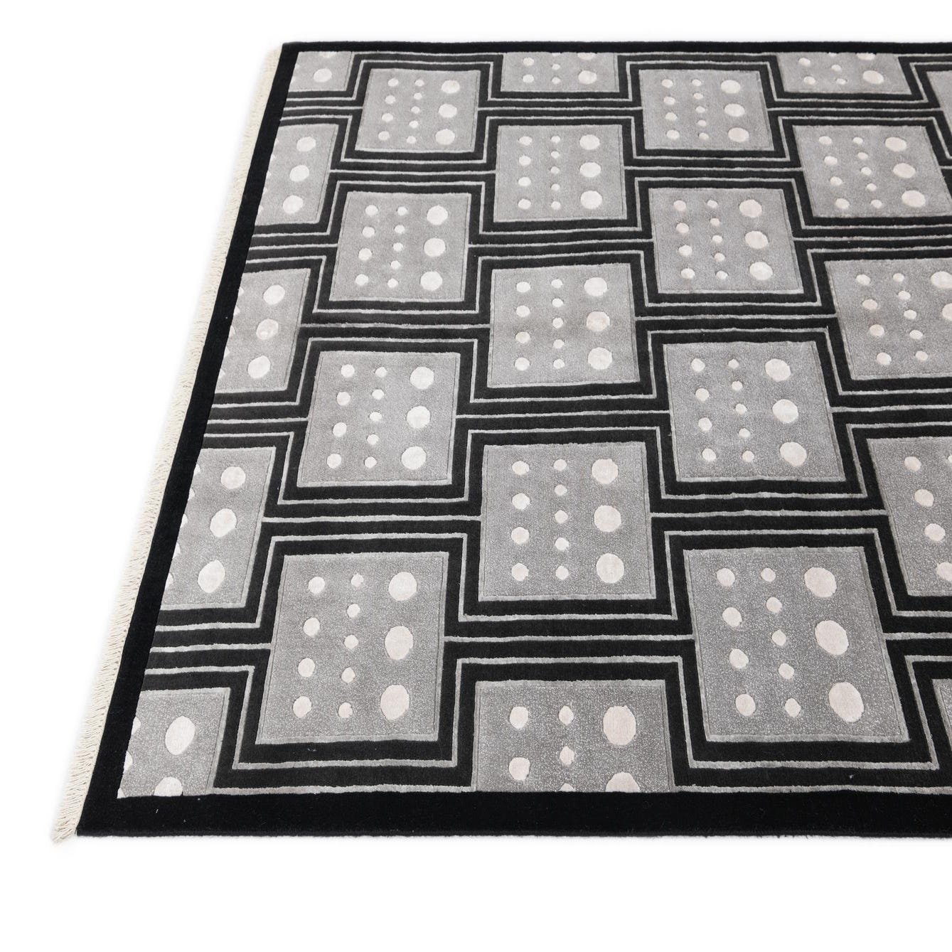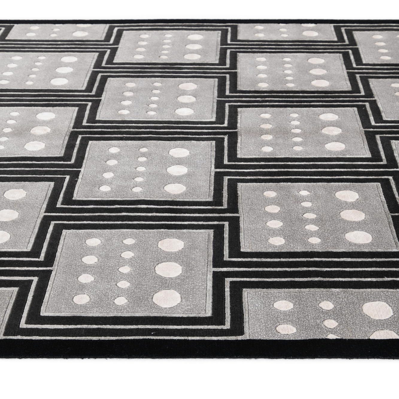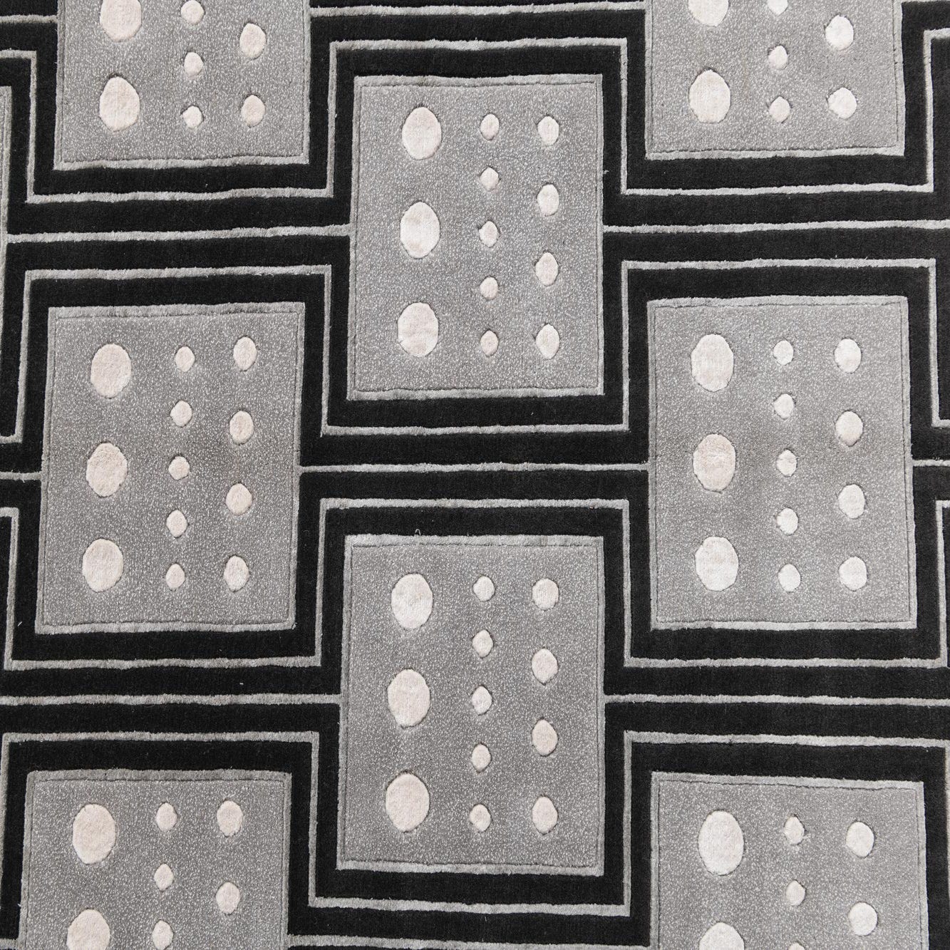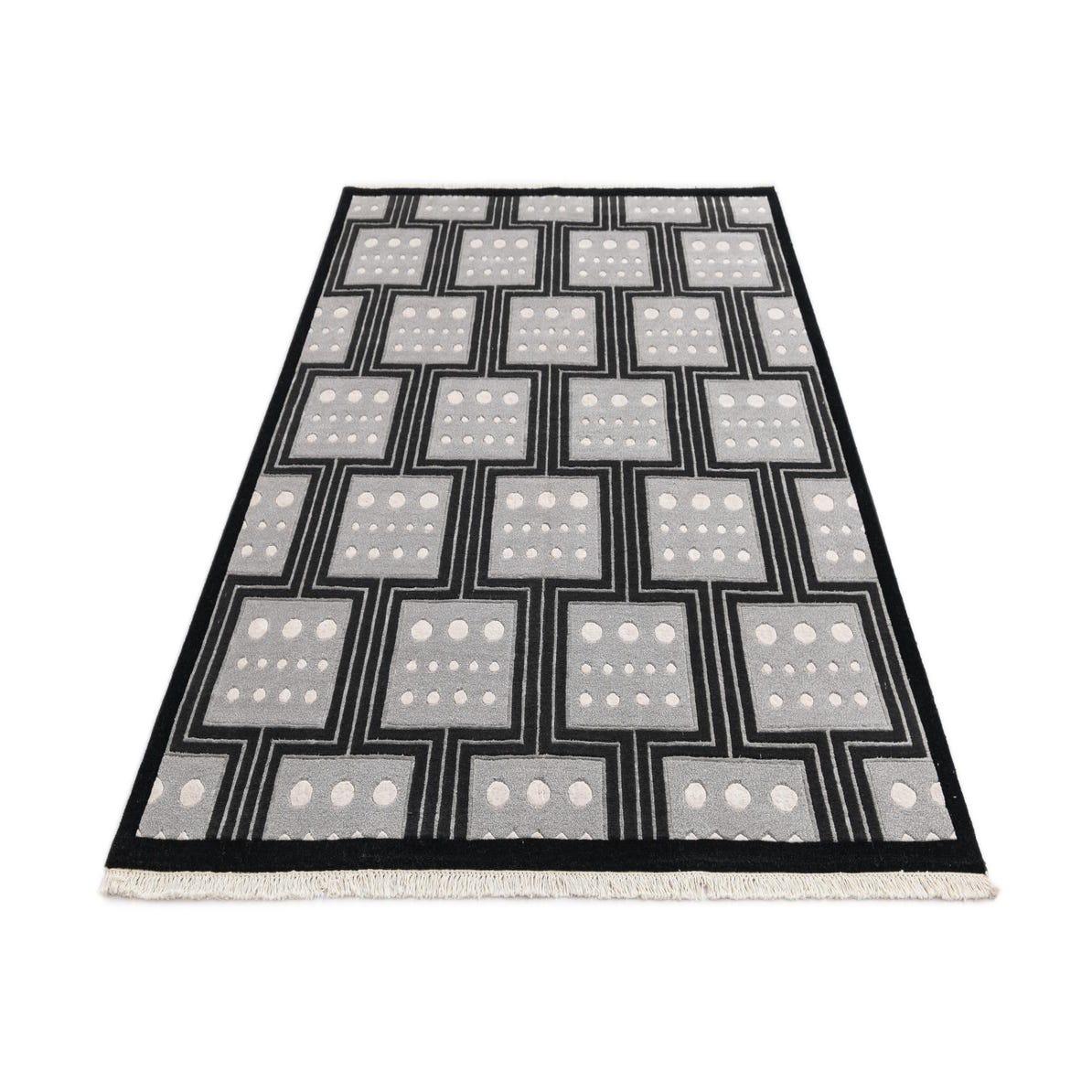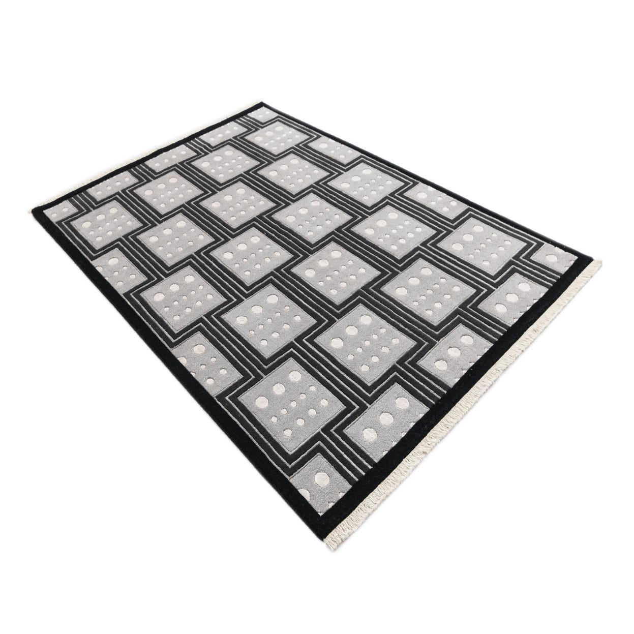 A 5x8 rectangular Darya rug with a modern black and gray geometric pattern featuring white polka dots.