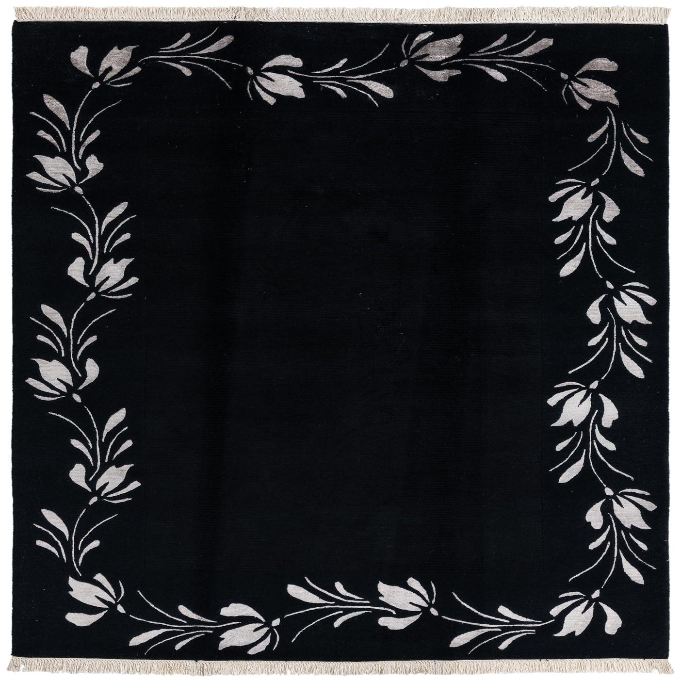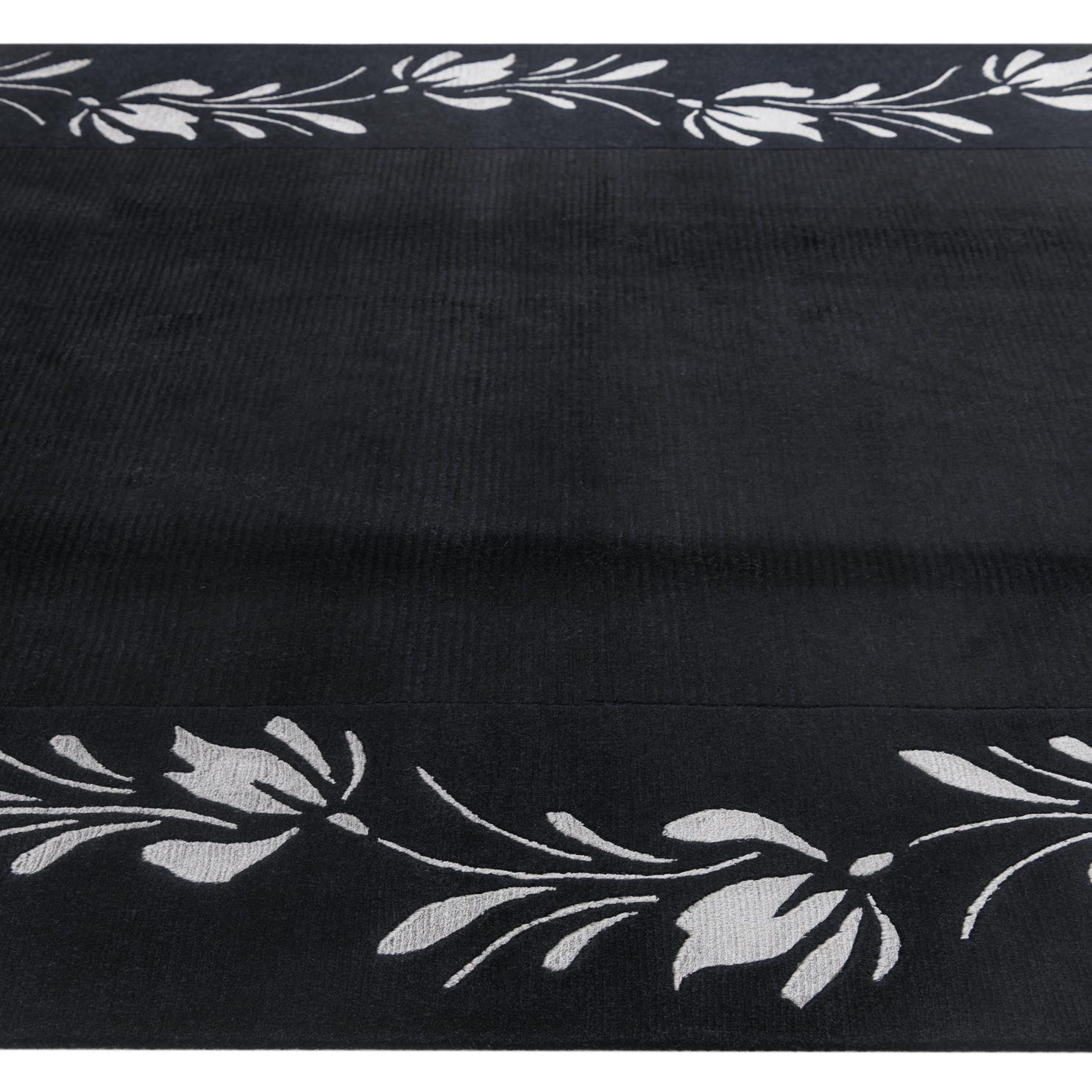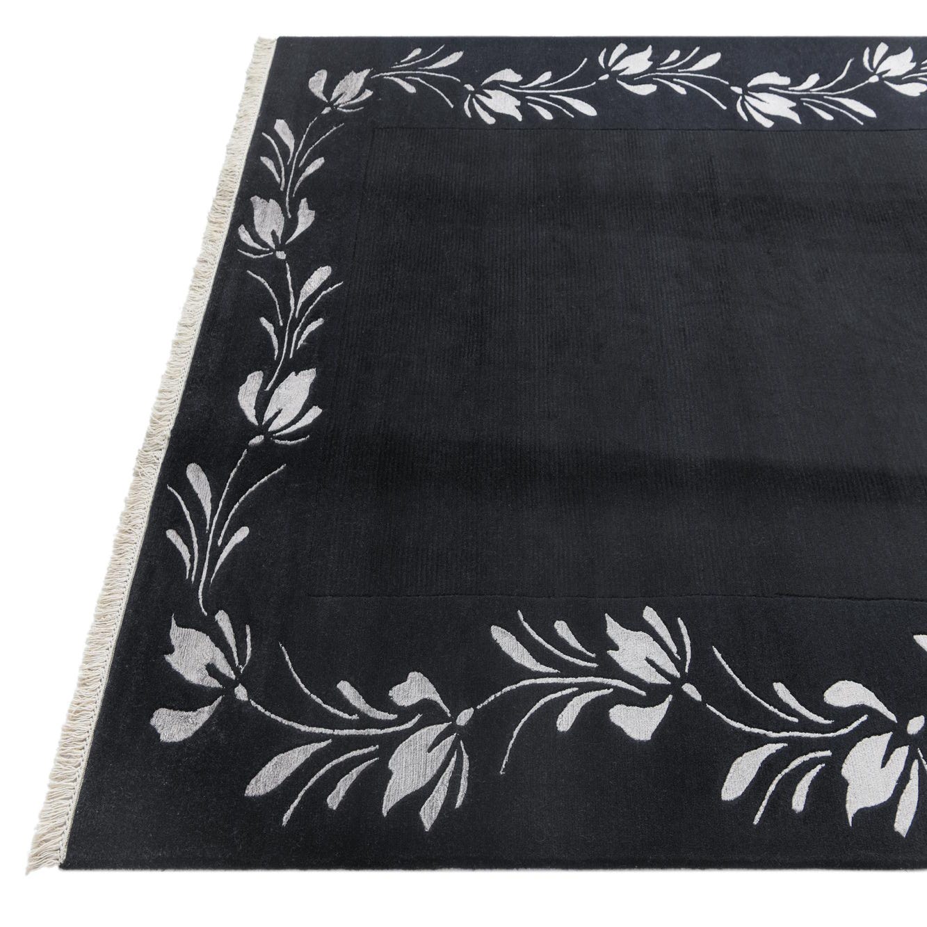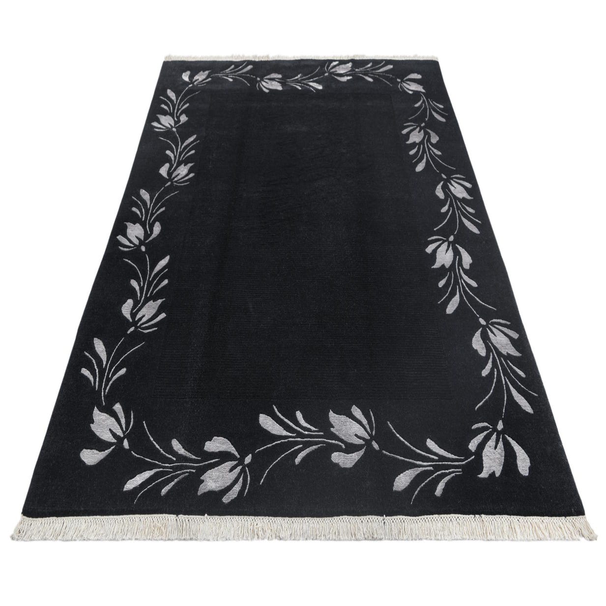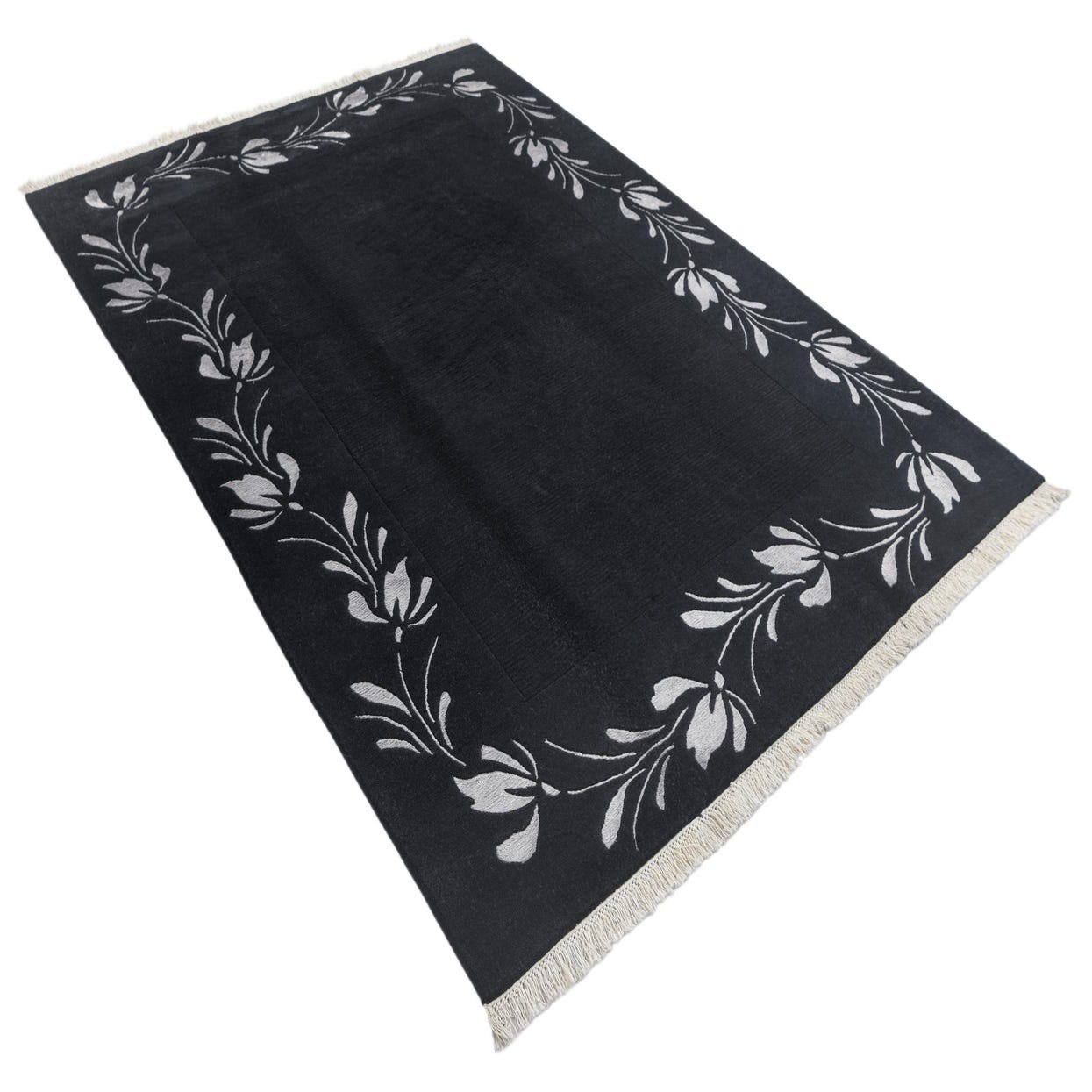 A 5x8 rectangular black wool area rug with a modern oriental style, featuring a light floral border pattern and short fringe.