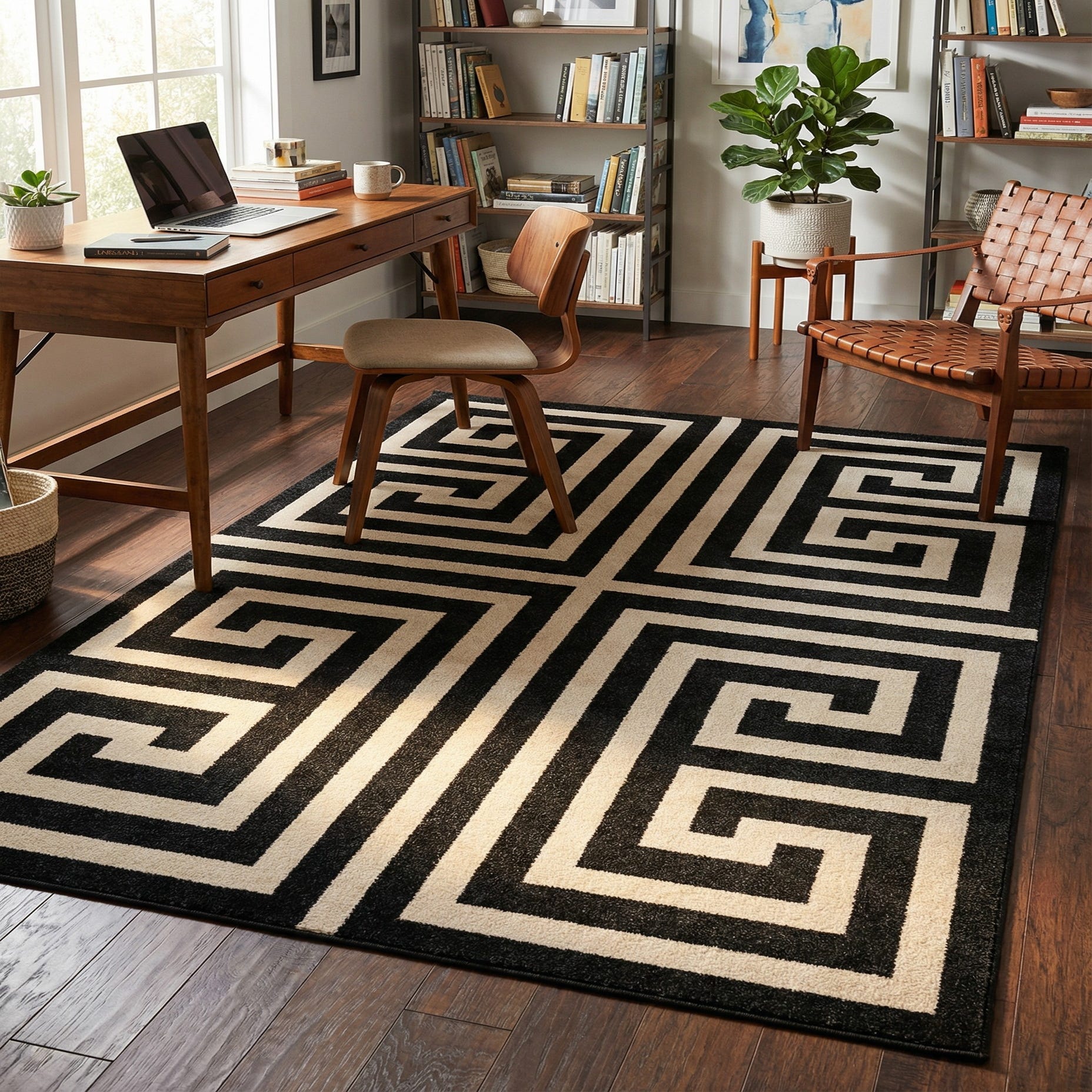 This rug works well where you want a defined focal point: set it beneath a streamlined sofa to anchor a contemporary living room, place it in a home office to add visual structure, or use it to delineate a dining area in an open floor plan. The monochrome palette pairs naturally with warm wood tones, matte metals, and soft neutrals, and it complements minimalist, mid-century modern, and Art Deco-inspired interiors.
