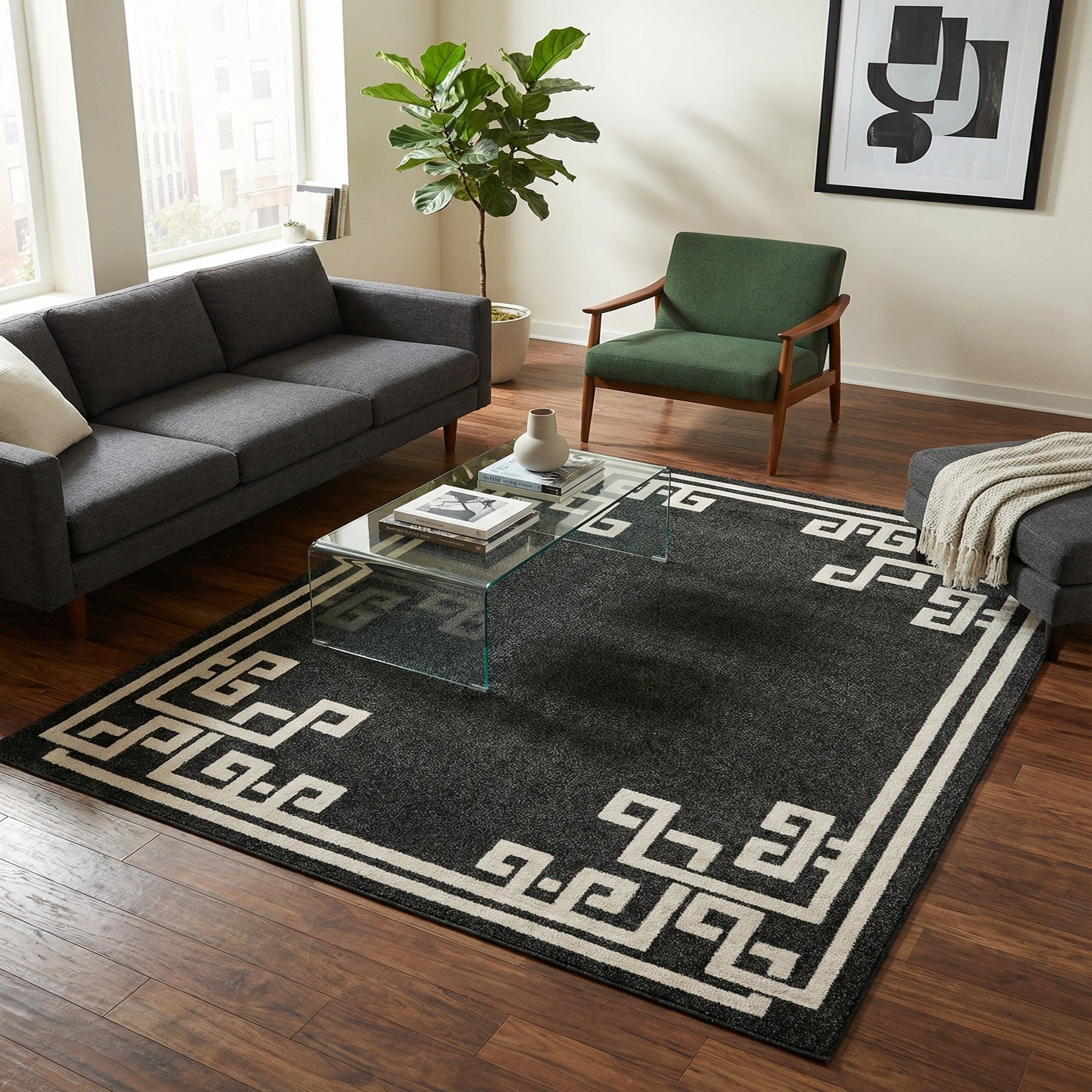 This rug works well in modern, transitional, or art deco–influenced spaces. Use it to anchor a living room seating area, line a hallway, or add structure under a desk in a home office. Pair with warm wood furniture, brass or matte black metal accents, and neutral upholstery to balance the dark ground and let the beige border stand out.