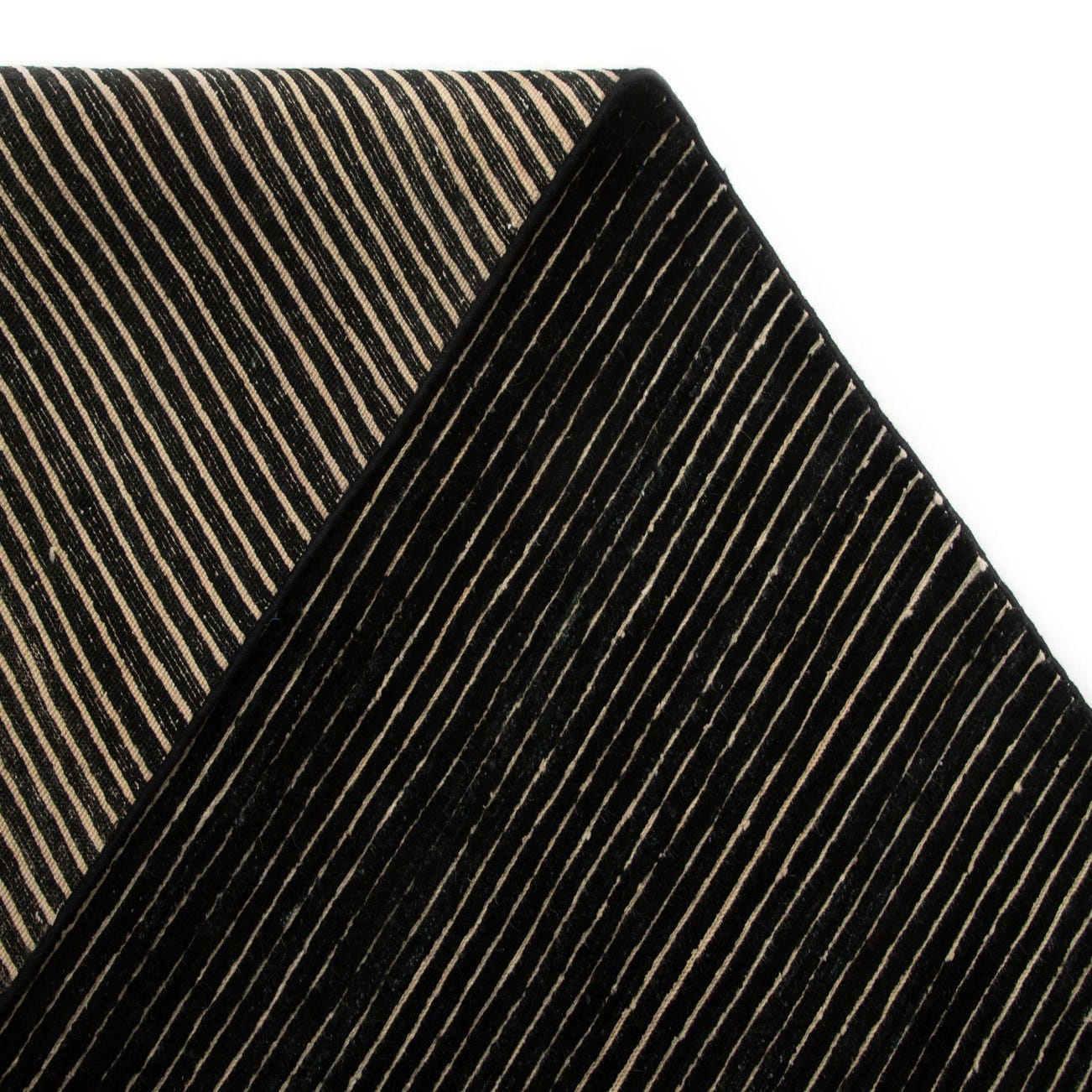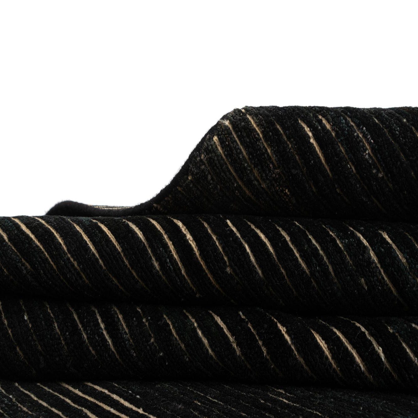 The Juma collection presents a refined 5x8 rug handcrafted from 100% wool, offering a durable and soft touch underfoot. This rug features a sophisticated, textural pattern with uniform horizontal lines that create a subtle, rhythmic design. The black background is artfully contrasted with delicate beige striations, resulting in a visually compelling piece that is both modern and timeless.