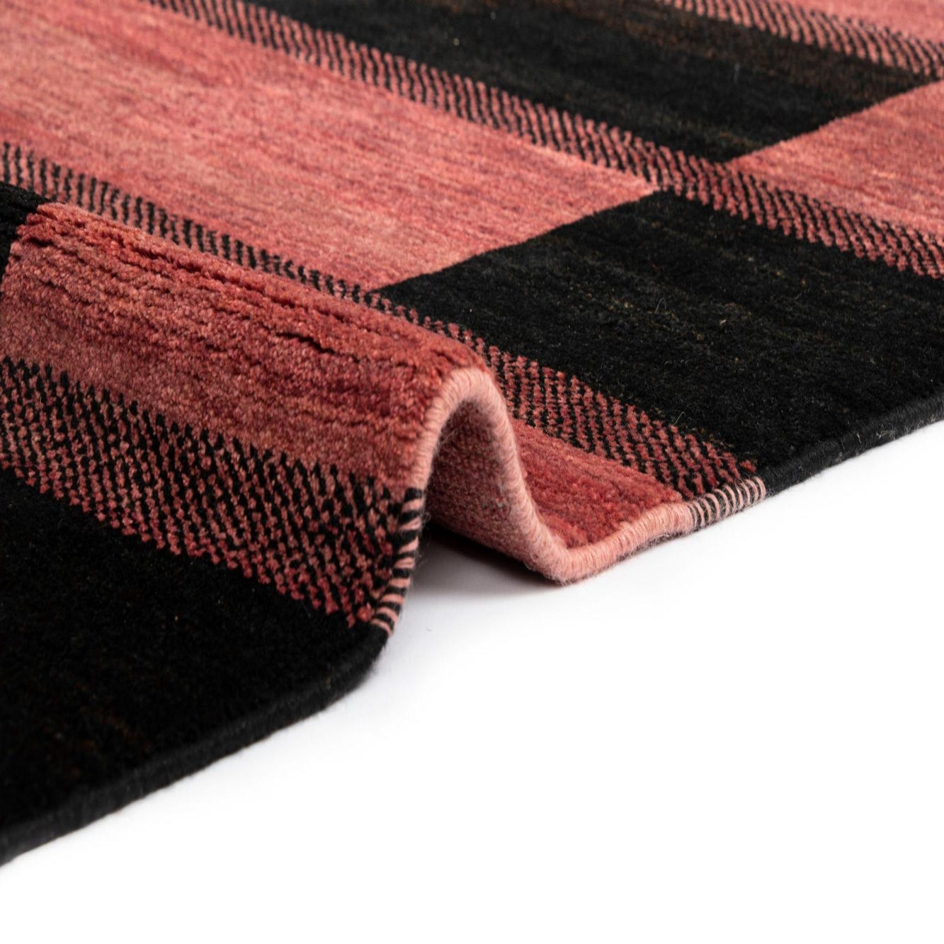 The Juma collection presents a 5x8 hand-made rug crafted from 100% wool, showcasing a dominant black backdrop harmoniously juxtaposed with striking pink accents. The pattern features a bold, contemporary design composed of horizontal stripes that vary in thickness and shade, creating visual depth and interest. The juxtaposition of black and pink hues contributes to a confident design statement.