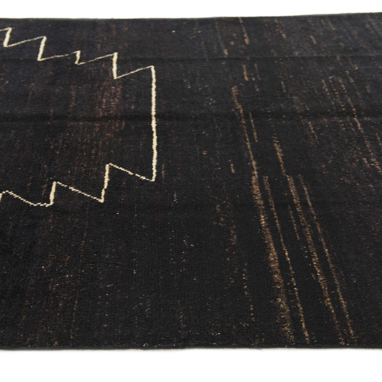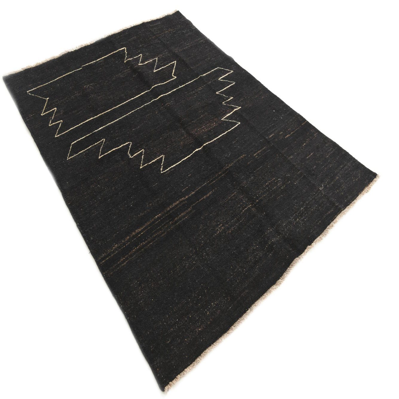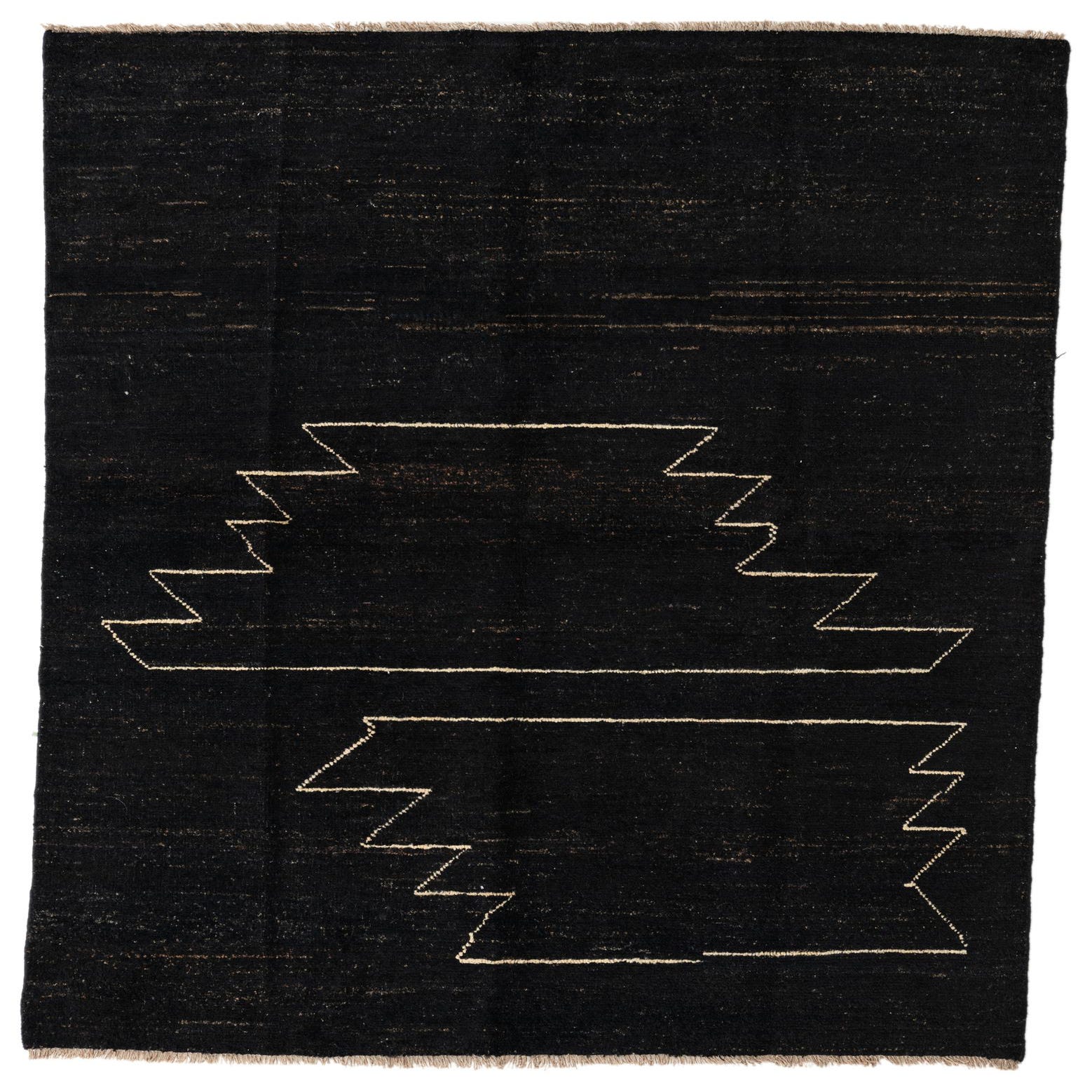 A 5x8 rectangular black wool rug featuring a modern abstract zig-zag pattern in light beige, suitable for a living room.