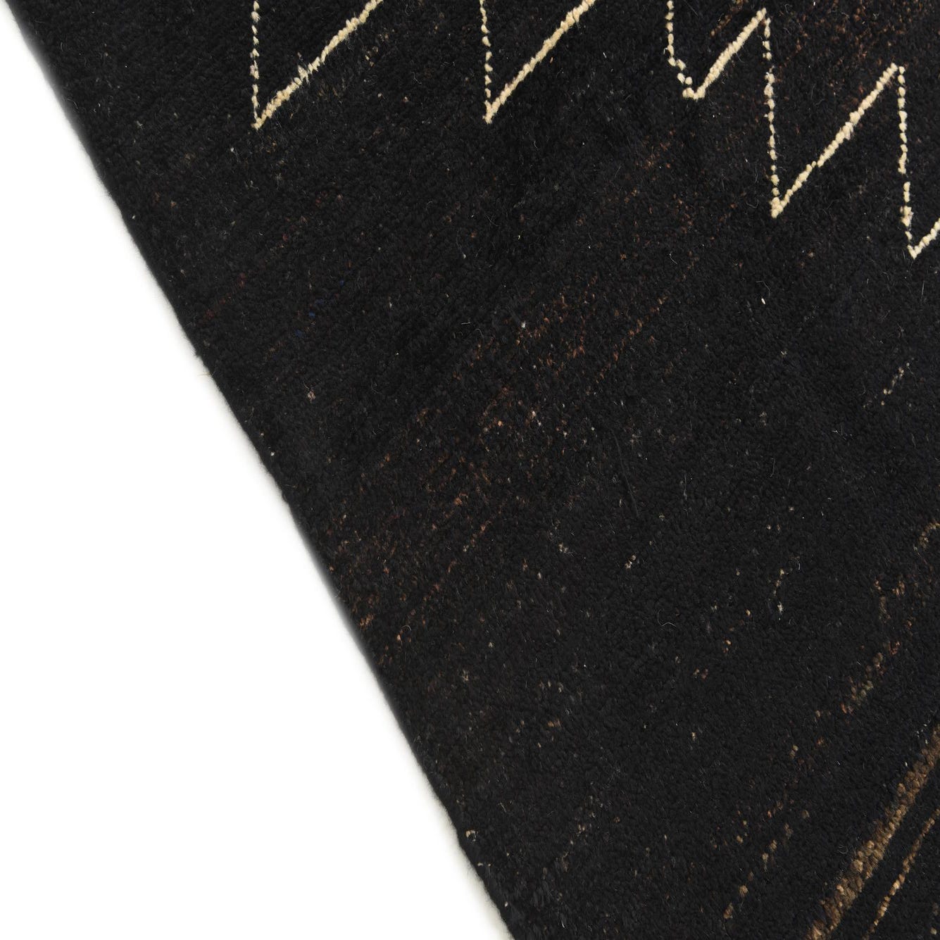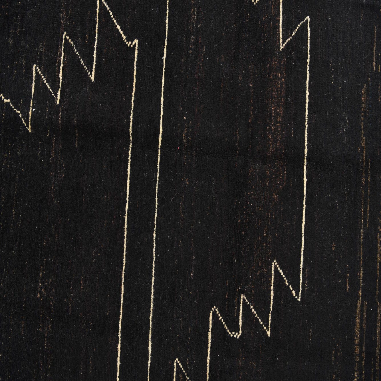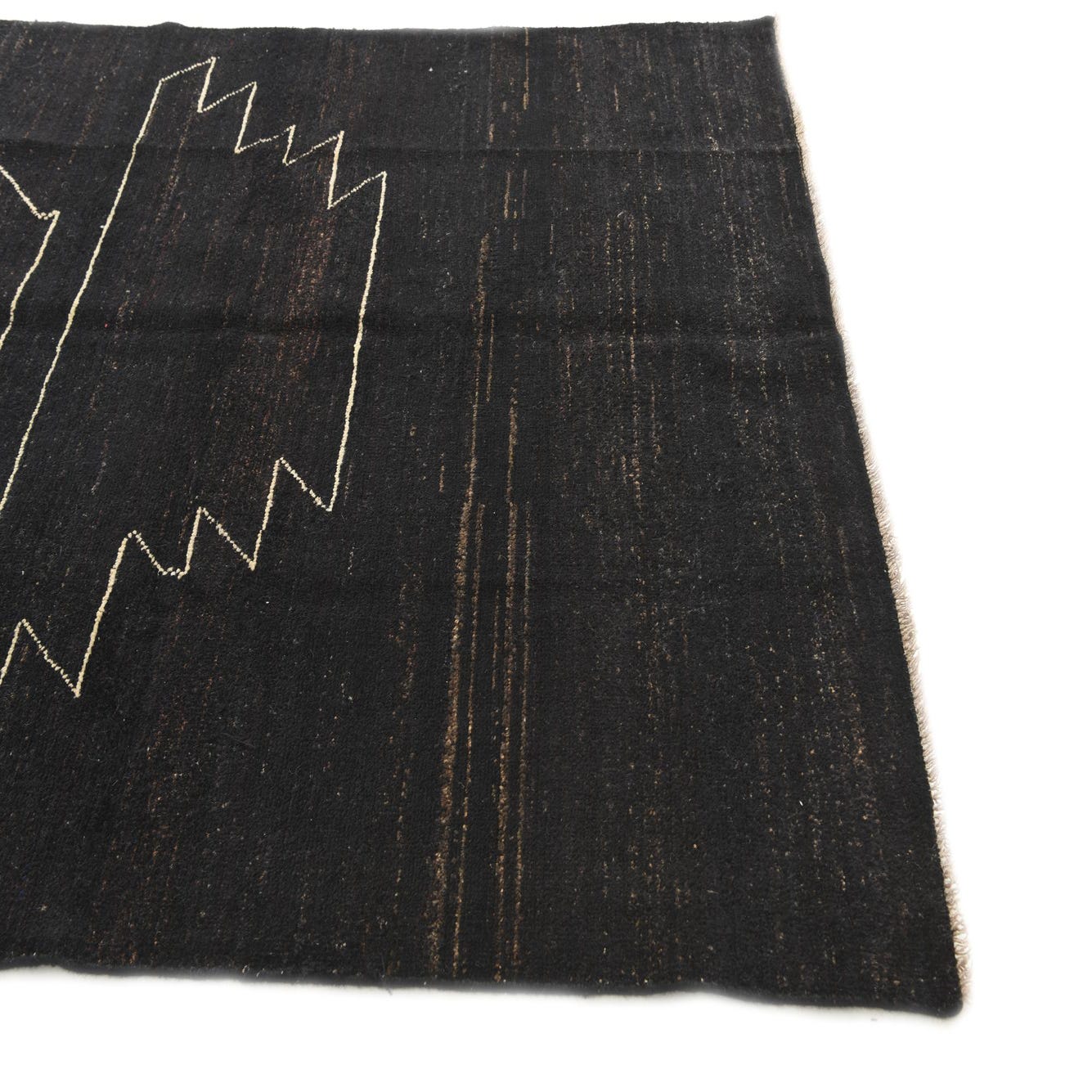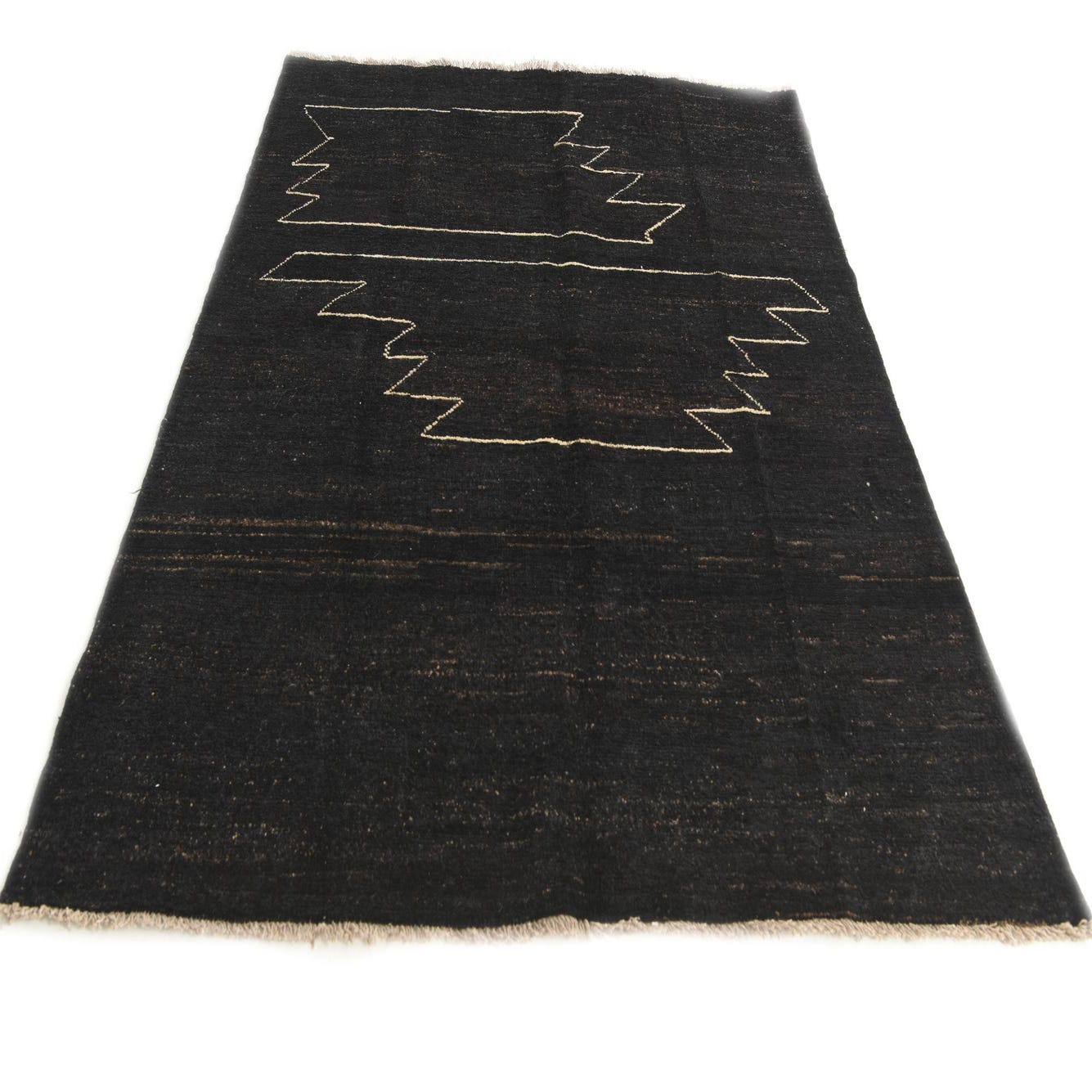A 5x8 rectangular black wool rug featuring a modern abstract zig-zag pattern in light beige, suitable for a living room.