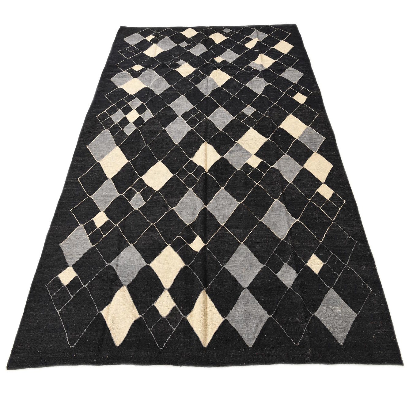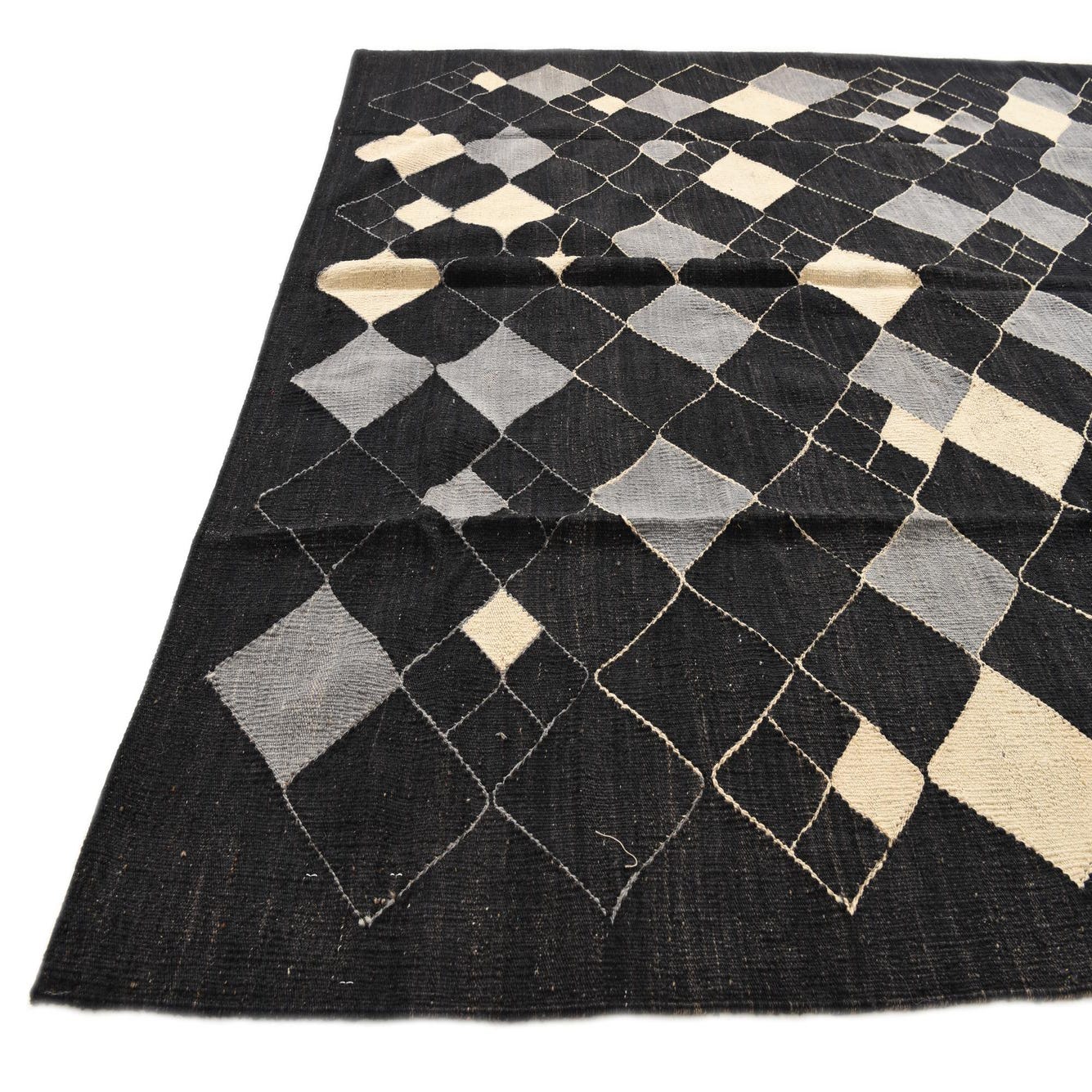 The Kilim Modern collection presents a 5x8 hand-woven rug crafted from 100% wool, showcasing a sharp geometric pattern that will make a bold statement in any space. This piece features an array of black, gray, and ivory hues, arranged in a series of diamonds and offset angles, resulting in a dynamic and engaging visual effect. The black background serves as a dramatic canvas that allows the pattern to stand out prominently.