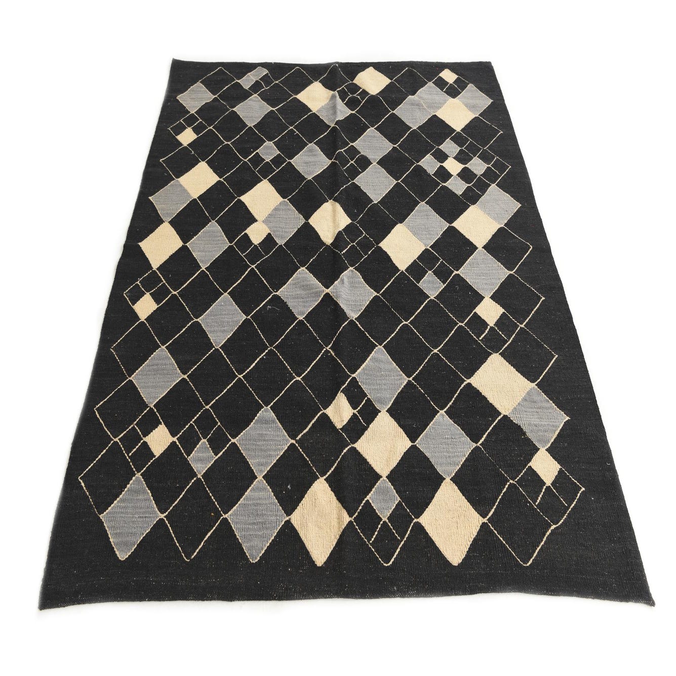 A 5x8 rectangular black flatweave rug with a modern tribal pattern of light beige and gray diamonds.