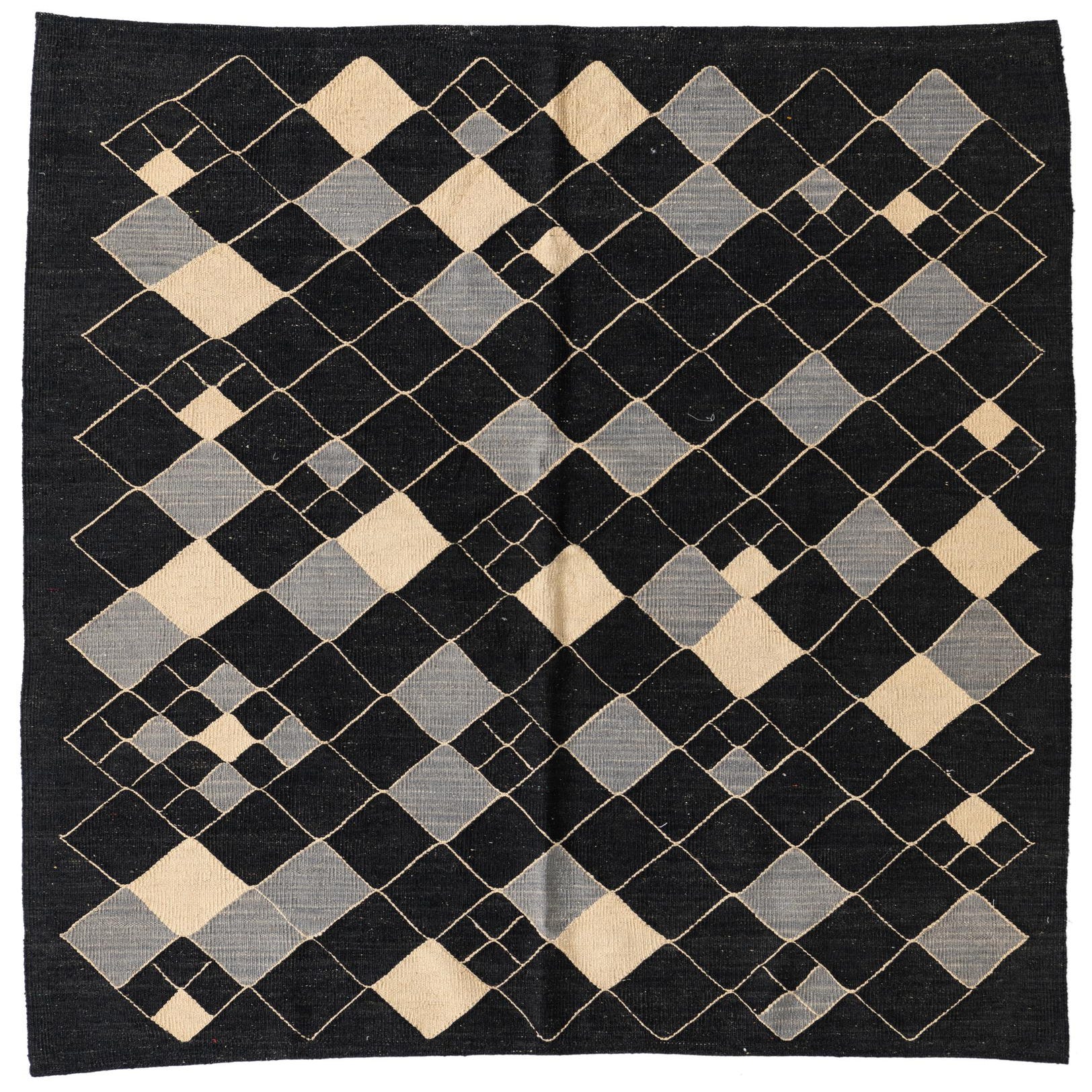 The Kilim Modern collection presents a versatile 5x8 hand-woven rug crafted from 100% wool, offering durability and a tactile experience underfoot. This piece showcases a distinct pattern featuring a geometric motif comprised of alternating diamond shapes in a harmonious blend of black, gray, and ivory hues. The background is predominantly black, allowing the lighter tones to stand out and giving the design a striking contrast.
