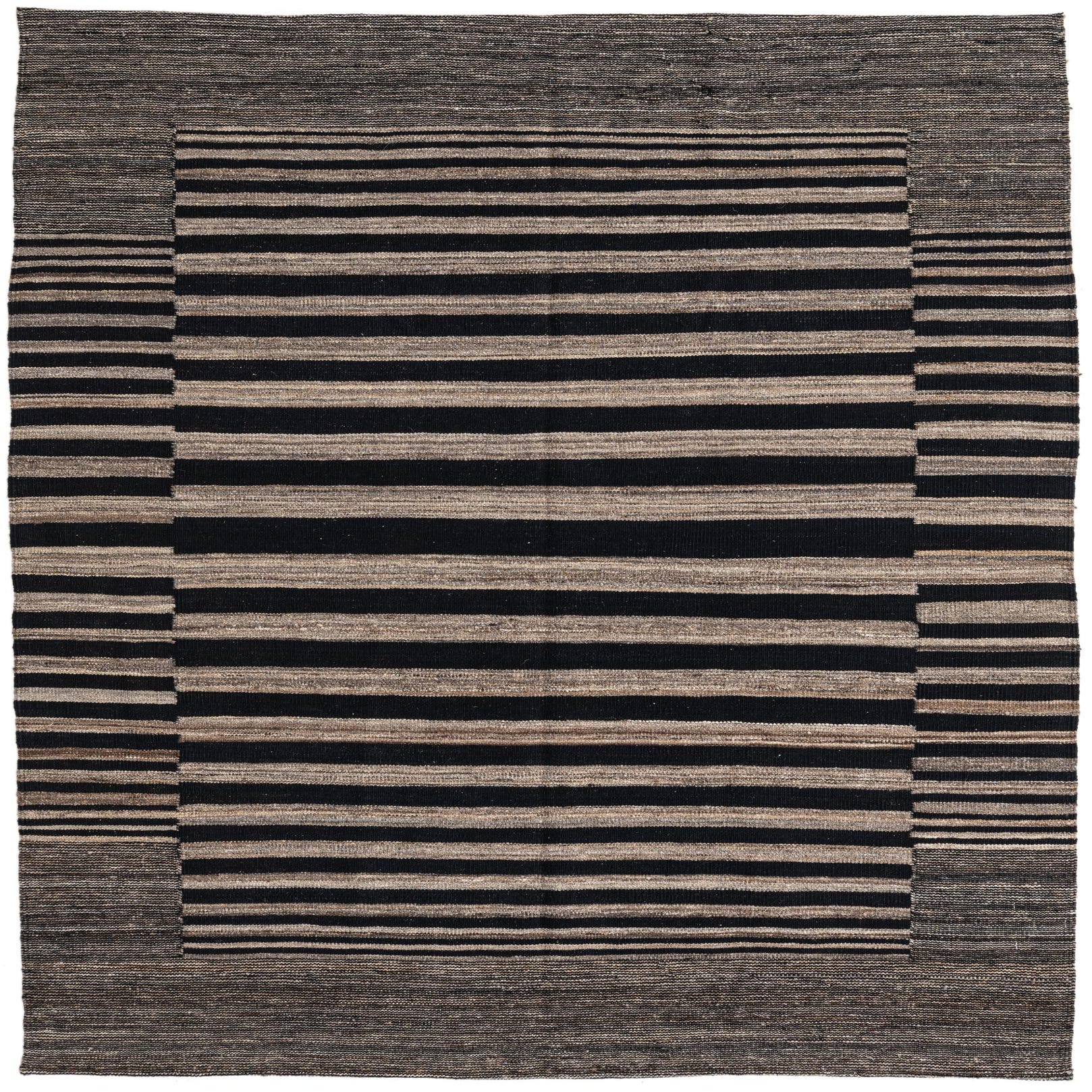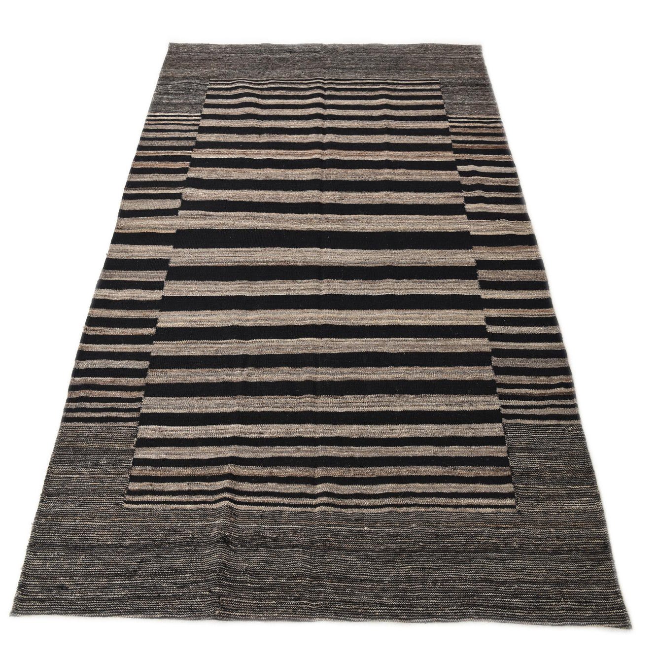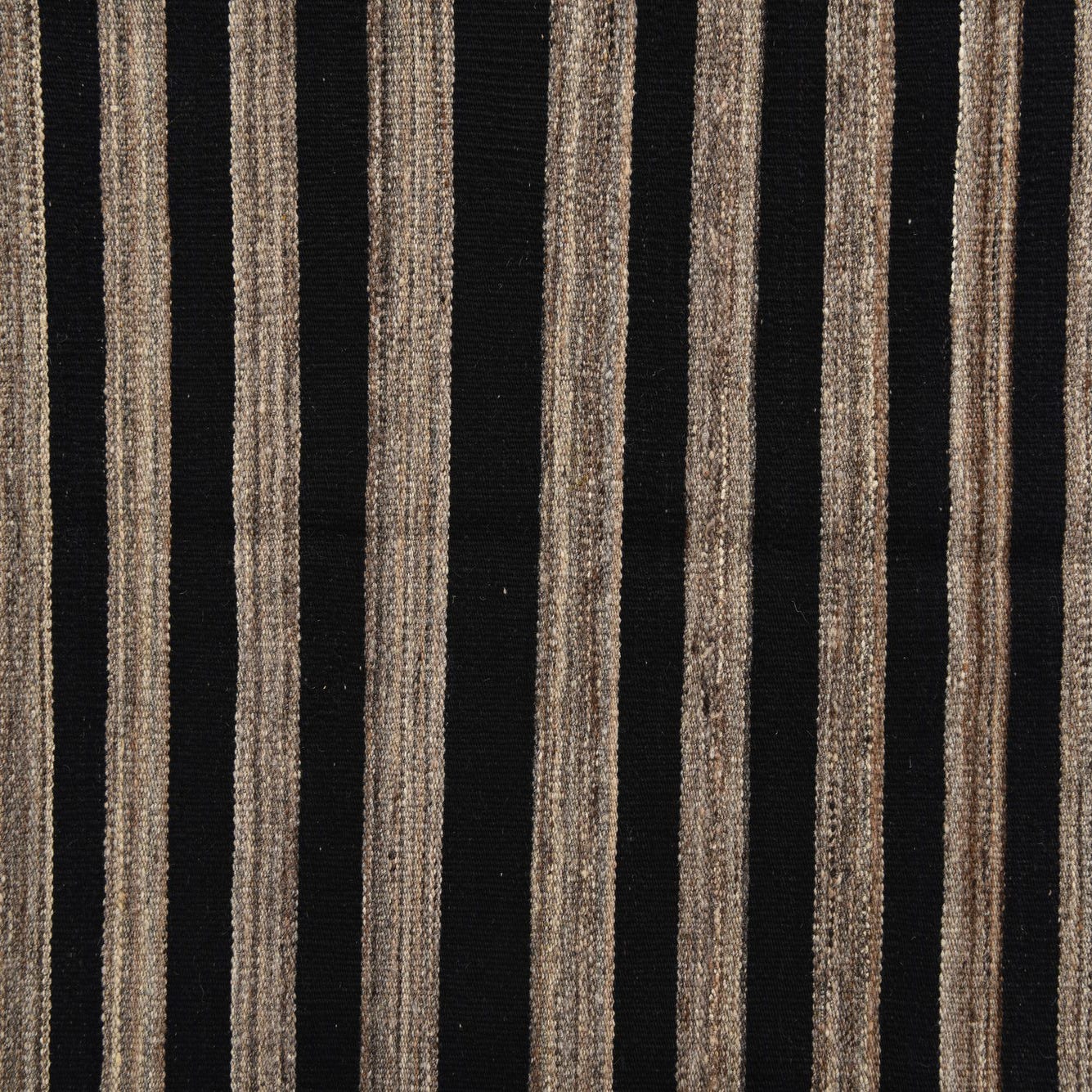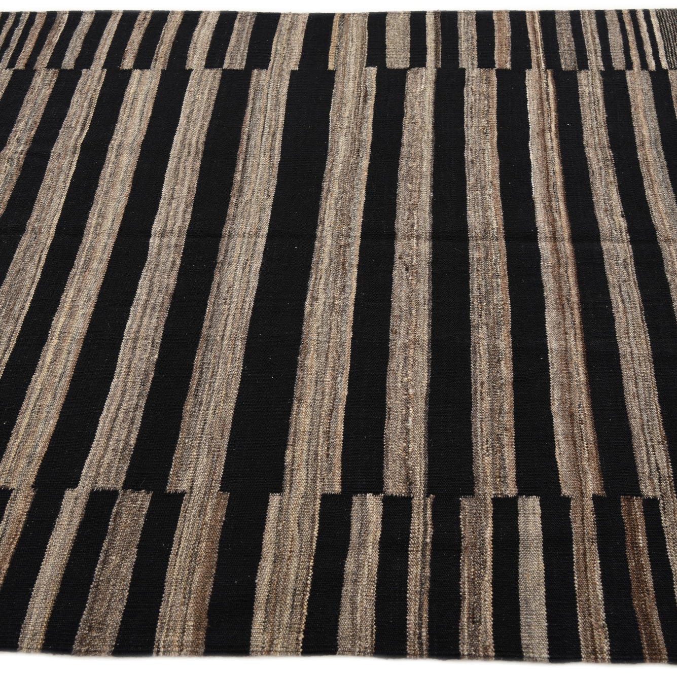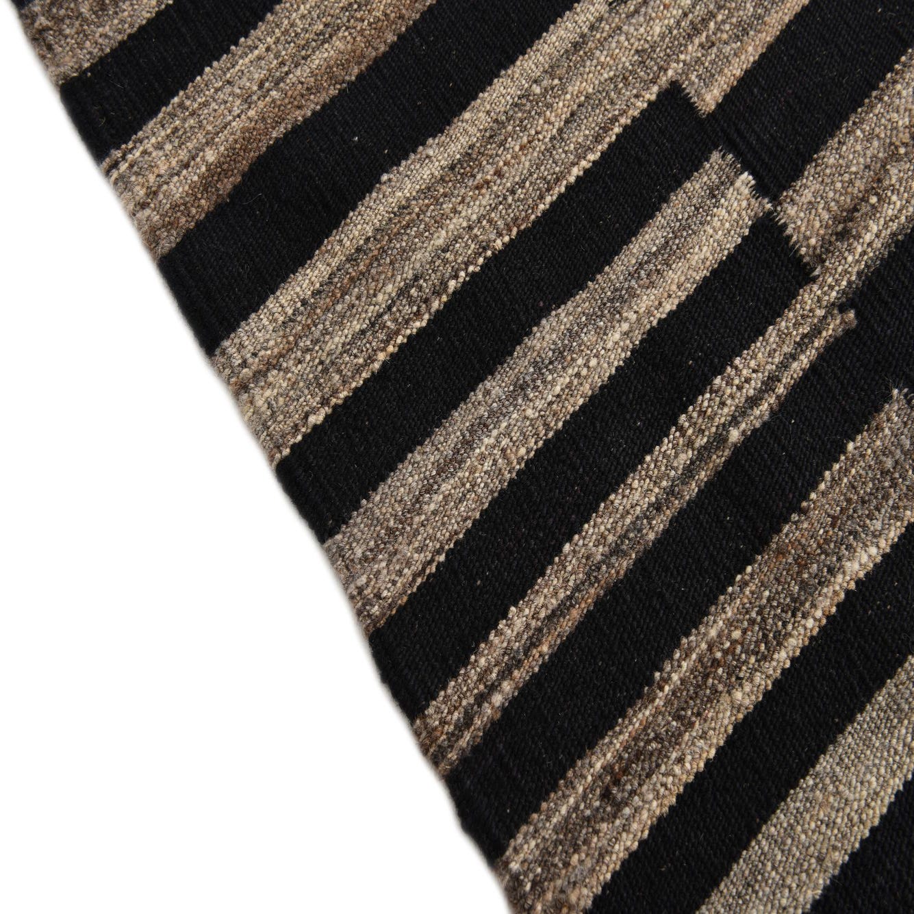 The Kilim Modern collection presents a hand-woven 5x8 rug crafted from 100% wool, offering both durability and a soft texture ideal for high-traffic areas. This rug showcases a bold, graphic pattern with horizontal stripes in a balanced composition of black, brown, and ivory. The dominant black background is contrasted by the lighter hues, creating a visually striking effect.