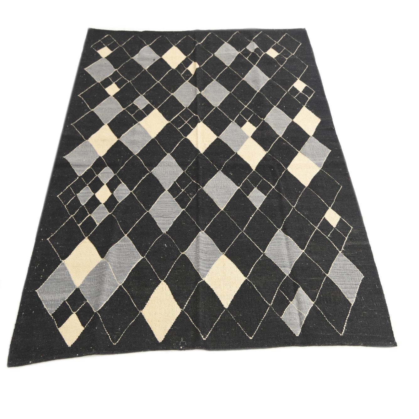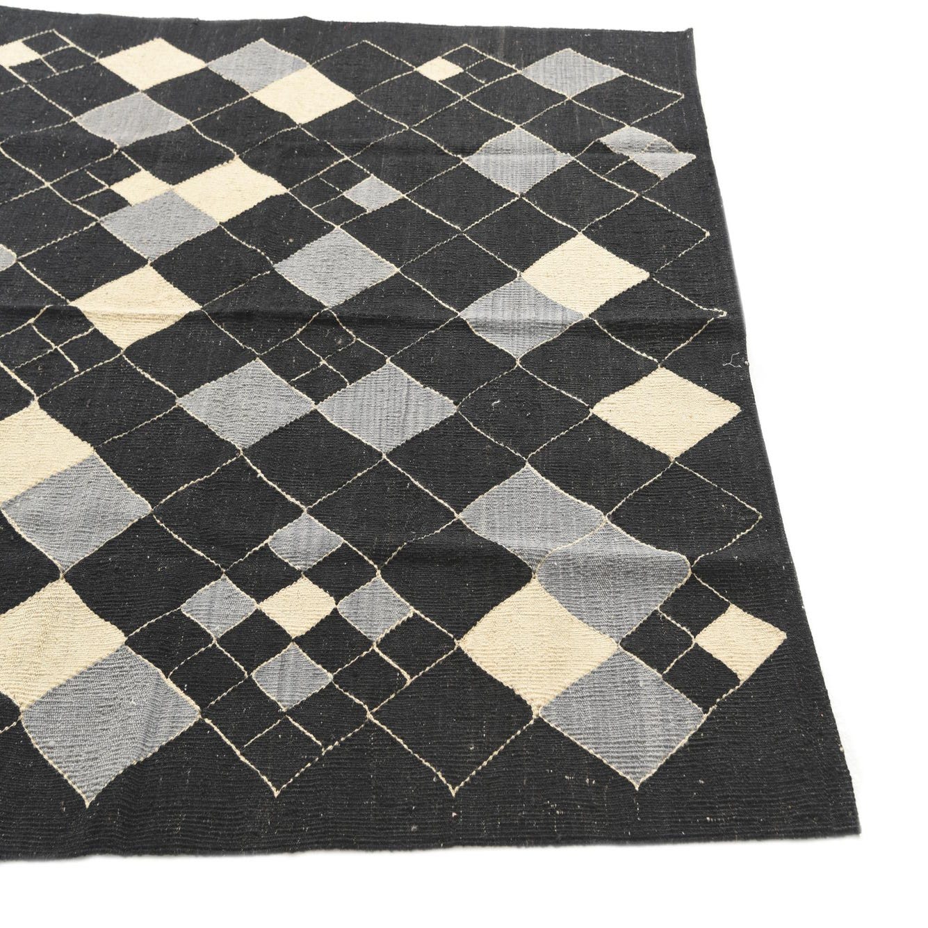 A 5x8 rectangular black flatweave wool rug with an abstract tribal diamond pattern in varying shades of black, grey, and beige.