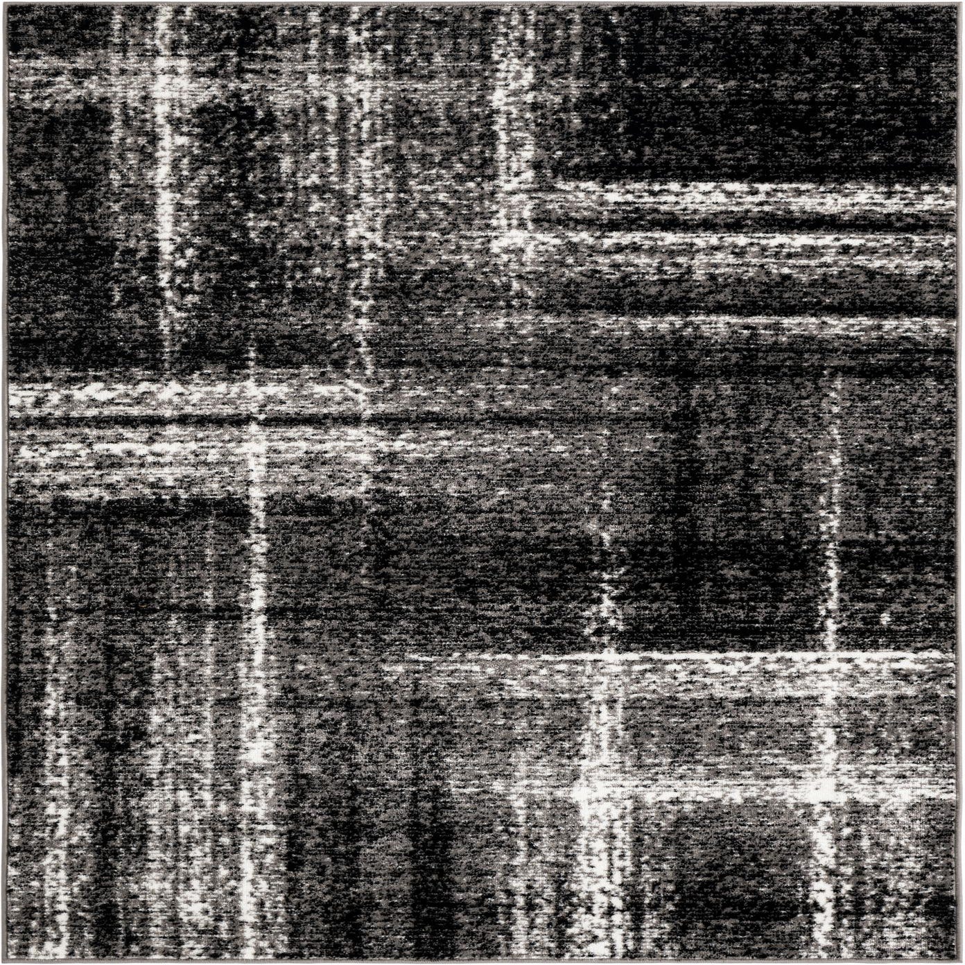 Black provides the field for this rug’s layered, abstract grid. Broad, distressed bands of gray and ivory cross the surface in irregular horizontal and vertical strokes, producing a modern, painterly plaid that reads contemporary and slightly industrial. The machine-made construction in 100% polypropylene creates a low-profile, dense pile that feels smooth and slightly springy underfoot, while the tonal contrast between the black background and lighter highlights gives the surface visual depth and movement.