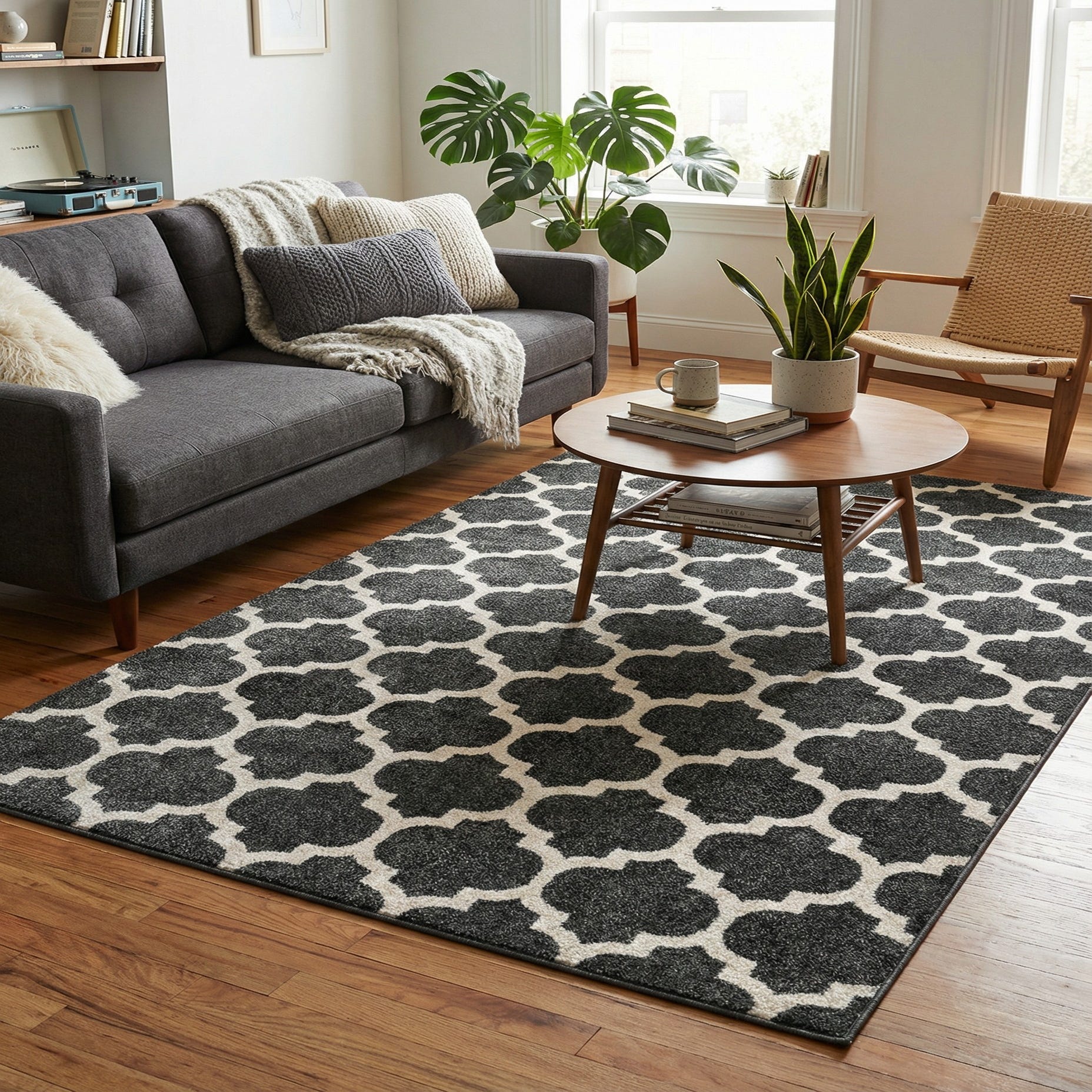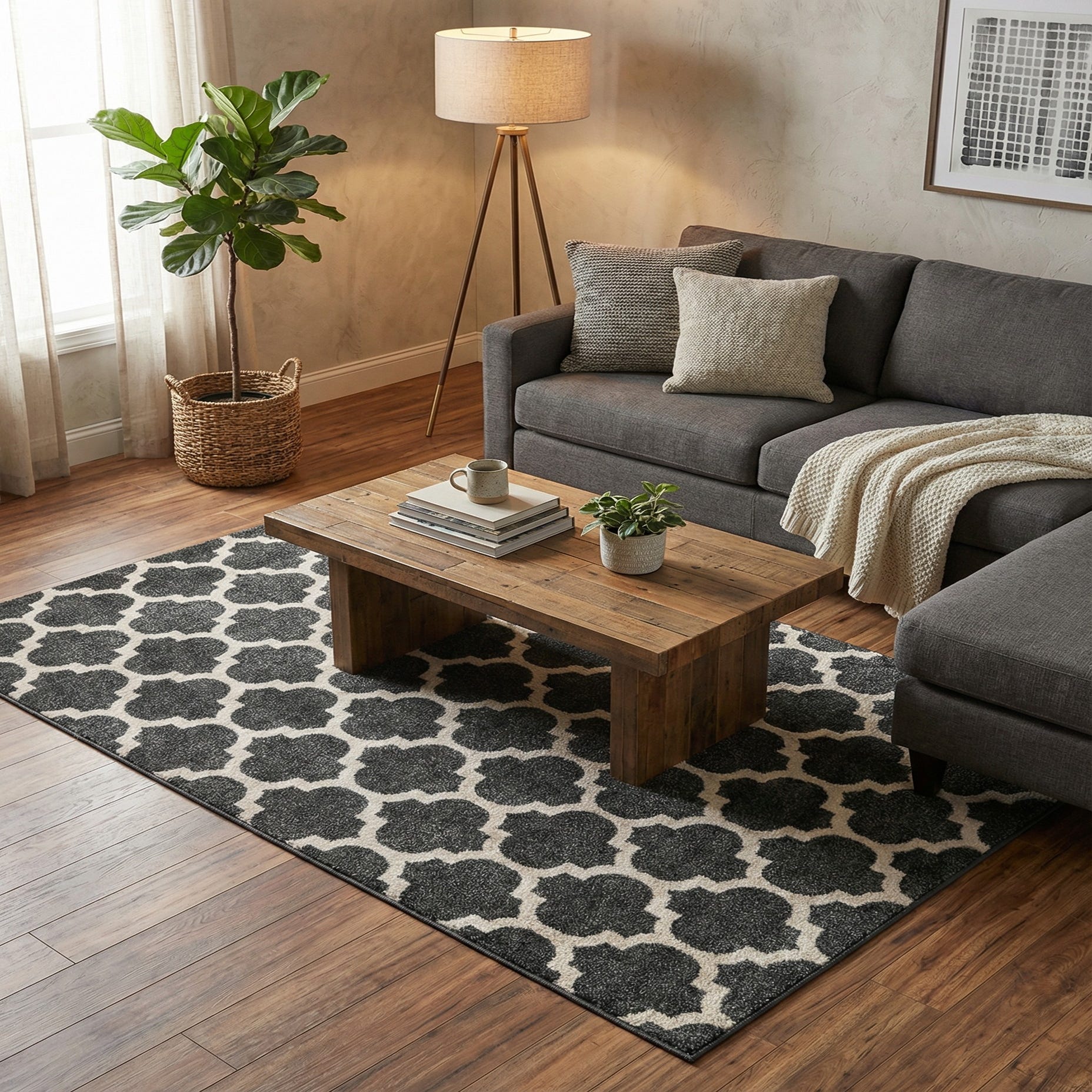A strong black field provides a dramatic backdrop for a repeating beige quatrefoil trellis. The geometric lattice pattern reads clean and composed, with rounded quatrefoil motifs linked by narrow beige outlines that create a steady rhythm across the surface. The high-contrast palette of black and beige gives the rug a modern, tailored look that complements both contemporary and transitional schemes.
