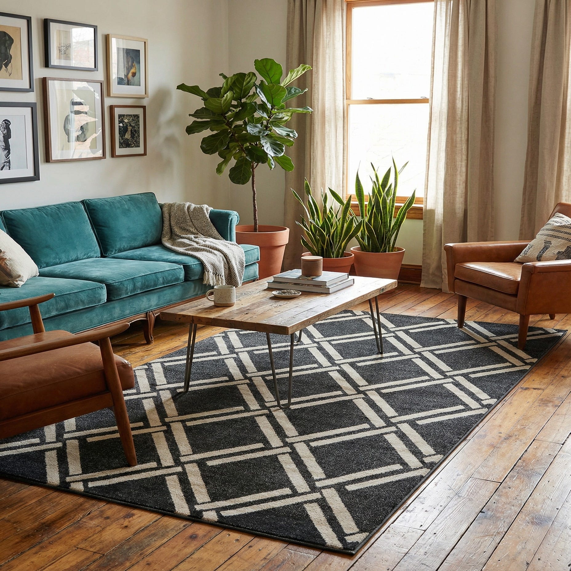 This rug pairs naturally with modern and transitional interiors—think streamlined sofas, metal- or wood-framed coffee tables, and a neutral color palette with one or two stronger accents. It also works well in an entryway or home office to define the space, or layered beneath a seating grouping to add graphic interest without overwhelming the room.