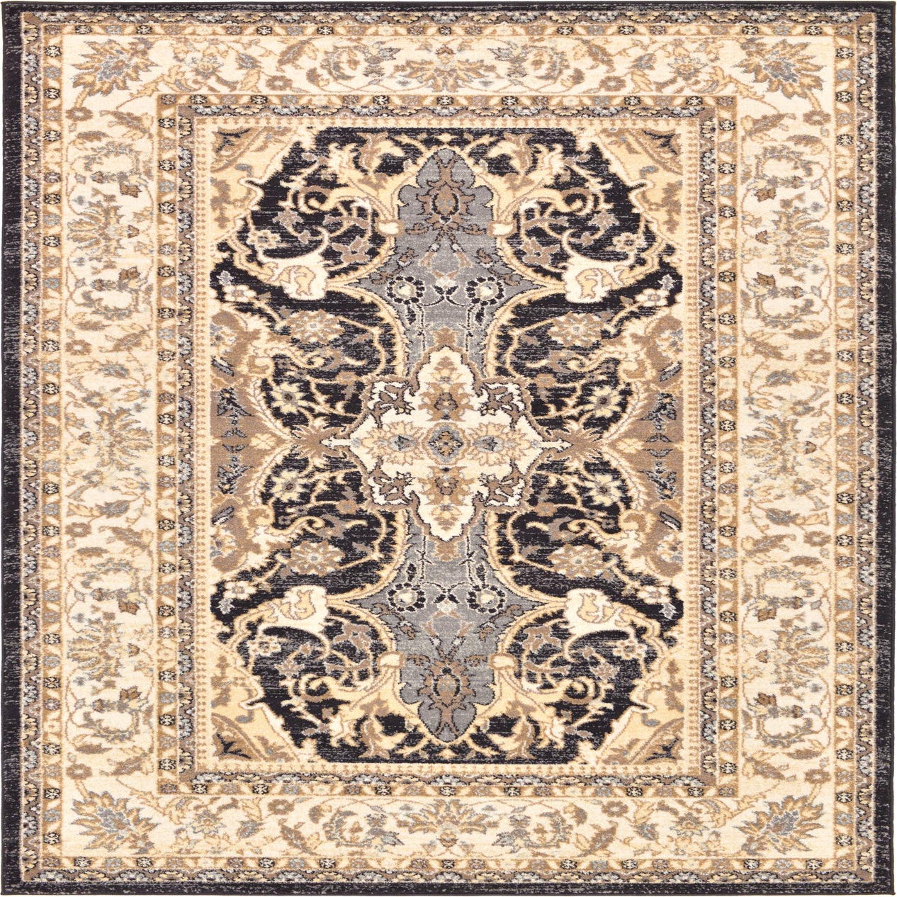 Primary color is Black. Colors in this rug include: Black, Brown, Cream, Gray, Ivory, Tan.