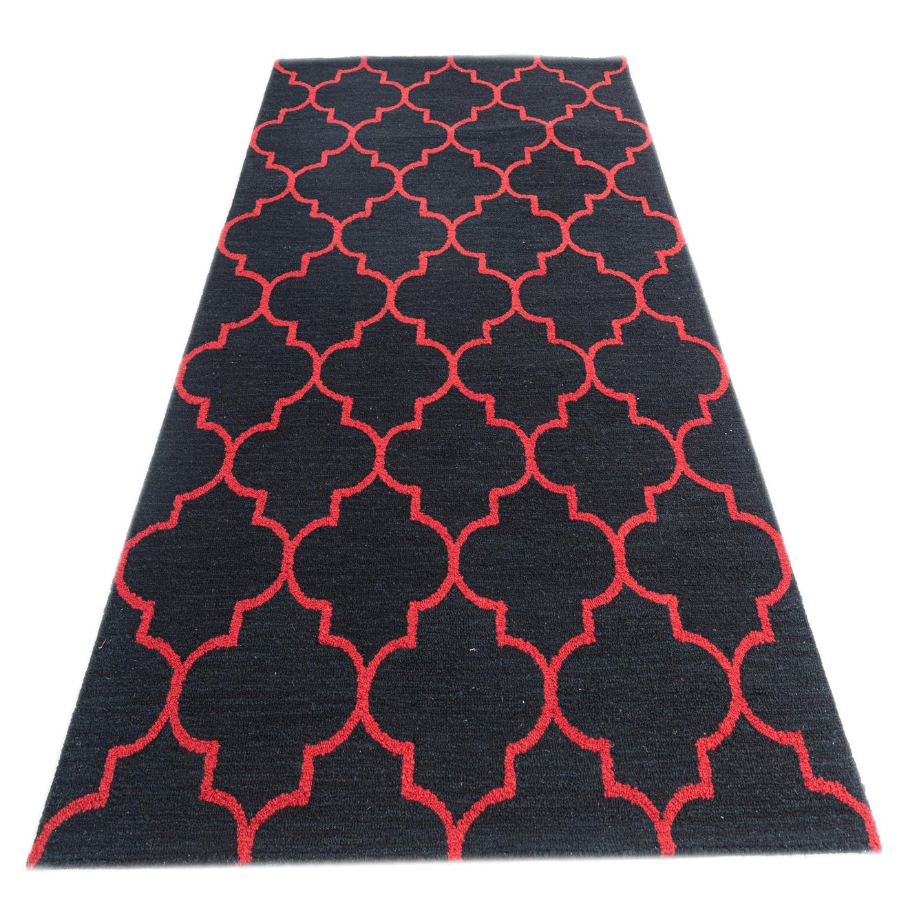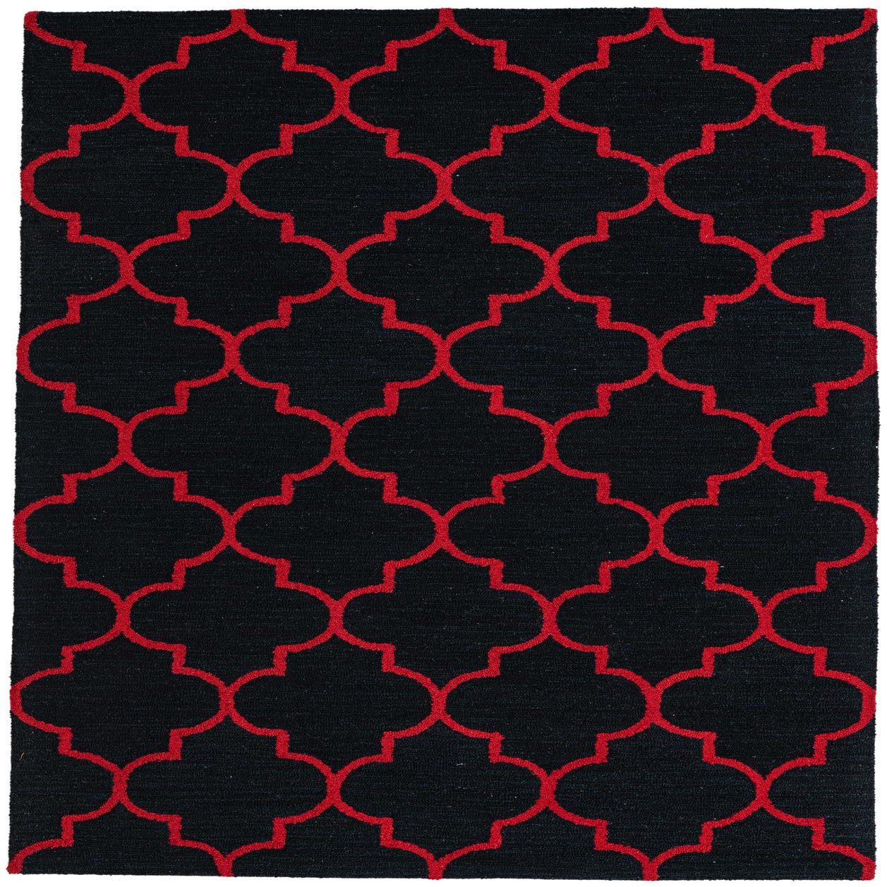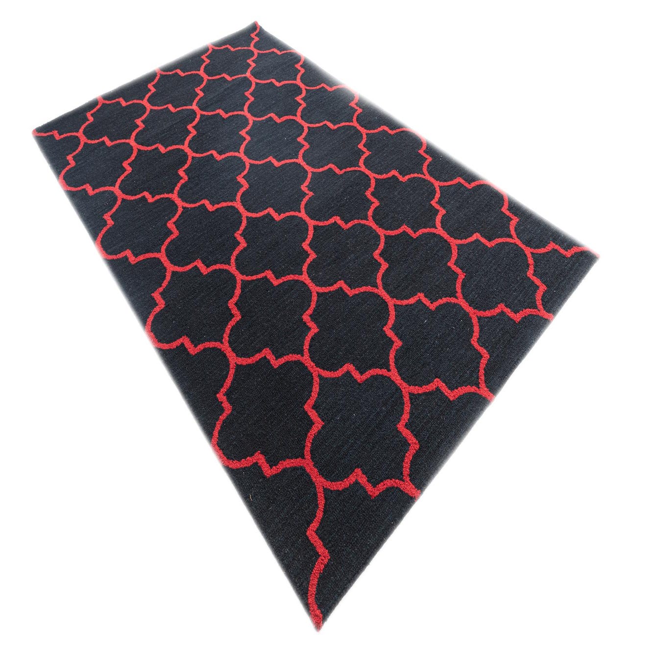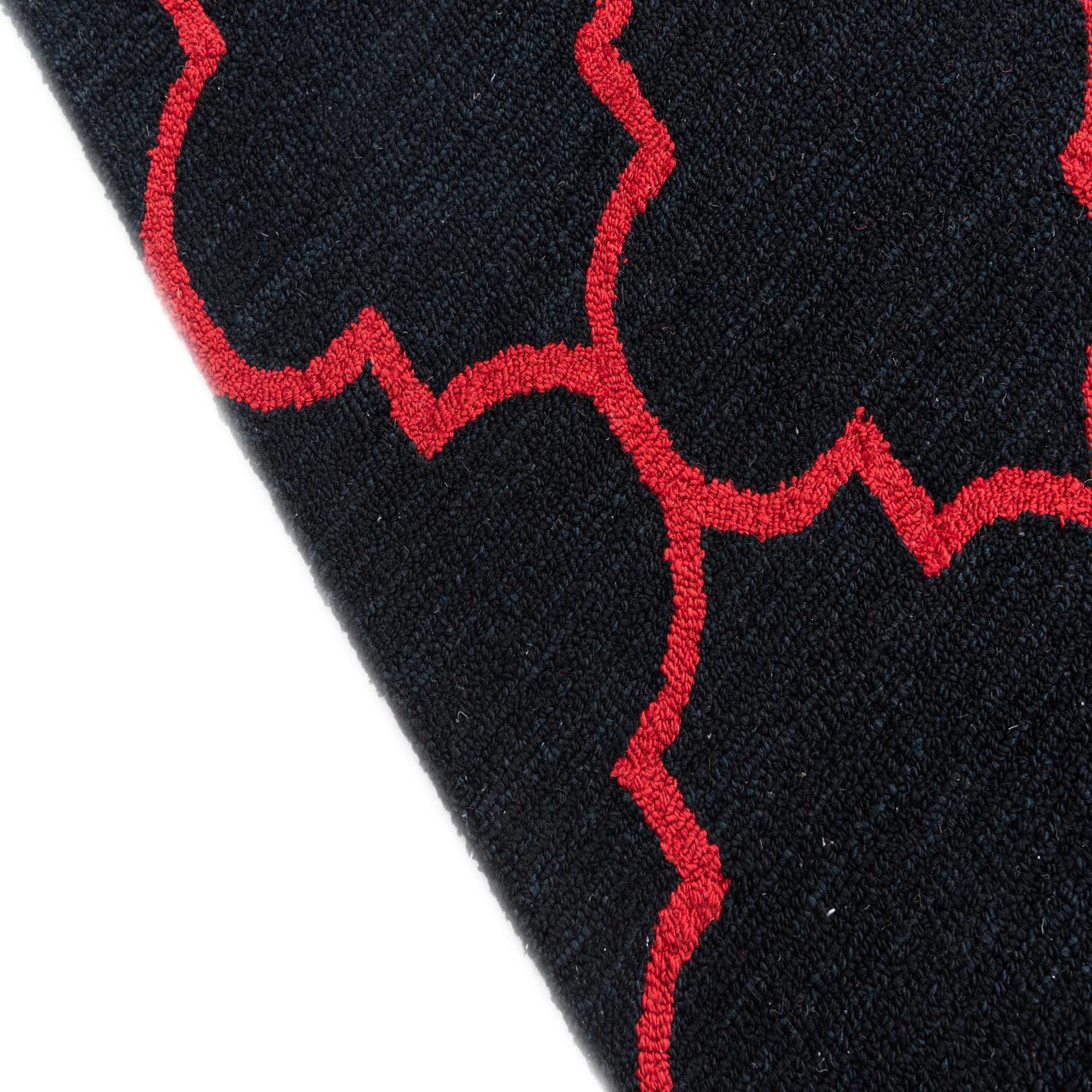 A 5x8 rectangular Luna rug with a bold black background and a vibrant red modern abstract quatrefoil pattern, handmade from wool and cotton.
