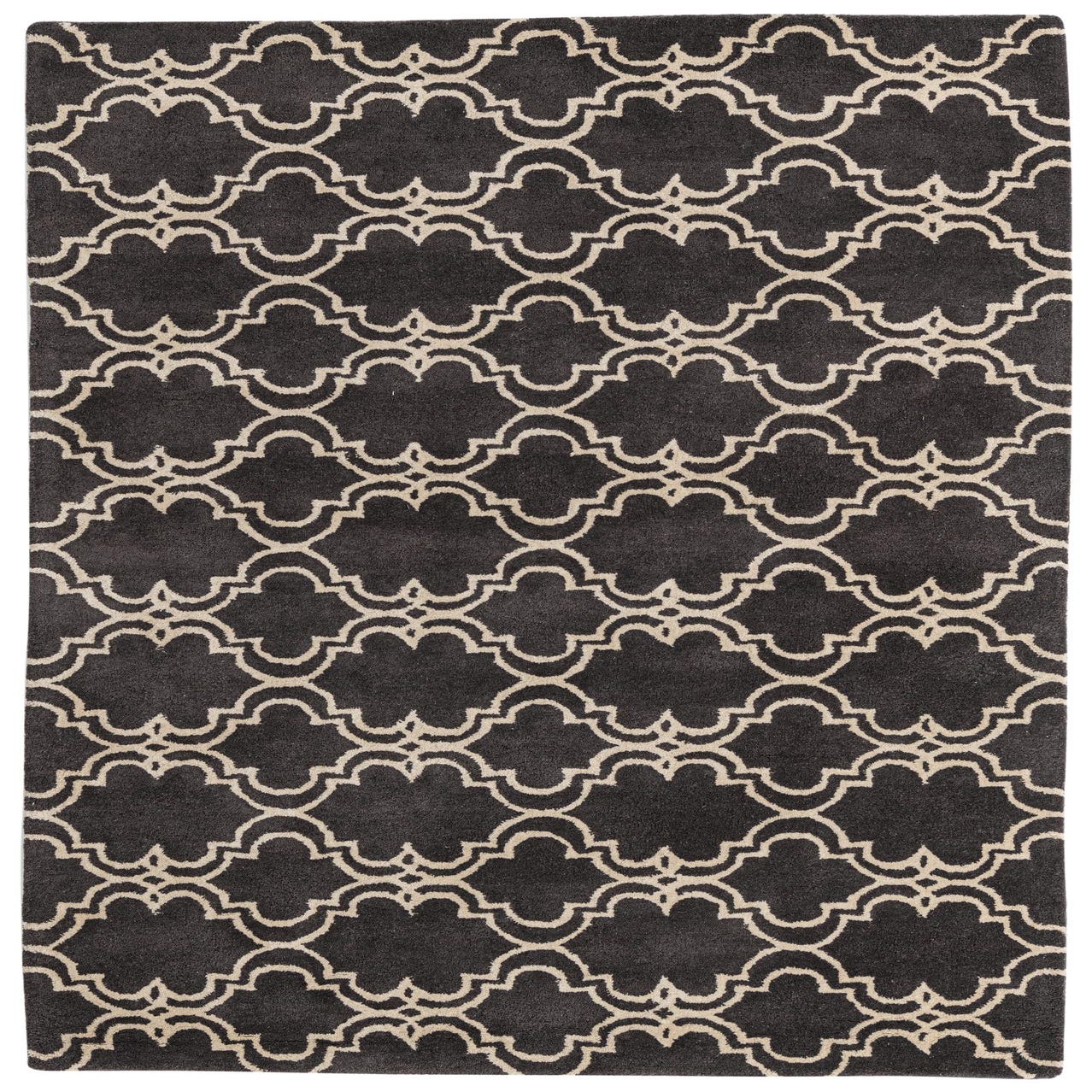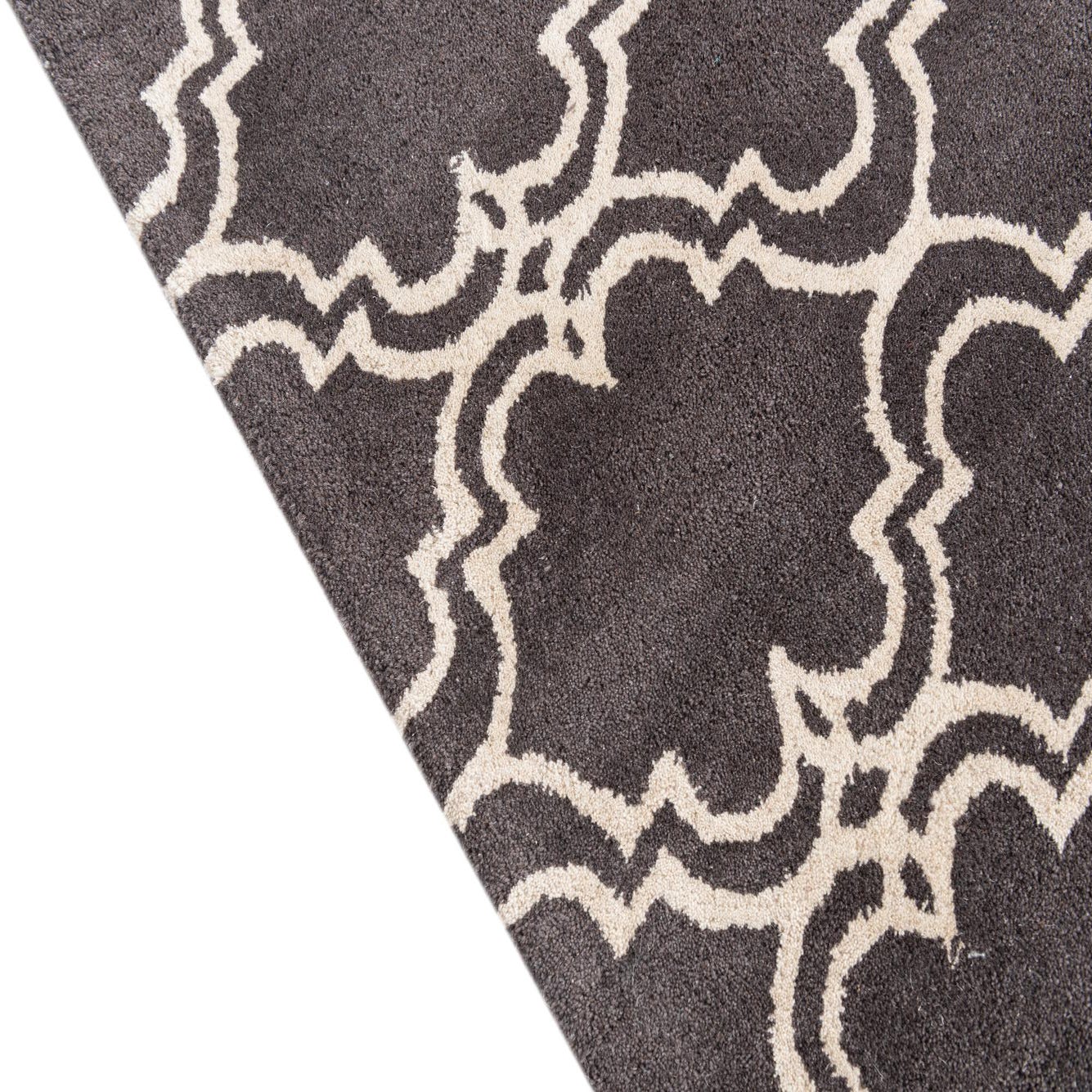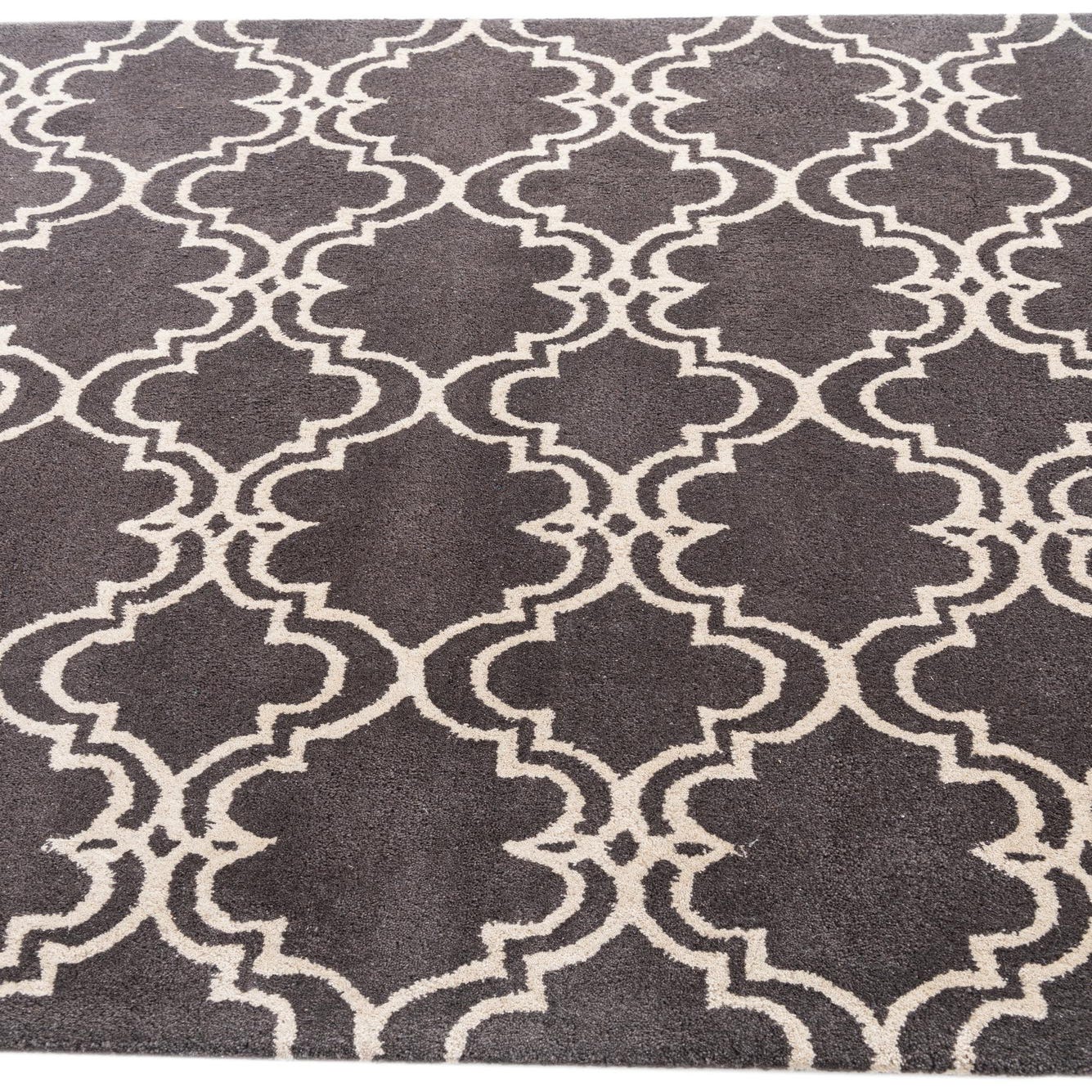 Part of the Luna Collection, this 5x8 hand-tufted rug is crafted from a blend of wool and cotton, offering a plush feel underfoot. The design features a rhythmic pattern of ivory motifs set against a stark black background, creating a visual sense of elegance and contemporary flair. The pattern is reminiscent of traditional quatrefoil designs, given a modern update to fit seamlessly into a variety of decor styles.