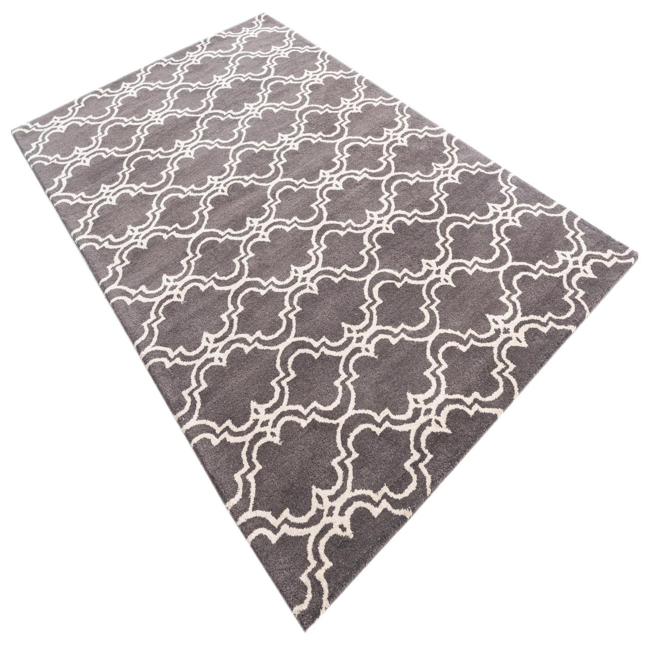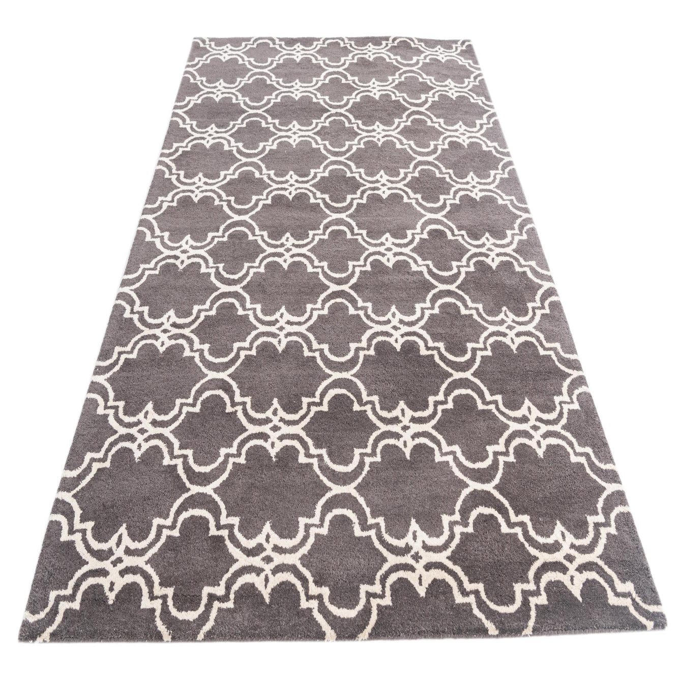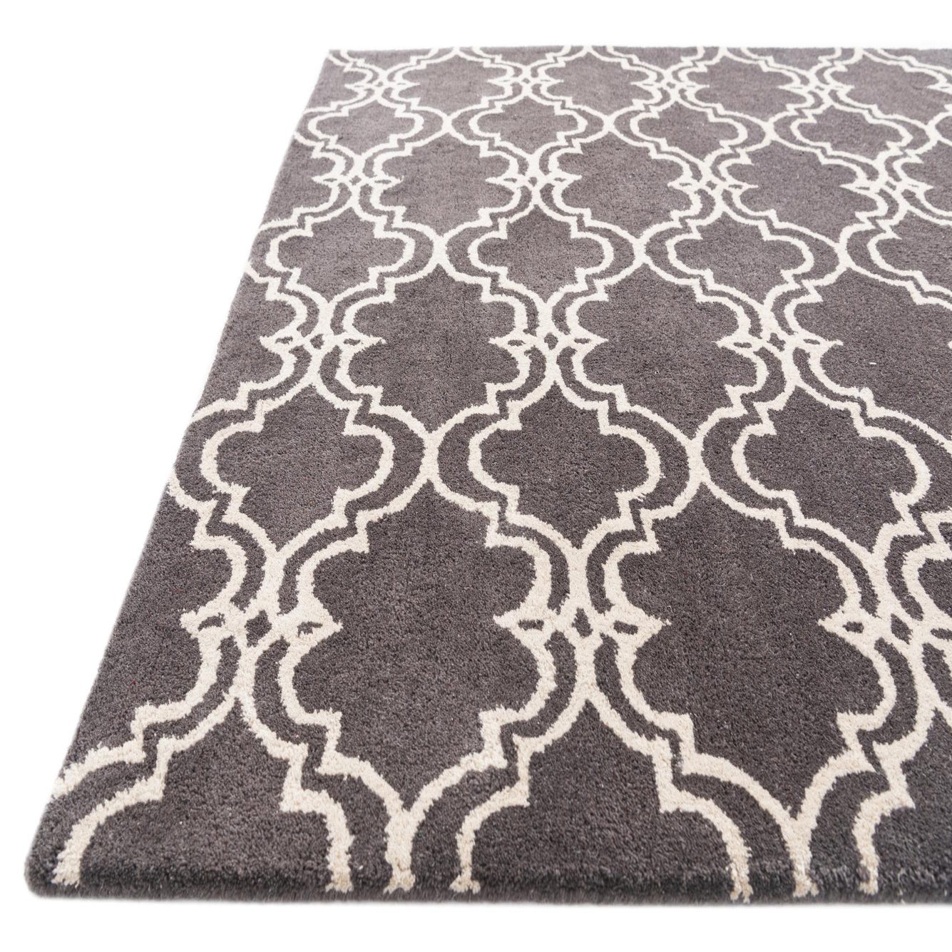 Part of the Luna Collection, this 5x8 hand-tufted rug is crafted from a blend of wool and cotton, offering a plush feel underfoot. The design features a rhythmic pattern of ivory motifs set against a stark black background, creating a visual sense of elegance and contemporary flair. The pattern is reminiscent of traditional quatrefoil designs, given a modern update to fit seamlessly into a variety of decor styles.