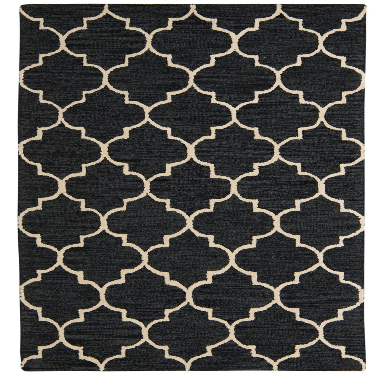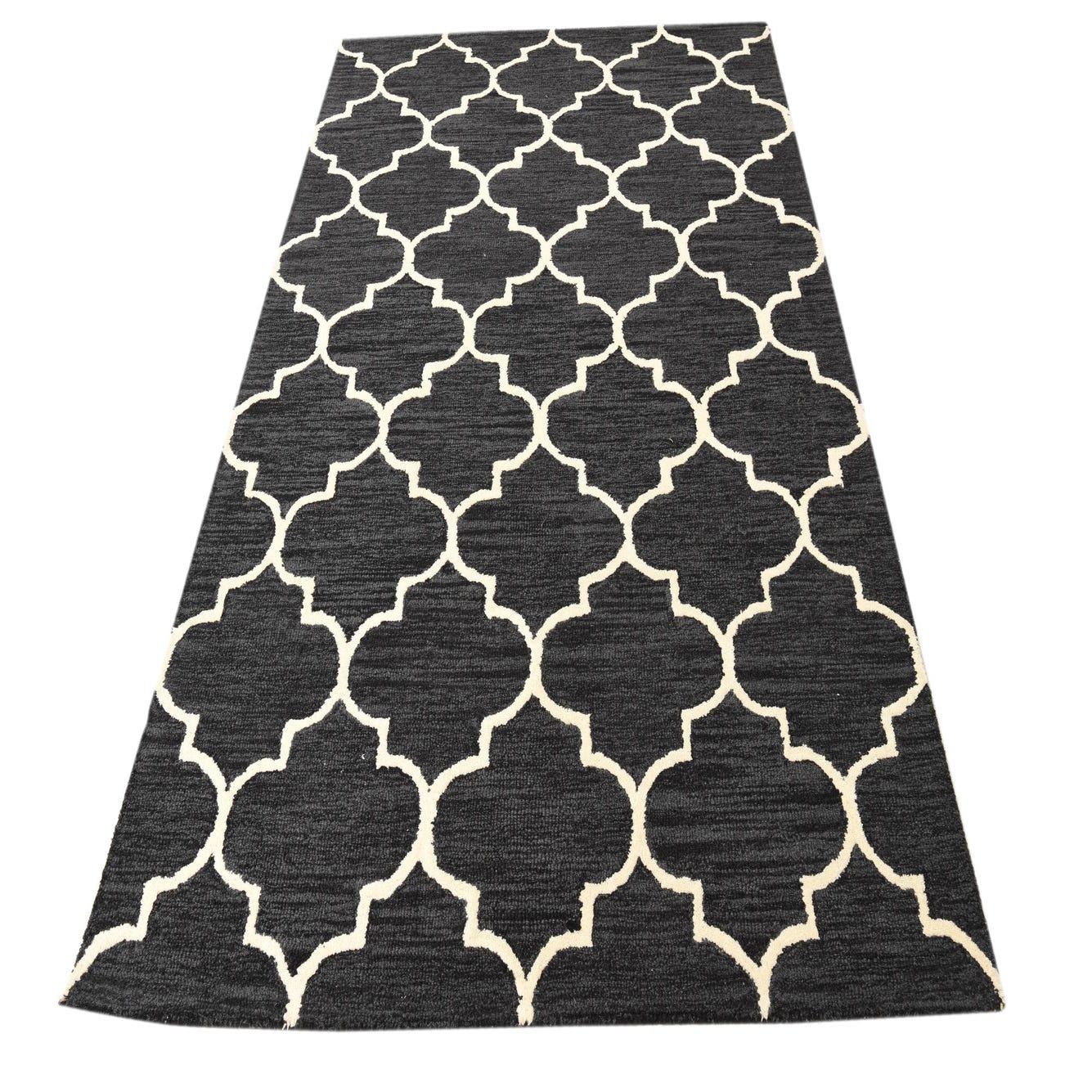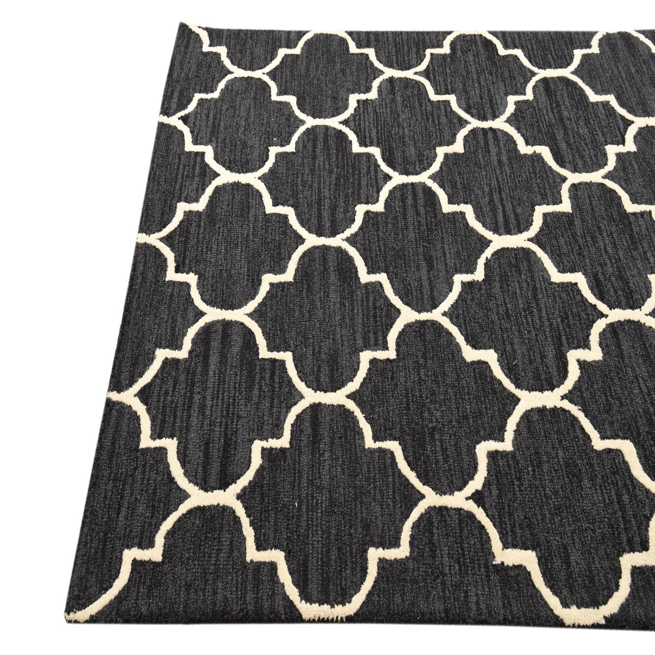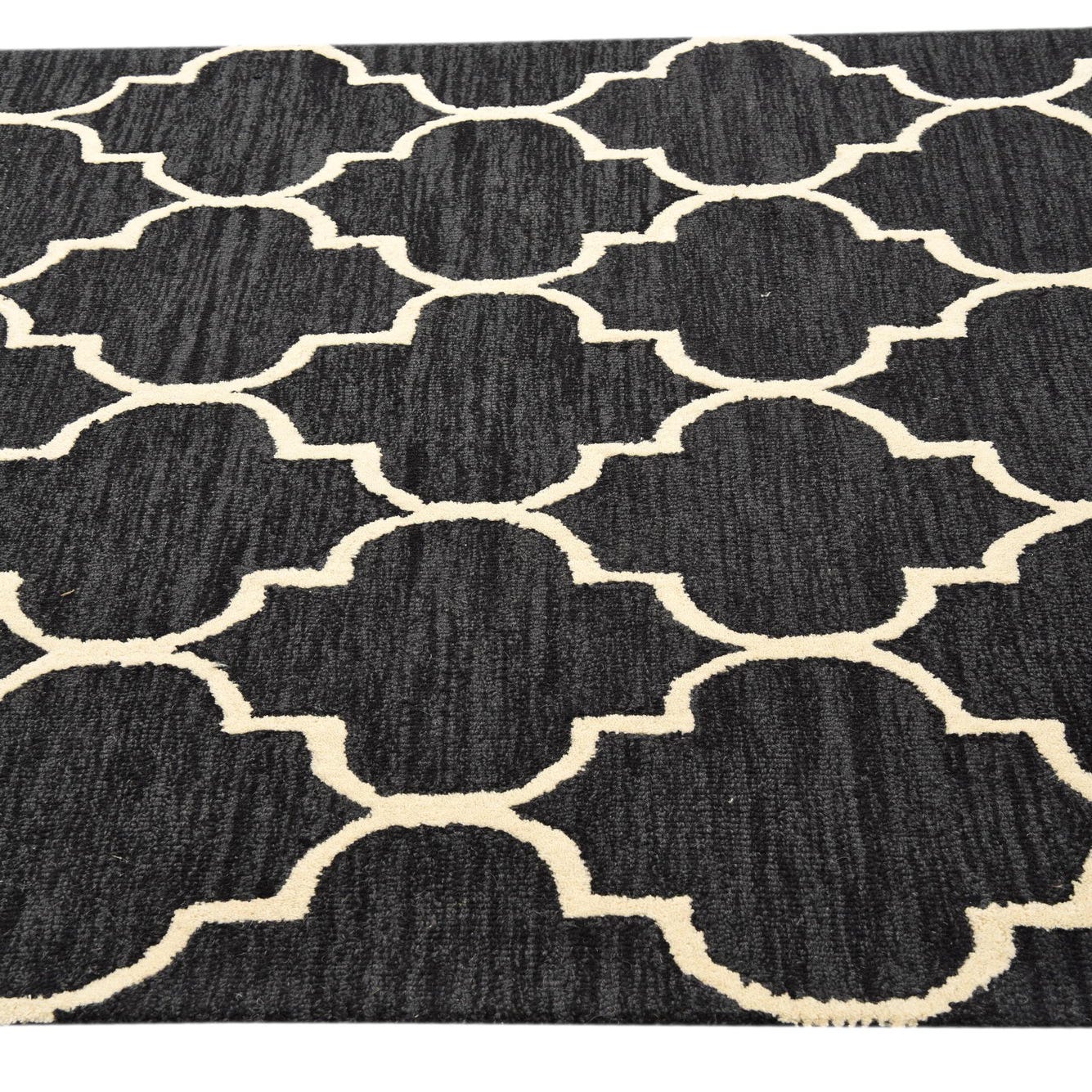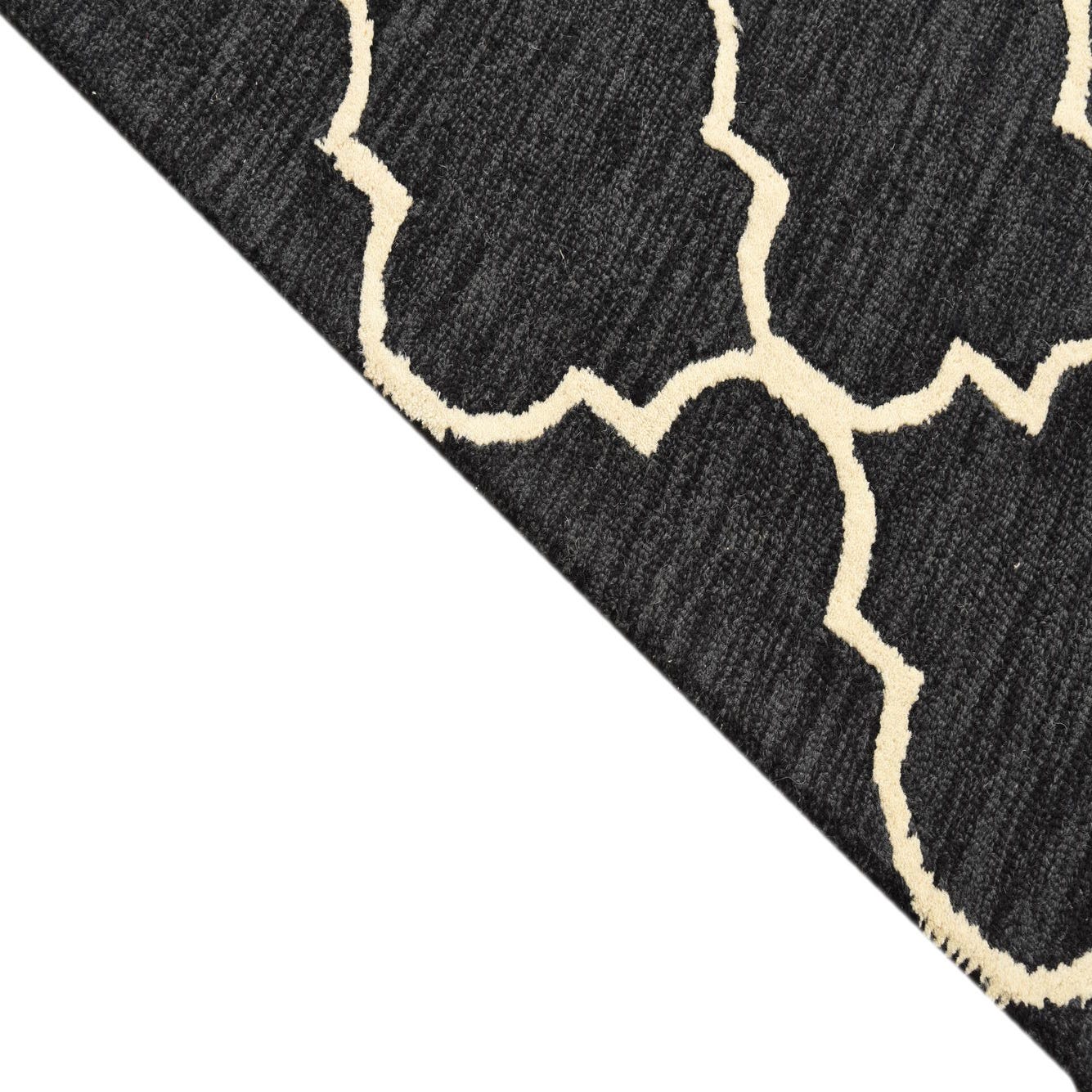 A bold, quatrefoil trellis in ivory creates a crisp, geometric pattern against a deep black field. Hand-tufted from wool with cotton support, the surface has a soft, tactile feel and gentle pile variation; the ivory motif sits in low relief against the slightly striated black background, giving the rug a handcrafted, dimensional quality. The design balances traditional and contemporary elements for a clean, graphic look that stays visually grounded.