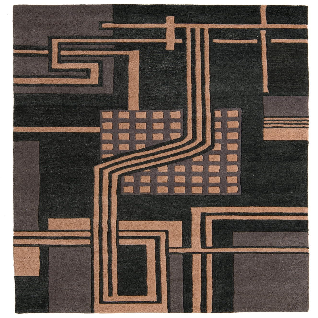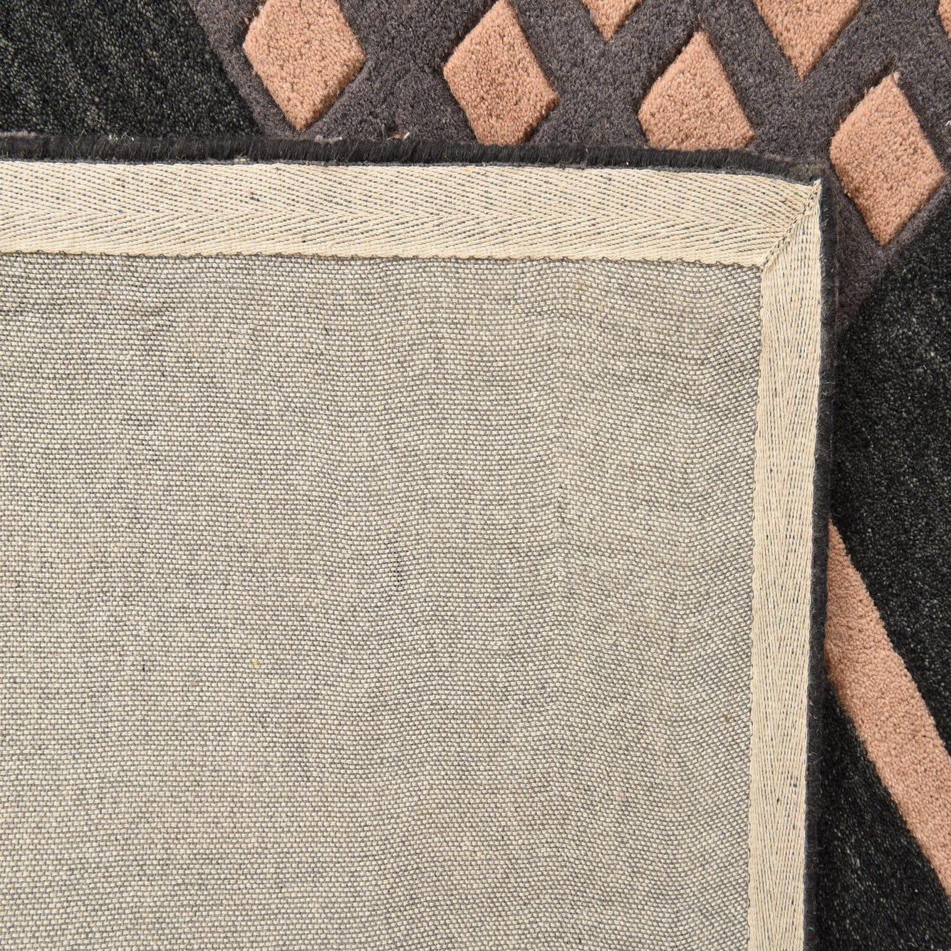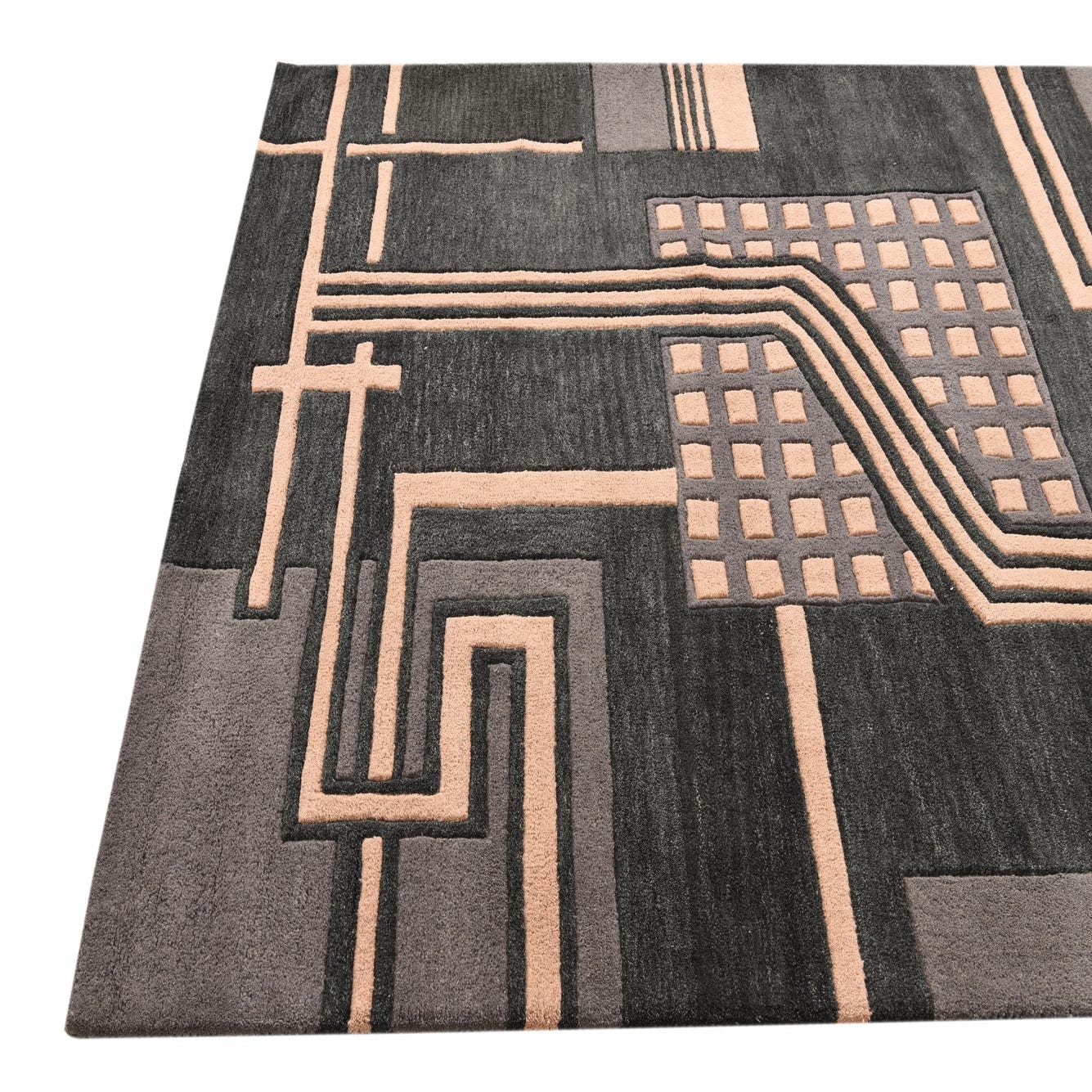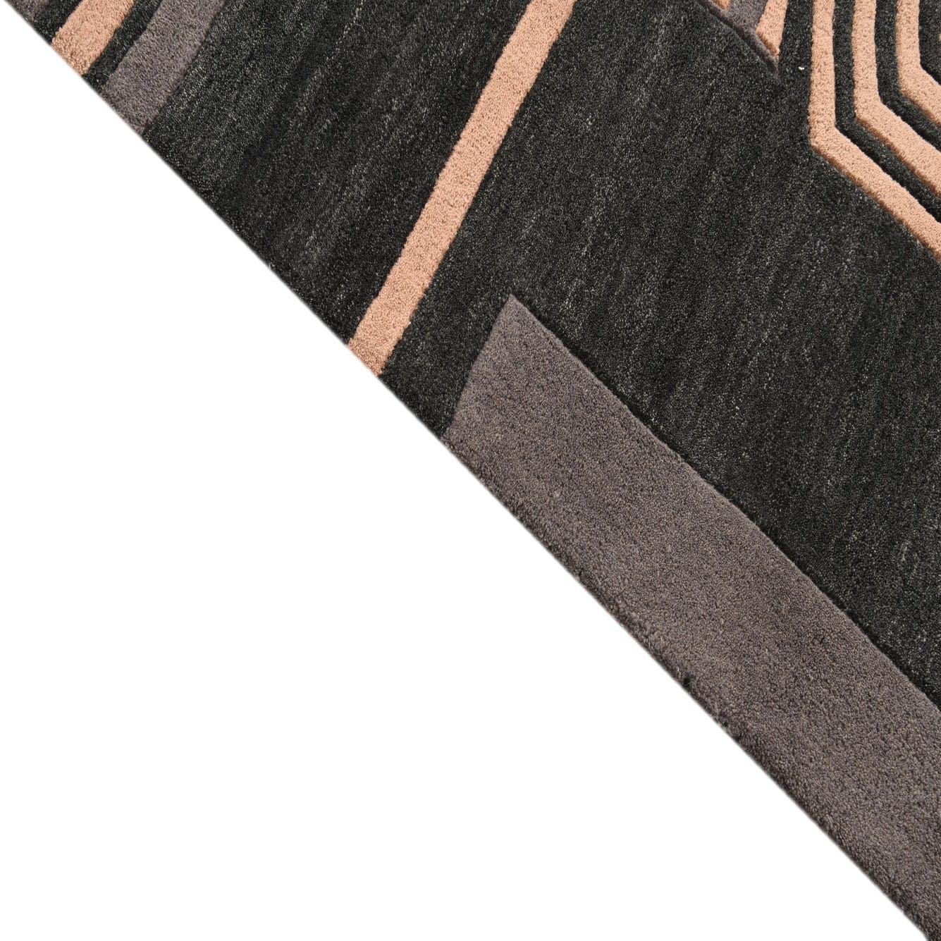 Primary color is Black. Colors in this rug include: Black, Gray, Light Salmon.