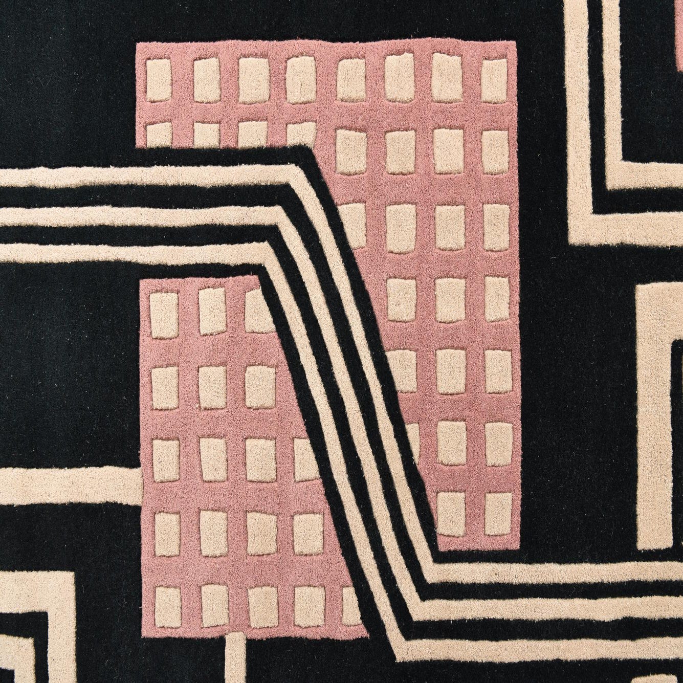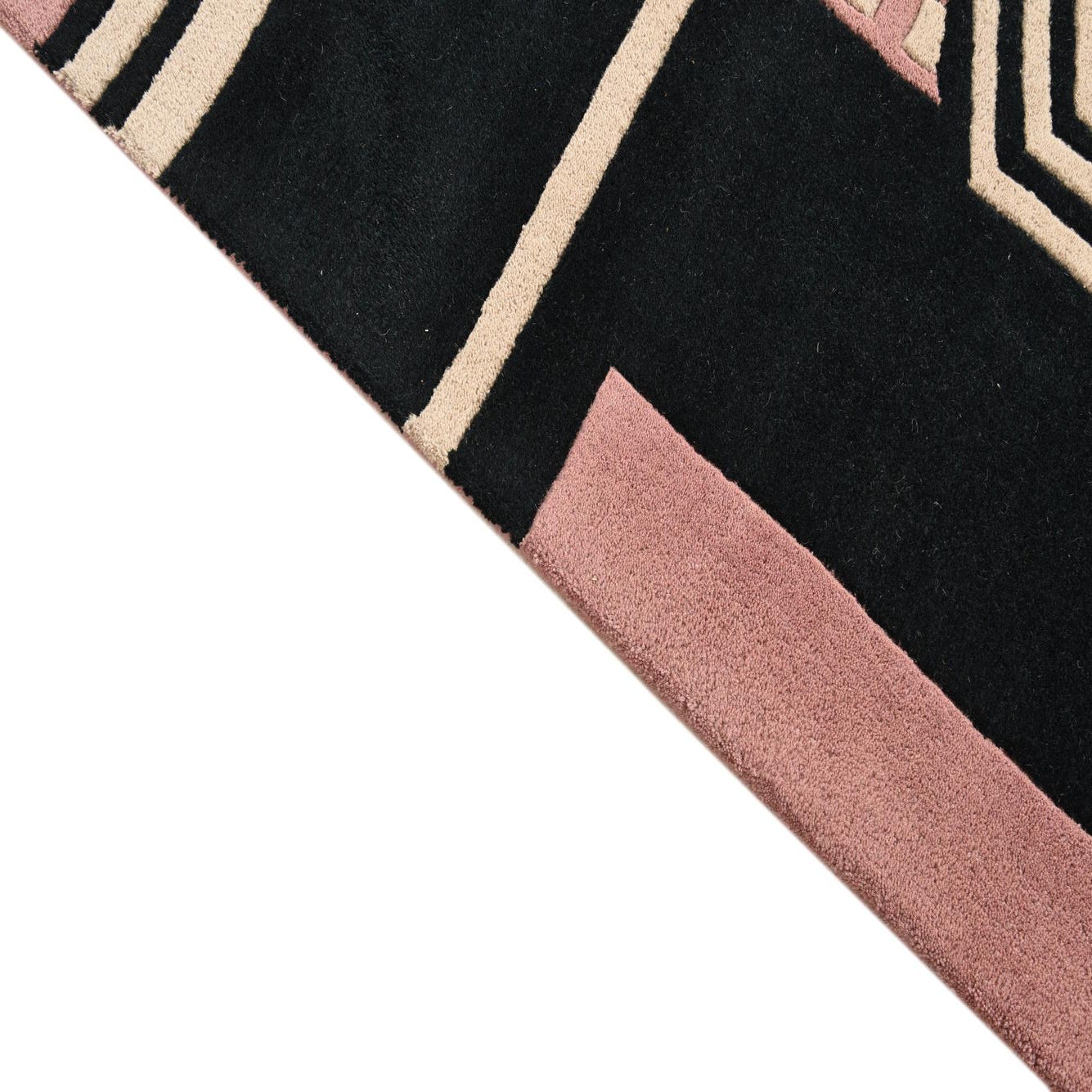 The Luna collection presents a sophisticated hand-tufted rug in a size of 5x8, crafted with a blend of wool and cotton. This piece reveals a modern geometric pattern with a compelling architectural influence showcased in a palette featuring black as the dominant background color, complemented by accents in pink and light salmon. The interplay of linear elements and patterns produces a dynamic visual effect, while the plush texture of the hand-tufted wool offers both comfort and durability.
