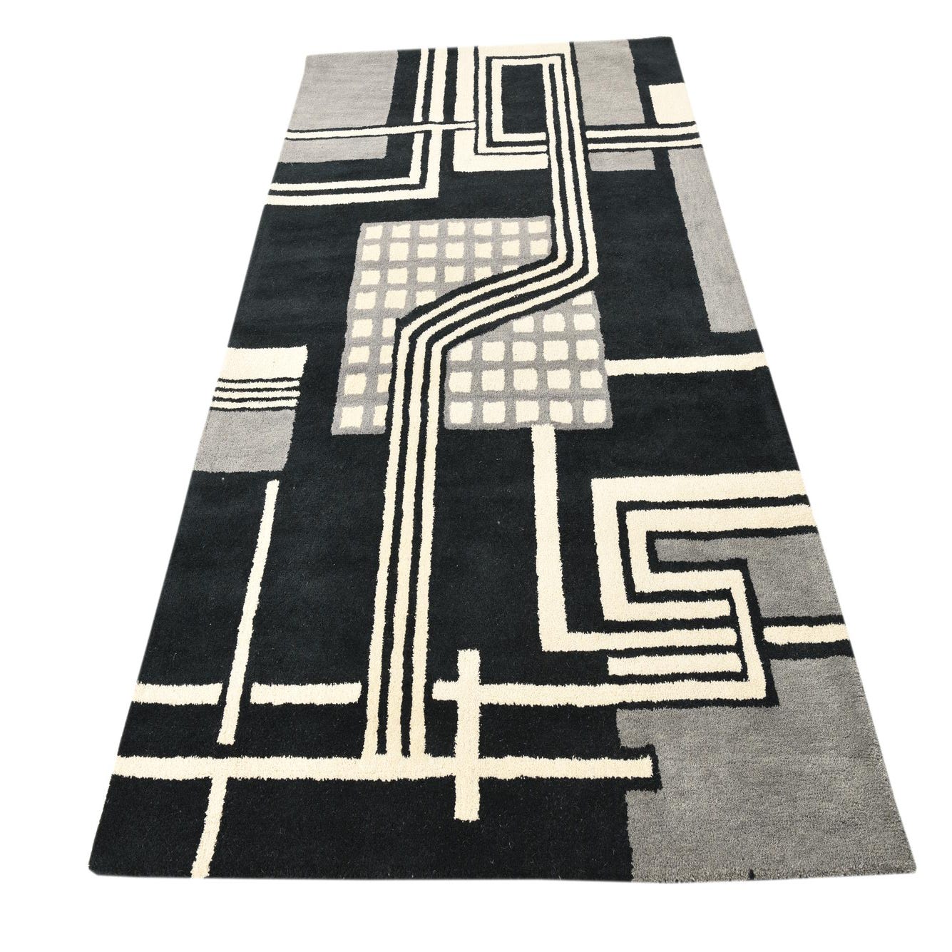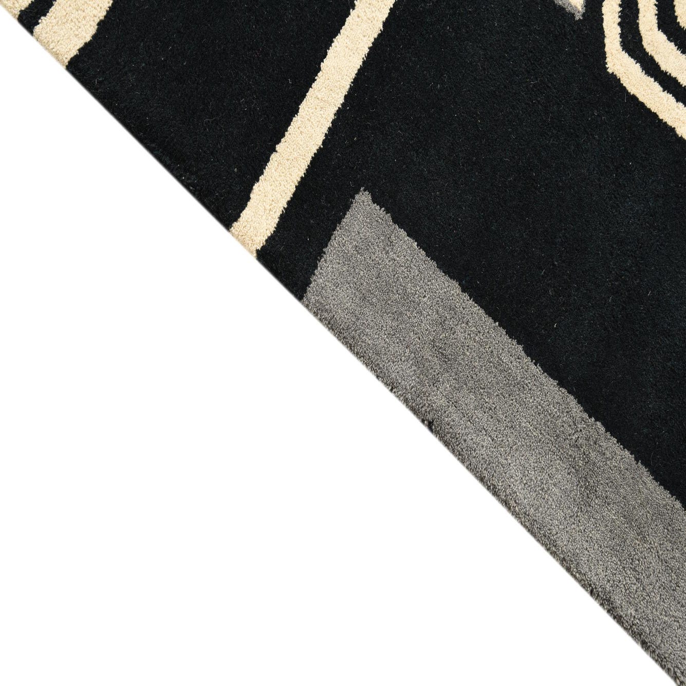 With its deep black background, this rug makes a statement and serves as a grounding element in any space it occupies. Its color scheme and contemporary design allow for versatility in interior design scenarios, making it an ideal choice for modern living rooms, minimalist offices, or even eclectic gallery-like spaces where it can combine with artful decor to further accentuate its graphic qualities.