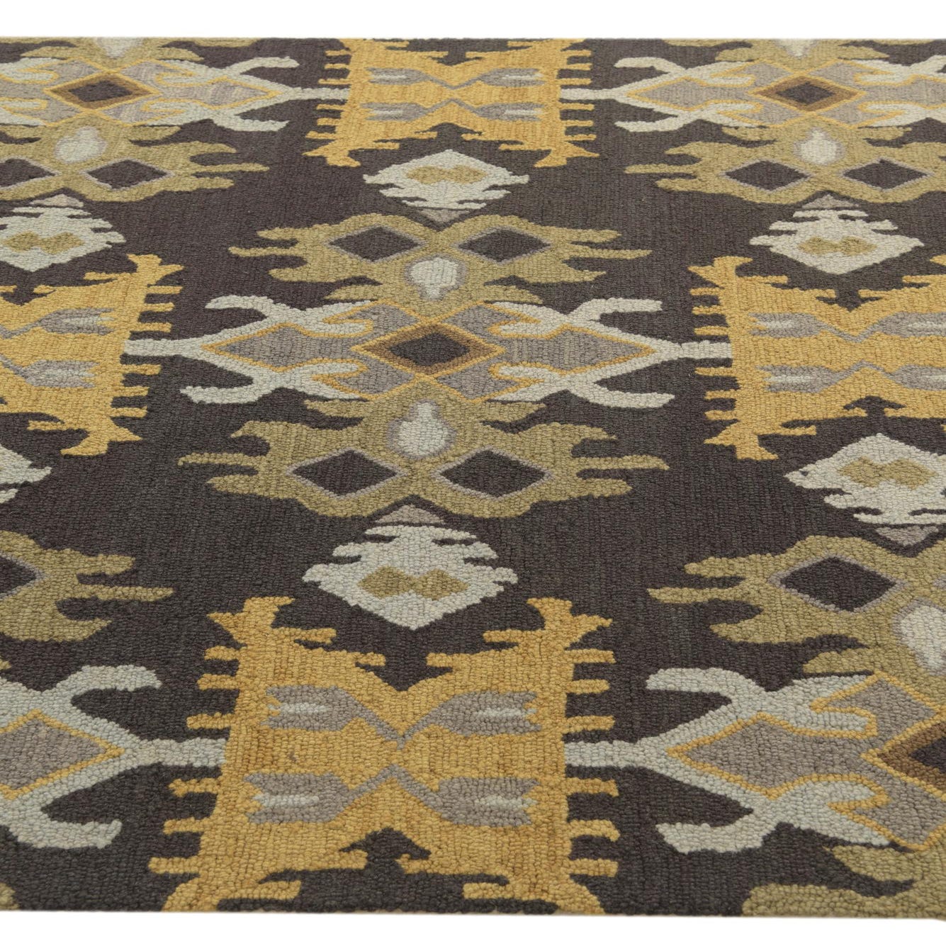 A 5x8 rectangular black wool rug with a high pile, featuring a modern abstract pattern in mustard yellow, light grey, and tan.