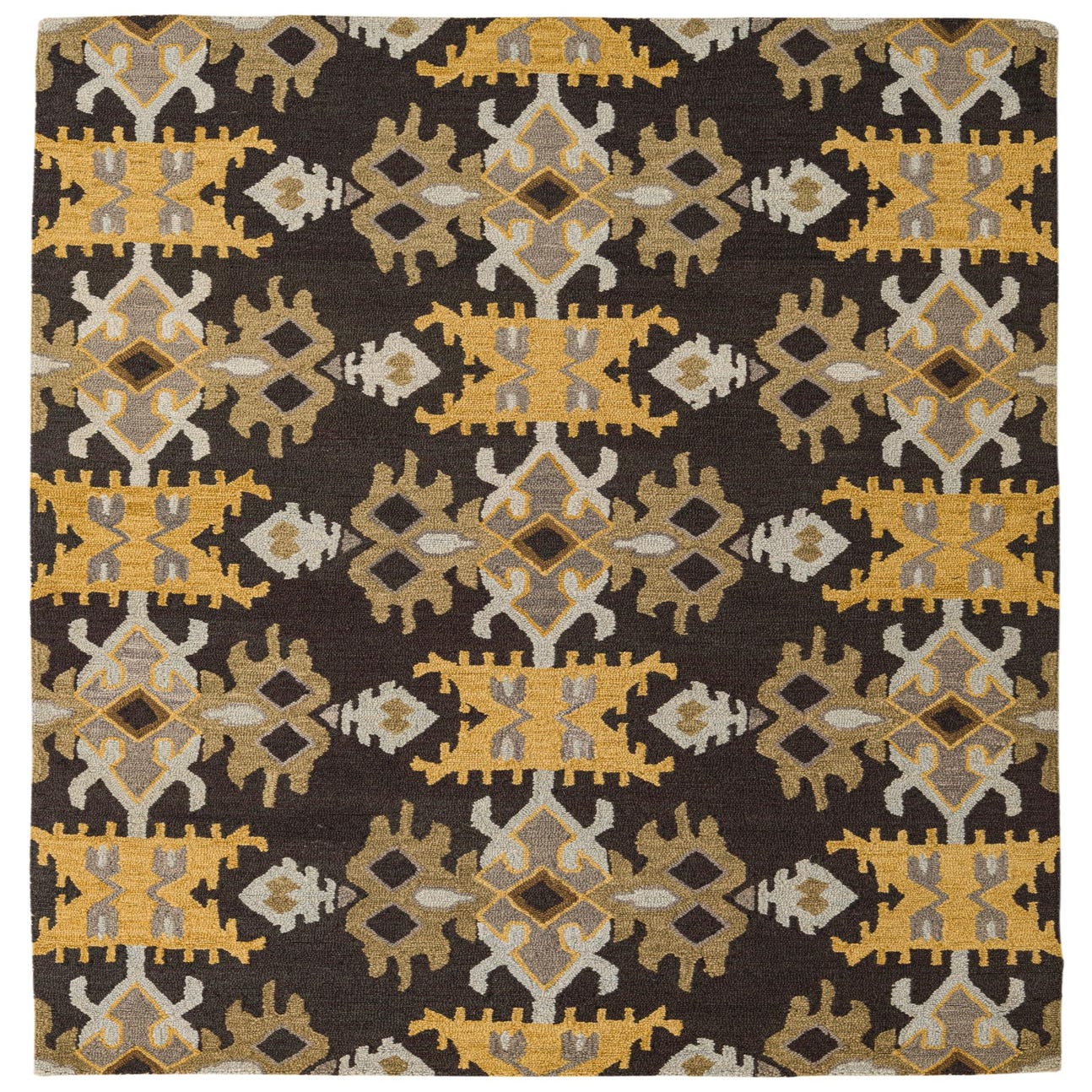 Primary color is Black. Colors in this rug include: Black, Gold, Gray, Ivory, Olive, Light Blue.