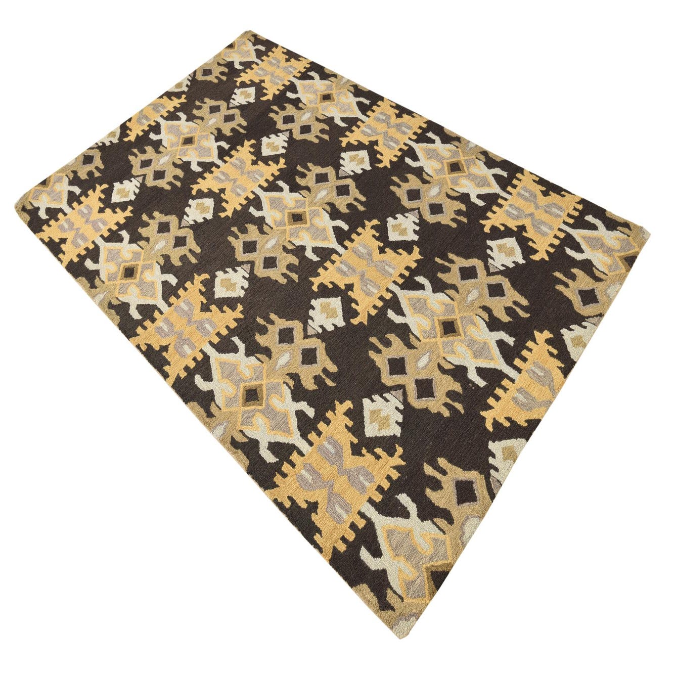 A 5x8 rectangular black area rug with a high pile, featuring an abstract geometric pattern in mustard yellow, light gray, and beige.
