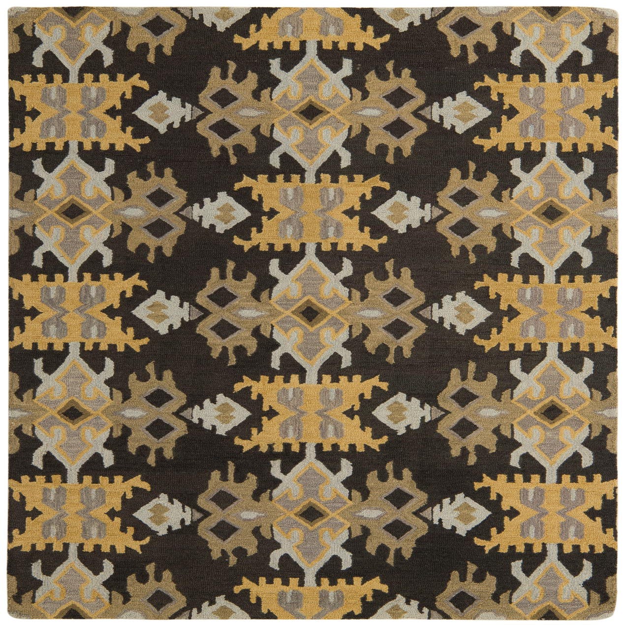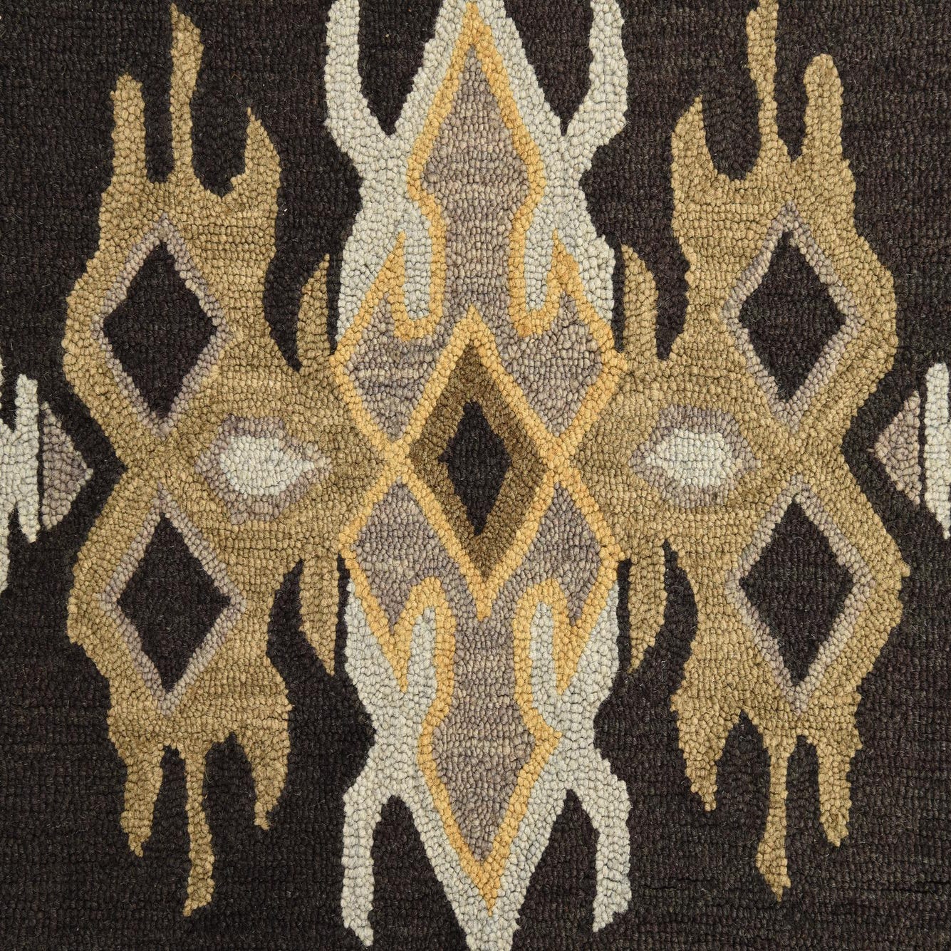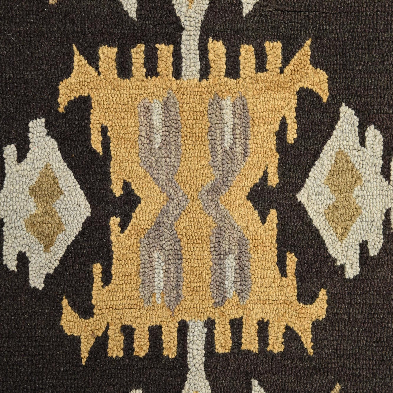 Primary color is Black. Colors in this rug include: Black, Light Blue, Light Brown, Gold, Gray.