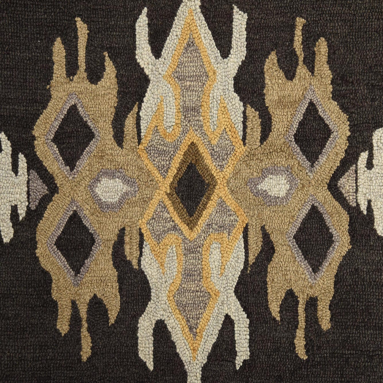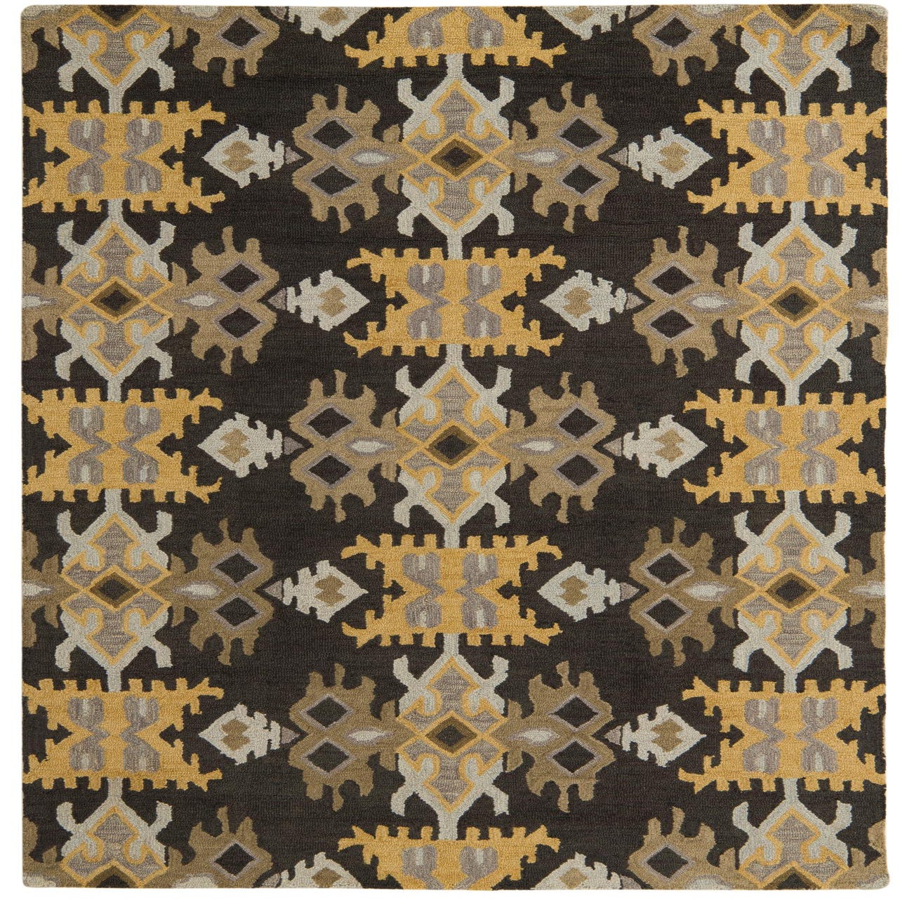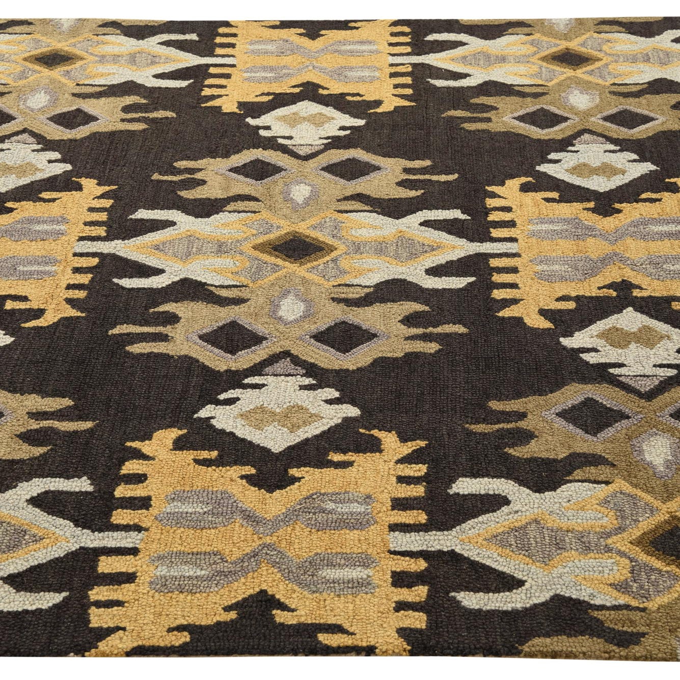 A 5x8 rectangular black area rug with a bold, repeating geometric pattern in mustard yellow, light gray, and brown tones.