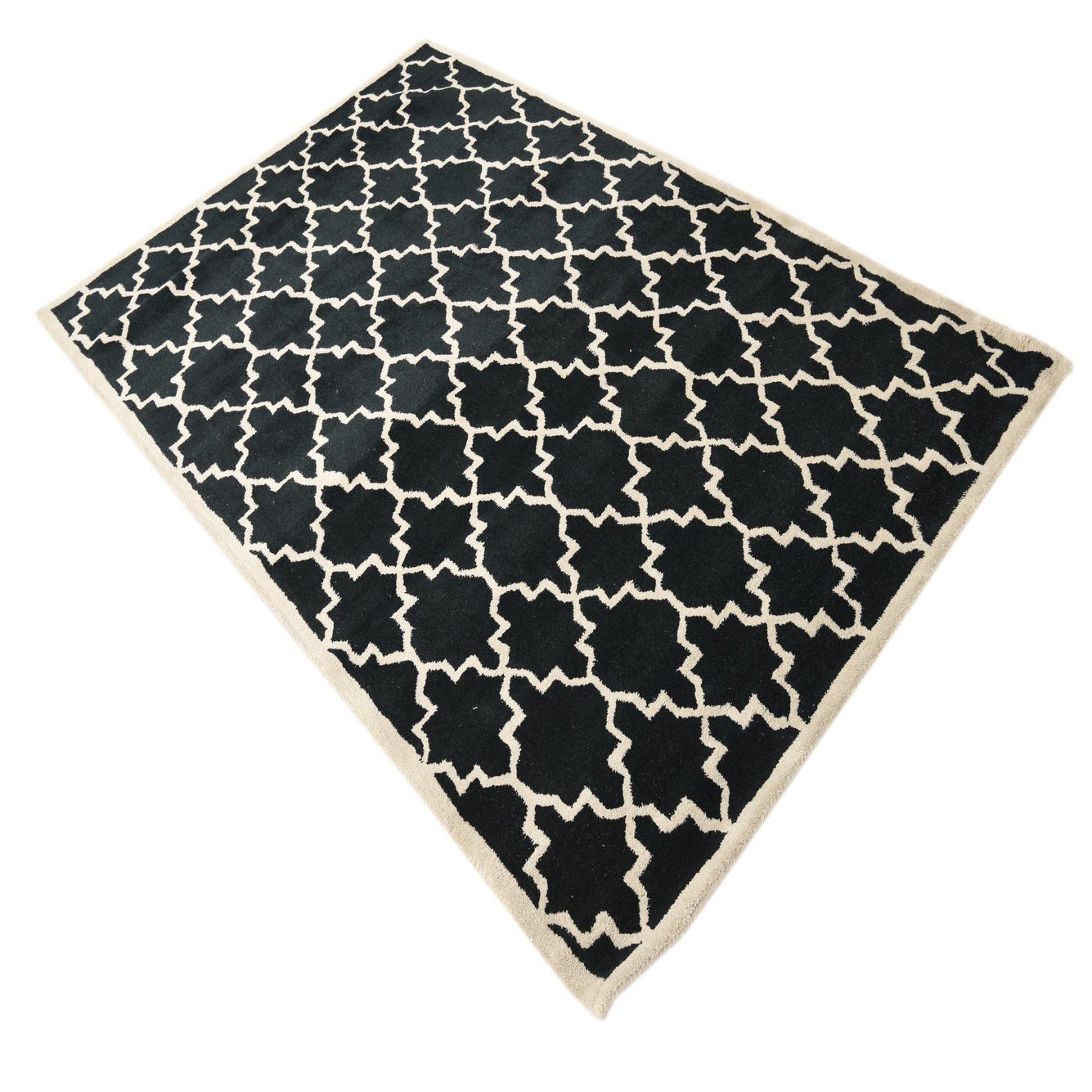 A 5x8 rectangular black wool rug with a high pile and a light beige modern trellis pattern, suitable for an indoor living room.