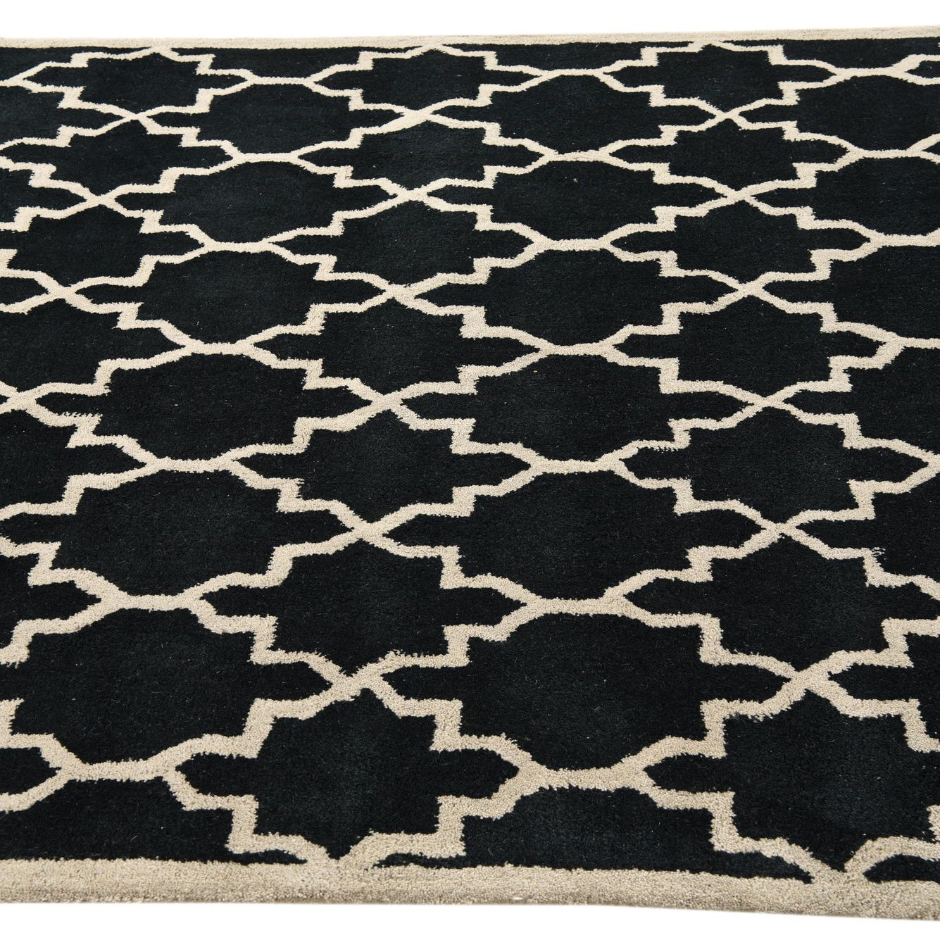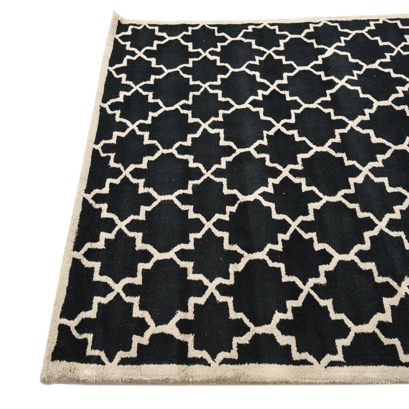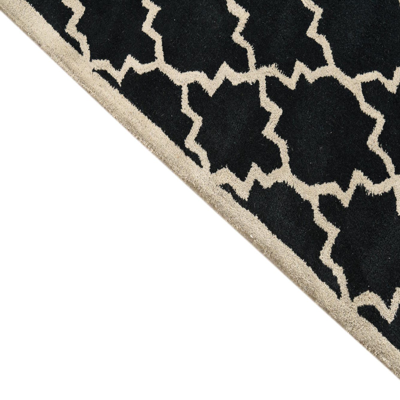 A graphic Moroccan-inspired trellis pattern in ivory sits sharply against a deep black field, creating a clear, rhythmic repeat that balances classic geometry with modern contrast. Hand-tufted from 100% wool, the rug has a soft, dense pile that feels welcoming underfoot while maintaining crisp definition between the dark background and the lighter motif. The slightly raised texture of the wool adds subtle depth without distracting from the overall linear pattern.