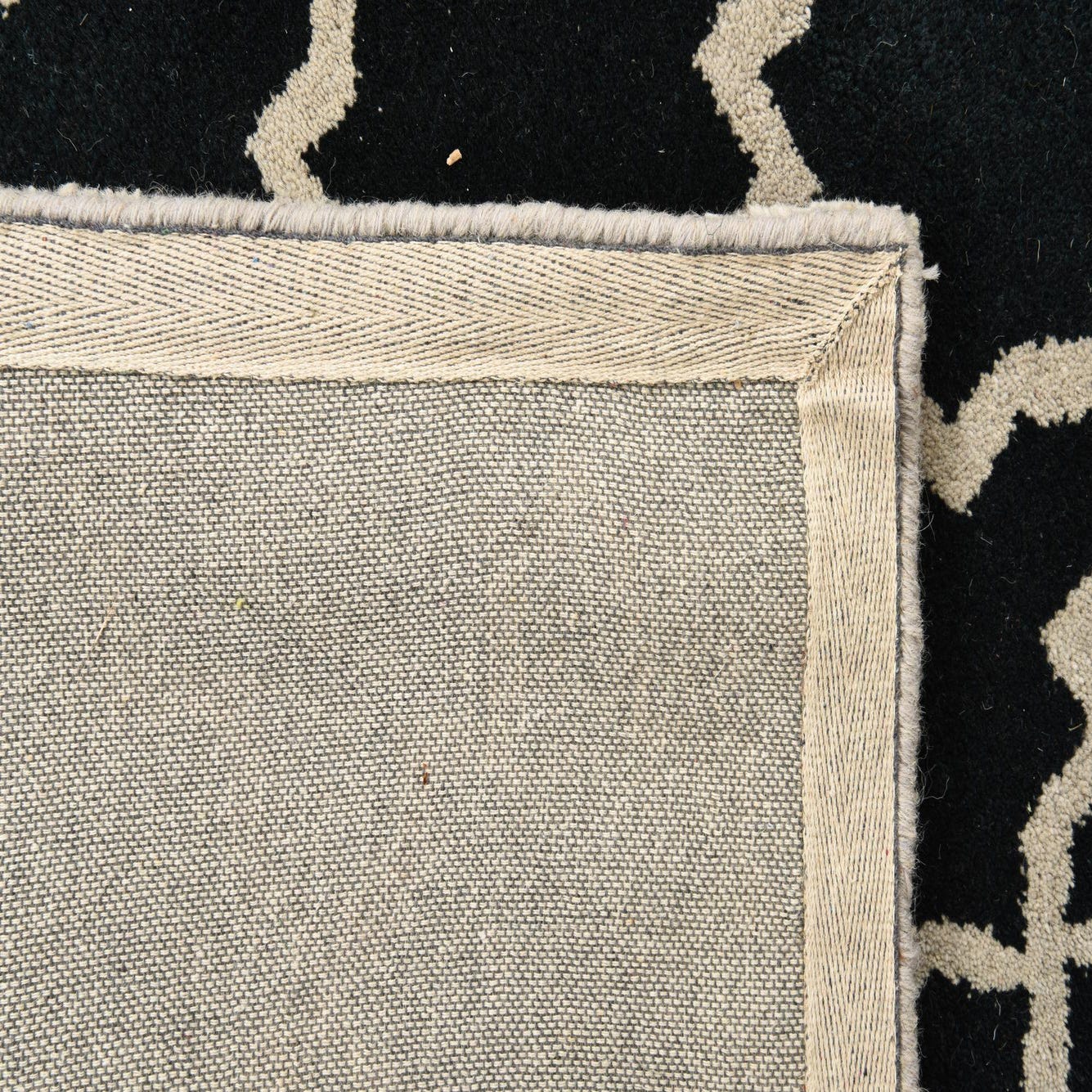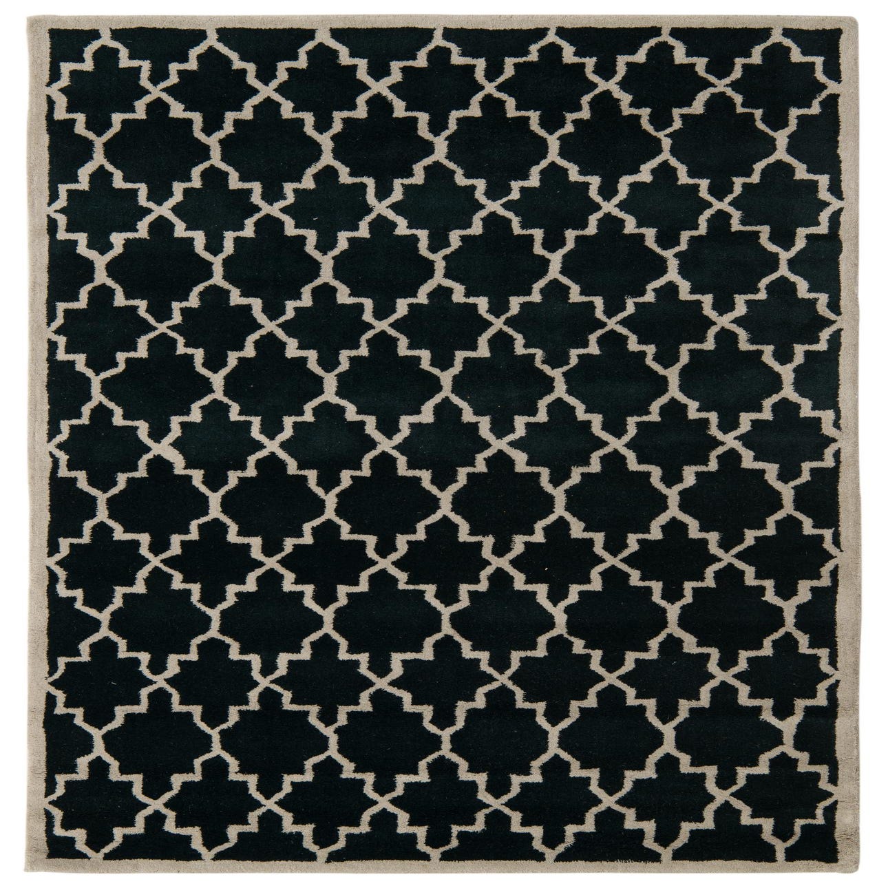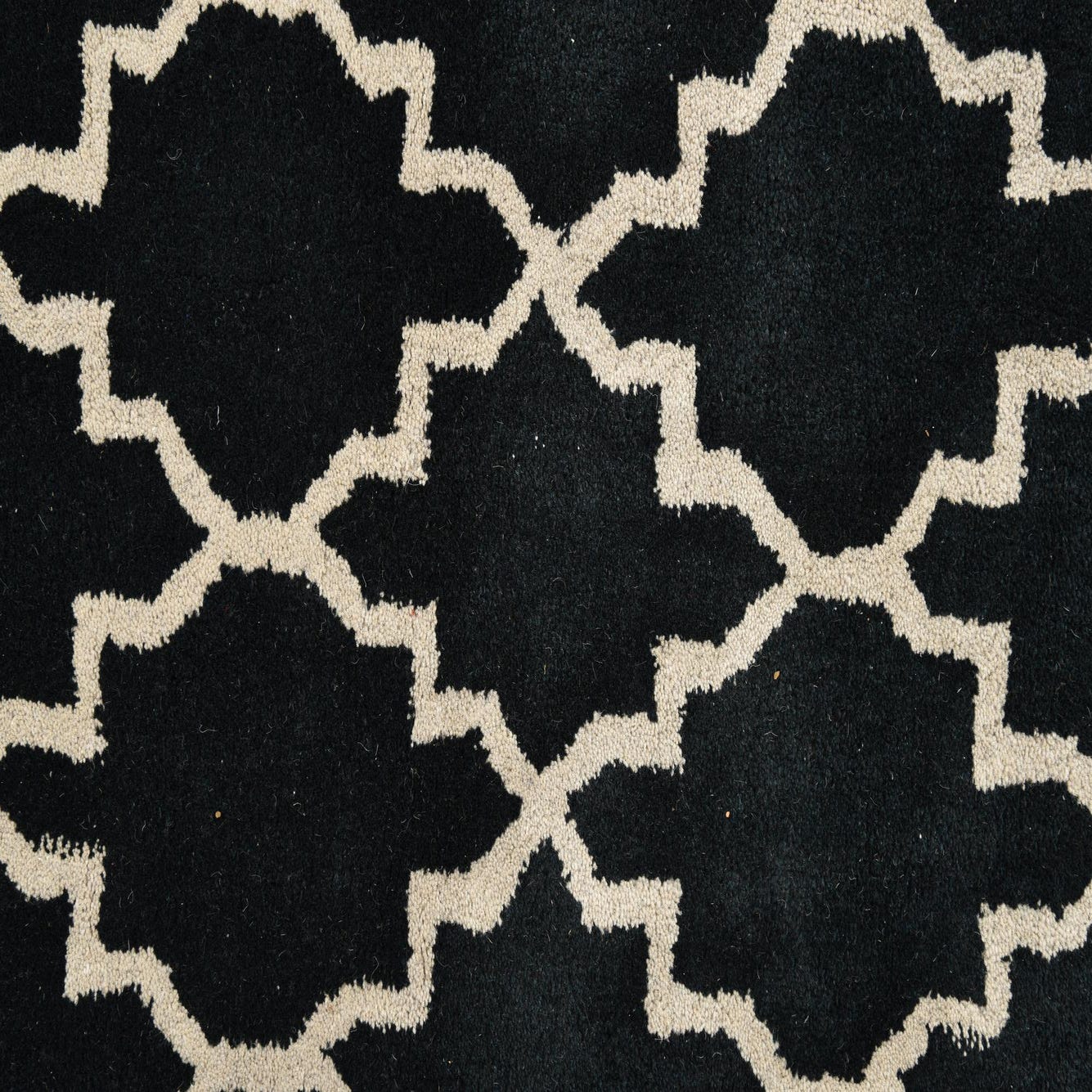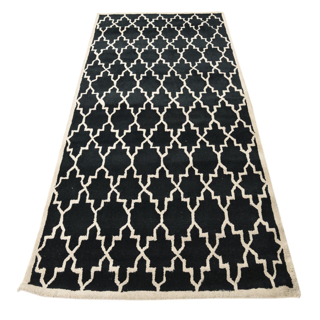 A graphic Moroccan-inspired trellis pattern in ivory sits sharply against a deep black field, creating a clear, rhythmic repeat that balances classic geometry with modern contrast. Hand-tufted from 100% wool, the rug has a soft, dense pile that feels welcoming underfoot while maintaining crisp definition between the dark background and the lighter motif. The slightly raised texture of the wool adds subtle depth without distracting from the overall linear pattern.