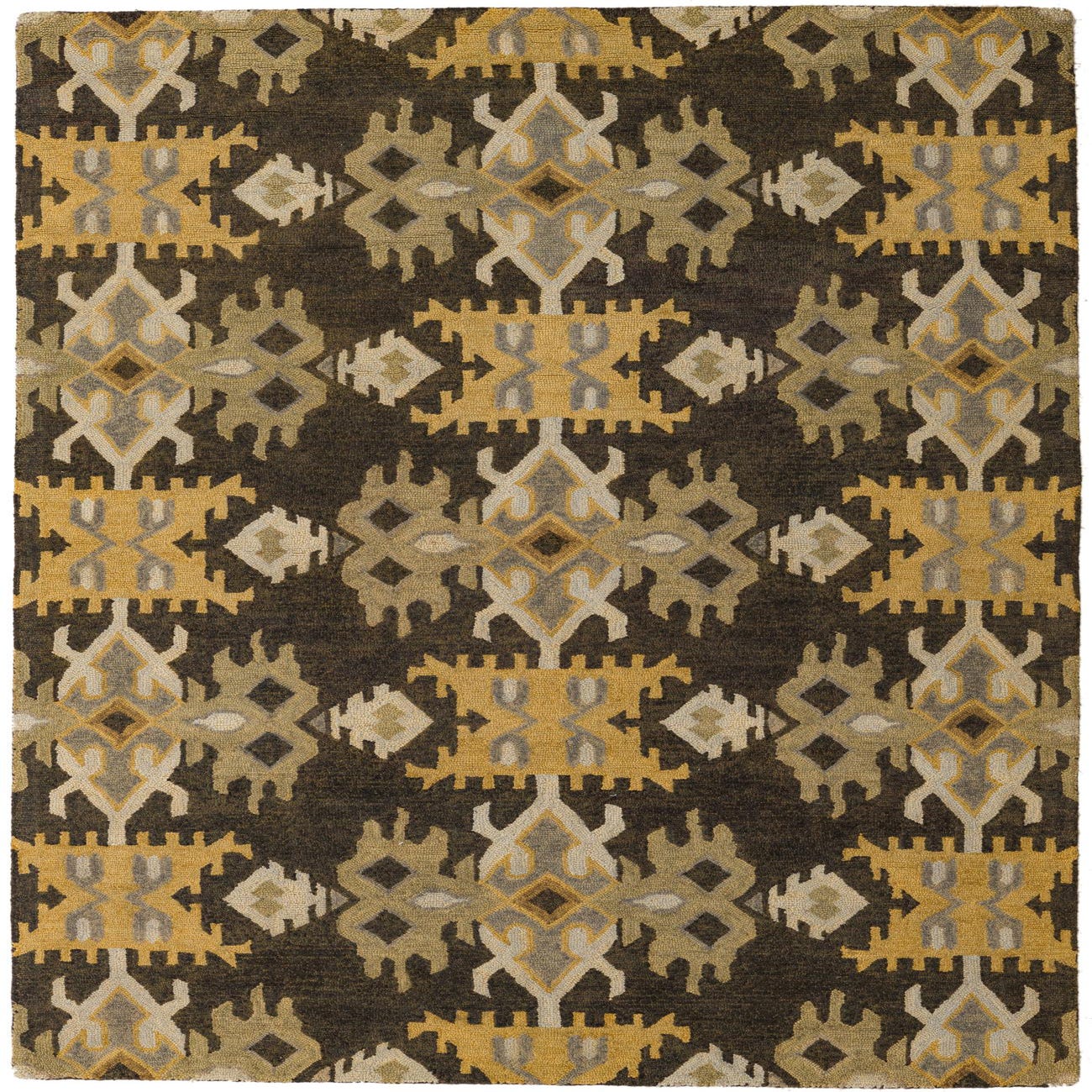Primary color is Black. Colors in this rug include: Black, Gold, Gray, Ivory, Olive.