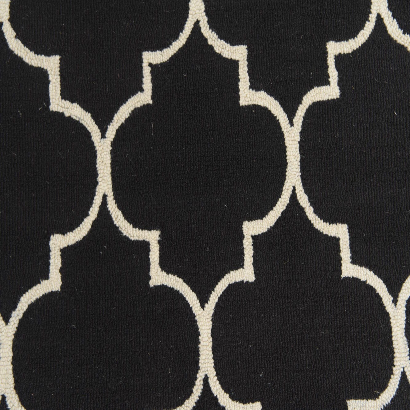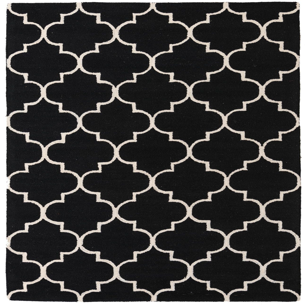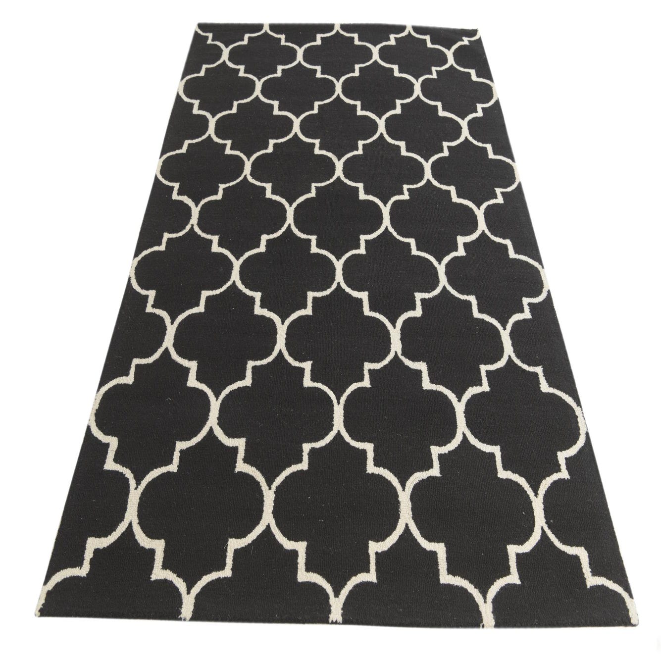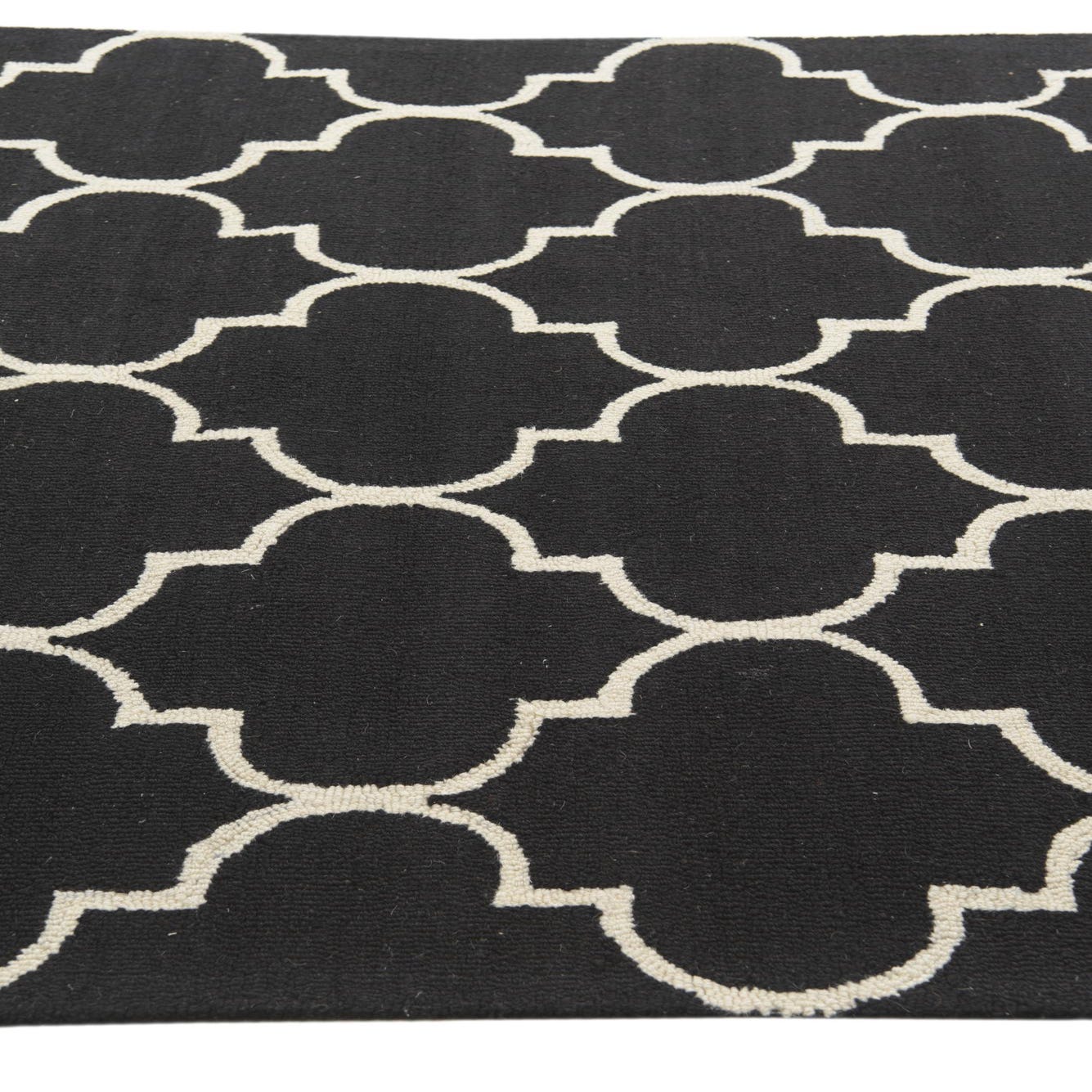 A 5x8 rectangular black wool rug with a repeating white modern abstract quatrefoil pattern, ideal for a living room or bedroom.