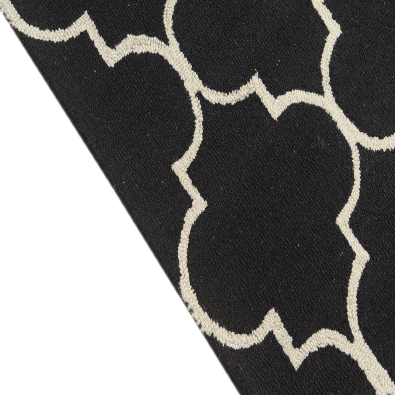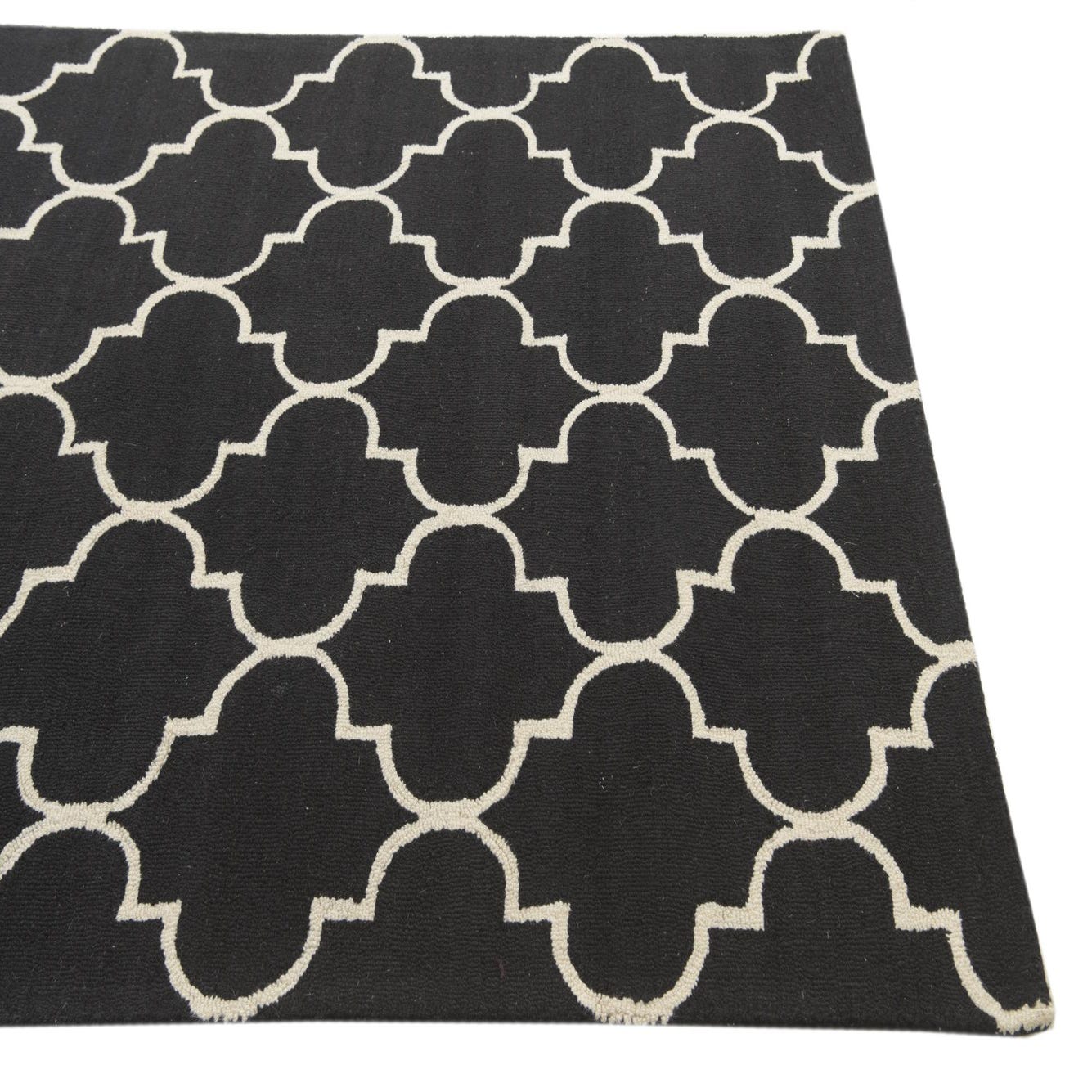 The Luna Collection 5x8 rug is a hand-tufted piece constructed from 100% wool, ensuring both durability and a soft, plush texture that is comfortable underfoot. This rug features a bold, black background with a contrasting ivory pattern. The design showcases a traditional trellis motif, offering a touch of elegance and symmetry to any space it inhabits.