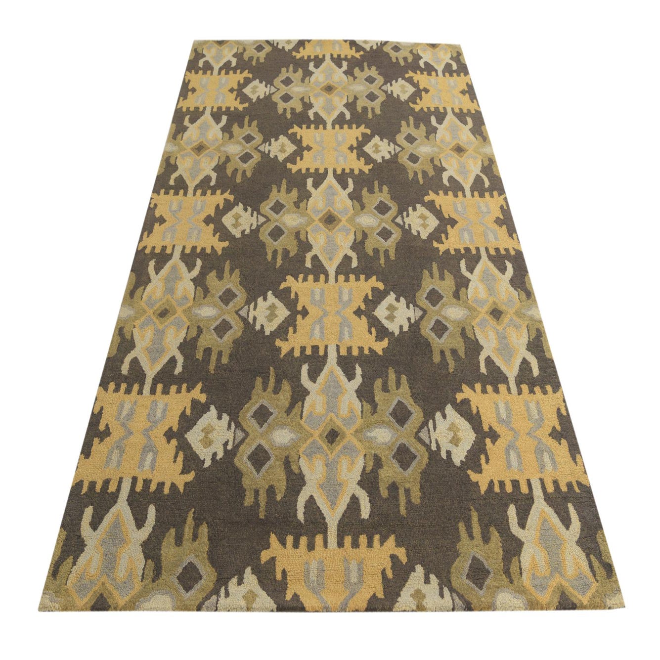 A 5x8 rectangular black rug with a modern abstract pattern in mustard yellow, light gray, and olive green, suitable for a living room.