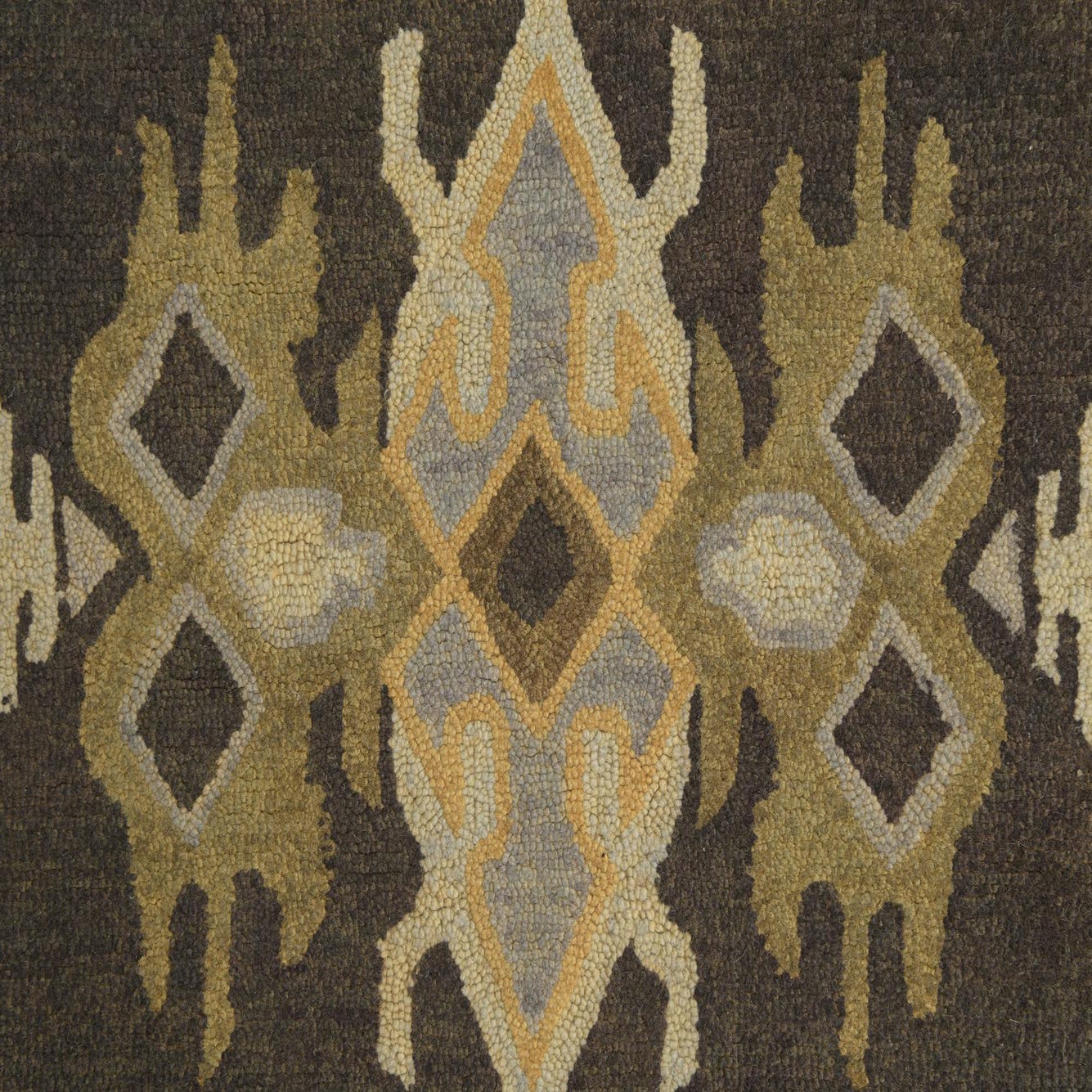 The Luna Collection 5x8 rug is hand-tufted from 100% wool, offering a luxuriously plush pile and durability suited for high-traffic areas. Featured in a striking black background, this rug showcases a bold pattern with geometric motifs in shades of yellow, olive, gray, and ivory, creating a dynamic and engaging visual effect.