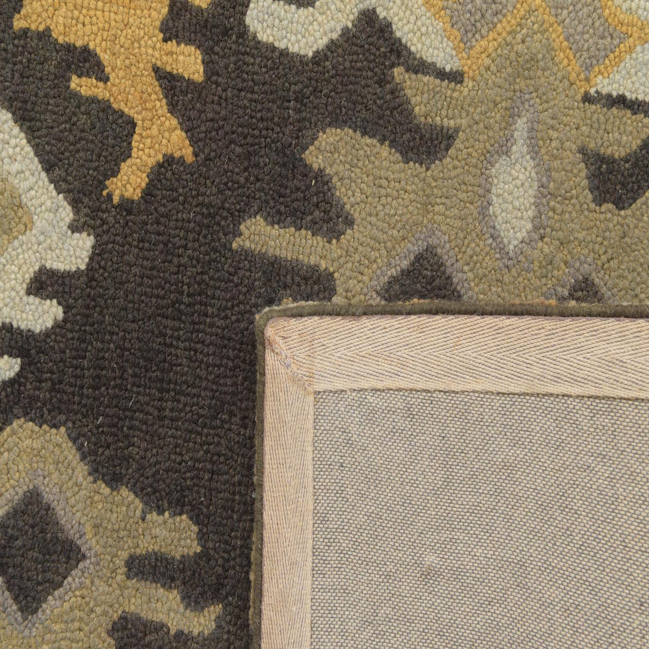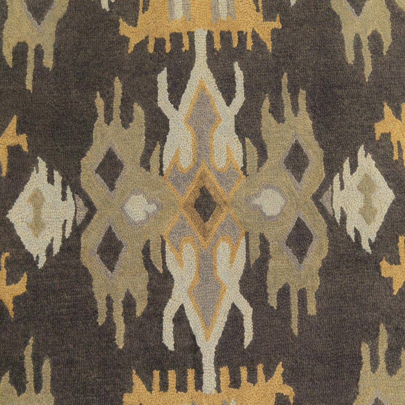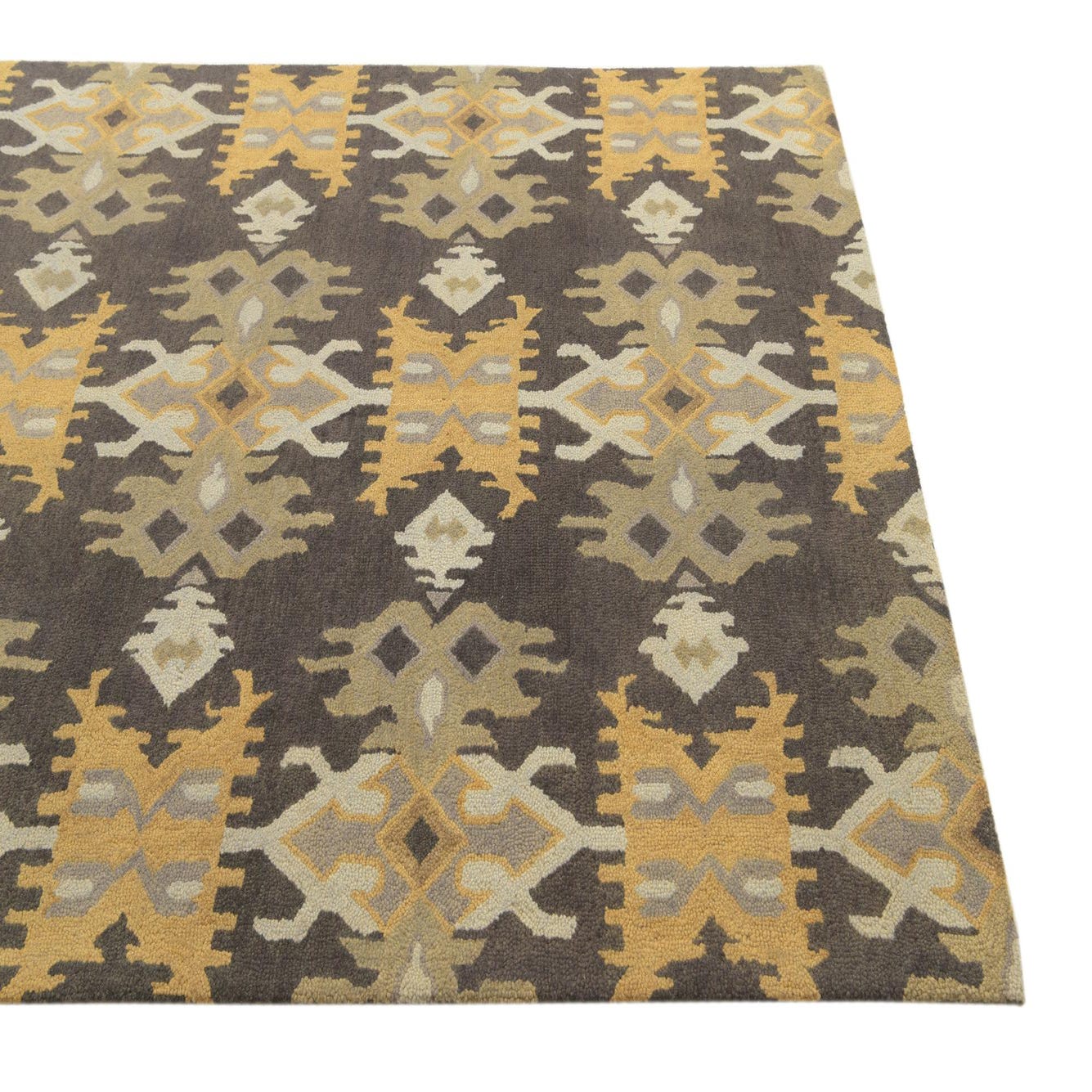 The Luna Collection offers a hand-tufted 100% wool rug with a 5x8 dimension that brings both comfort and contemporary style to interiors. This rug showcases a bold geometric pattern with a rich black background, layered with accents in light brown, yellow, and light blue. The variety and contrast of hues offer versatility in styling, making this piece suitable for a range of decor schemes.
