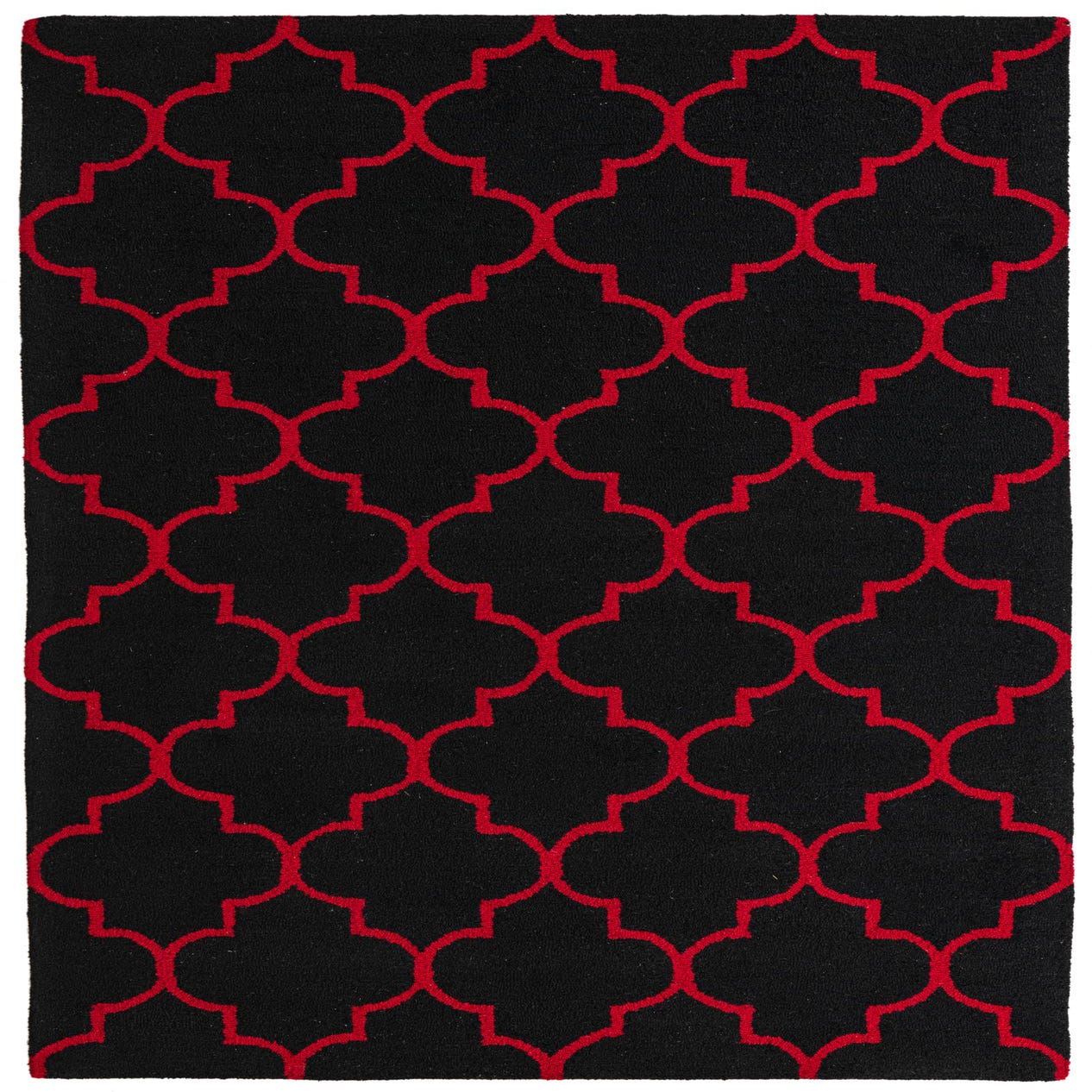 A 5x8 rectangular black wool rug with a bold red modern abstract quatrefoil pattern, perfect for a living room.