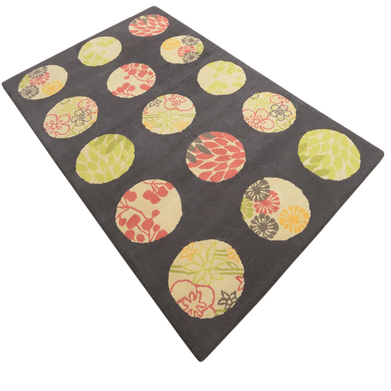 A 5x8 rectangular black wool rug featuring a modern abstract design of large, colorful polka dots with floral and leaf patterns.