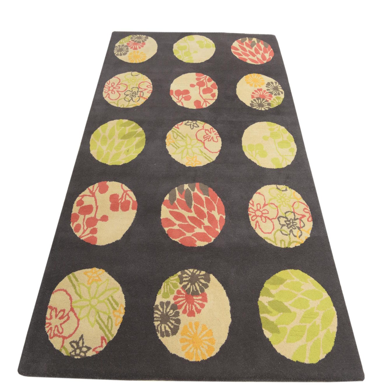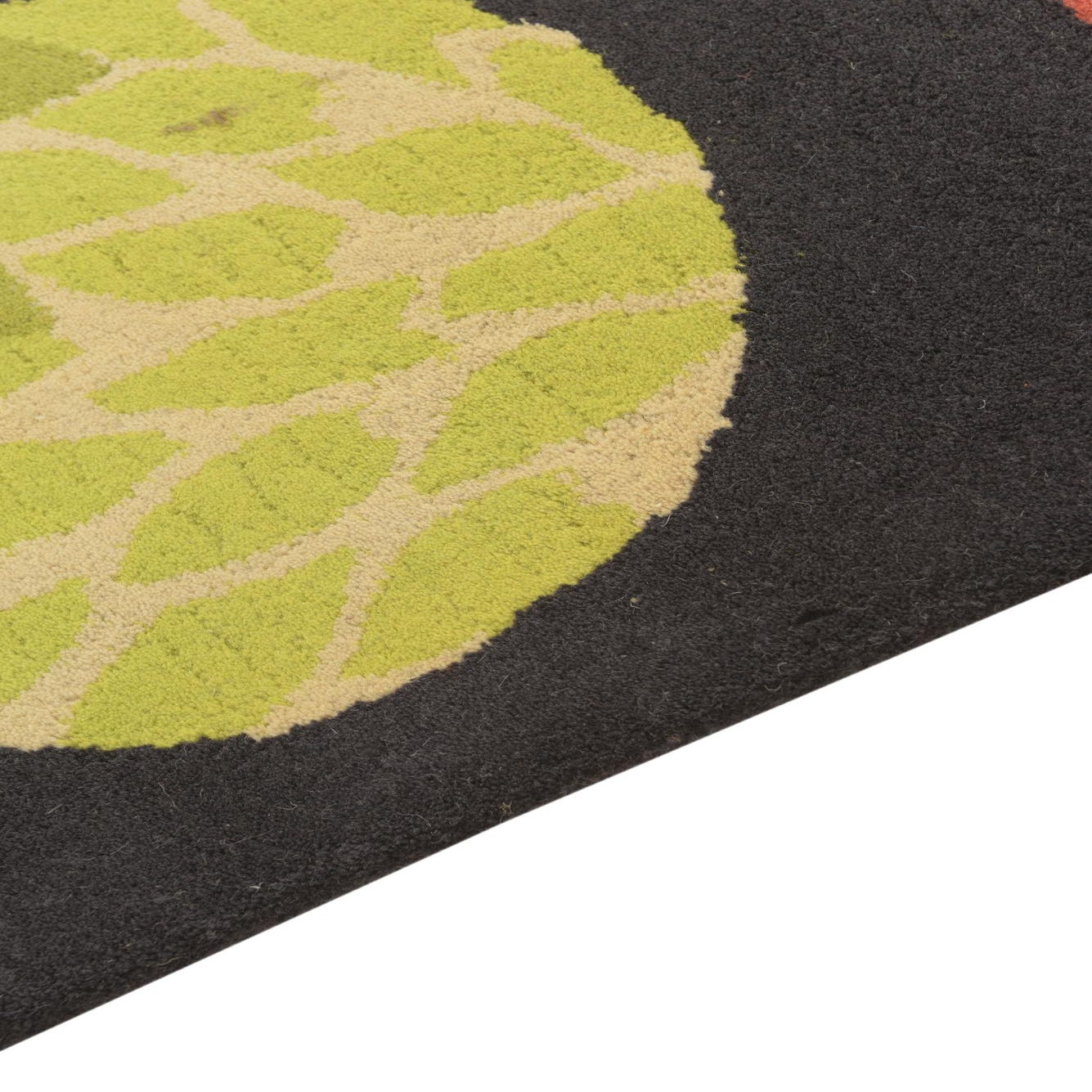 The Luna collection rug is a 5x8 hand-tufted piece crafted from 100% wool, offering durability alongside a plush texture. It features a striking pattern of colorful botanical motifs encased in harmonious circles against a deep black background. The palette includes pops of orange, yellow, light green, and olive, all of which are vivid yet tastefully balanced to enhance the visual appeal of this rug. The creative placement of the circles adds a sense of rhythm and contemporary flair to the design.