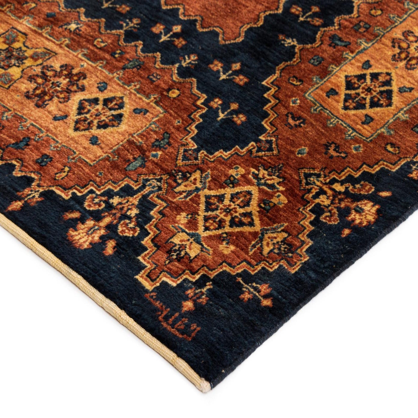 The rug's dense texture is a testament to its hand-made construction, providing both comfort underfoot and durability for high-traffic areas. Its pattern and palette lend themselves well to various decor settings, from traditional spaces seeking a touch of sophistication to modern environments looking for a grounded element.