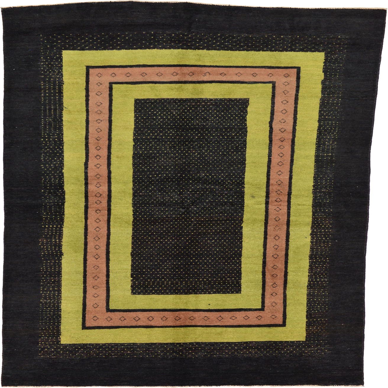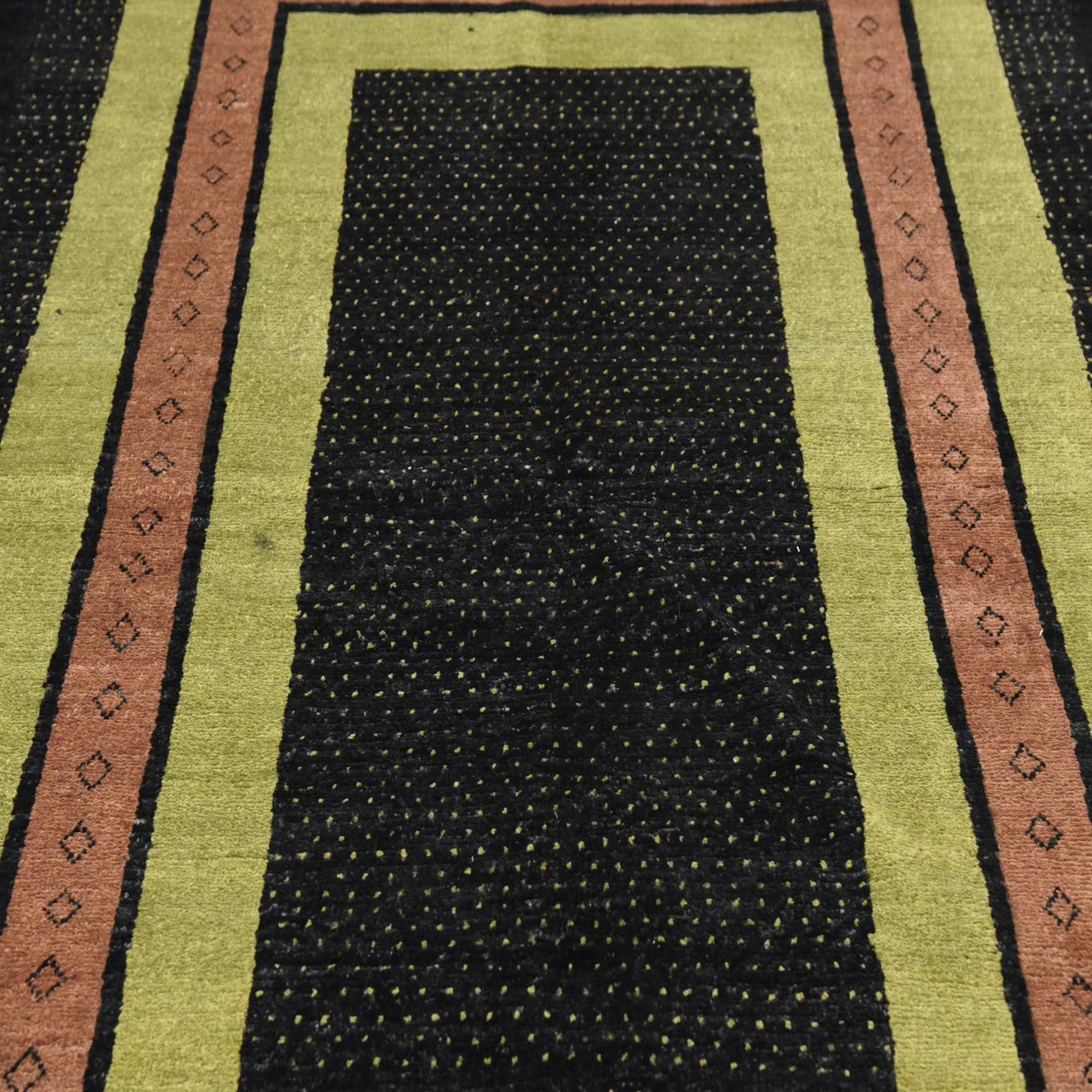 A 5x8 rectangular Modern Ziegler rug featuring a black field with a lime green and rust-colored geometric border.