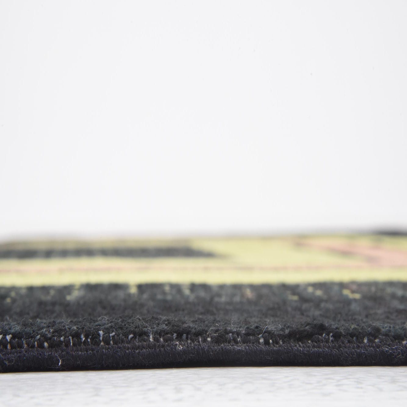 Primary color is Black. Colors in this rug include: Black, Green, Salmon.